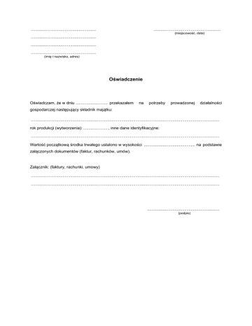 ............................................................. ............................................................... (miejscowość, data) ............................................................. ............................................................. ............................................................. (imię i nazwisko, adres) Oświadczenie Oświadczam, że w dniu .............................. przekazałem na potrzeby prowadzonej działalności gospodarczej następujący składnik majątku: ................................................................................................................................................................................. rok produkcji (wytworzenia): ....................... , inne dane identyfikacyjne: ................................................................................................................................................................................. Wartość początkową środka trwałego ustalono w wysokości ................................................ na podstawie załączonych dokumentów (faktur, rachunków, umów). Załącznik: (faktury, rachunki, umowy) ................................................................................................................................................................................. ................................................................................................................................................................................. .................................................................... (podpis)
