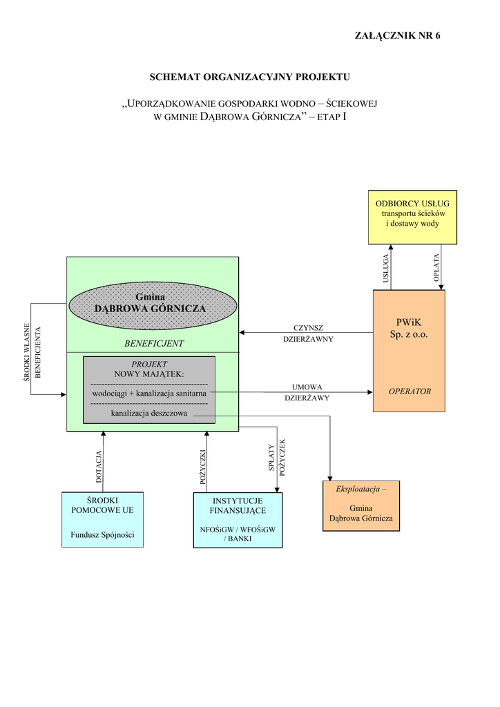 ZAŁĄCZNIK NR 6 SCHEMAT ORGANIZACYJNY PROJEKTU „UPORZĄDKOWANIE GOSPODARKI WODNO – ŚCIEKOWEJ W GMINIE DĄBROWA GÓRNICZA” – ETAP I USŁUGA OPŁATA ODBIORCY USŁUG transportu ścieków i dostawy wody PWiK Sp. z o.o. CZYNSZ DZIERŻAWNY BENEFICJENT PROJEKT NOWY MAJĄTEK: -----------------------------------------wodociągi + kanalizacja sanitarna -----------------------------------------kanalizacja deszczowa OPERATOR POŻYCZEK SPŁATY UMOWA DZIERŻAWY POŻYCZKI DOTACJA BENEFICJENTA ŚRODKI WŁASNE Gmina DĄBROWA GÓRNICZA Eksploatacja – ŚRODKI POMOCOWE UE INSTYTUCJE FINANSUJĄCE Fundusz Spójności NFOŚiGW / WFOŚiGW / BANKI Gmina Dąbrowa Górnicza