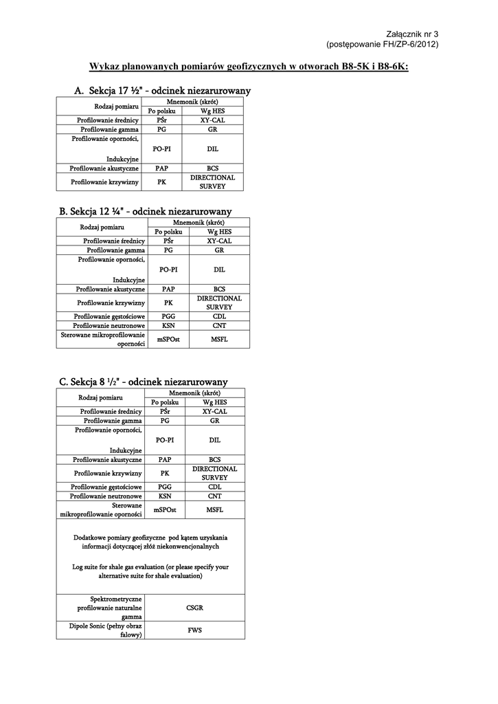Załącznik nr 3 (postępowanie FH/ZP-6/2012) Wykaz planowanych pomiarów geofizycznych w otworach B8-5K i B8-6K: A. Sekcja 17 ½" - odcinek niezarurowany Rodzaj pomiaru Profilowanie średnicy Profilowanie gamma Profilowanie oporności, Mnemonik (skrót) Po polsku Wg HES PŚr XY-CAL PG GR PO-PI DIL Indukcyjne Profilowanie akustyczne PAP Profilowanie krzywizny PK BCS DIRECTIONAL SURVEY B. Sekcja 12 ¼" - odcinek niezarurowany Rodzaj pomiaru Profilowanie średnicy Profilowanie gamma Profilowanie oporności, Mnemonik (skrót) Po polsku Wg HES PŚr XY-CAL PG GR PO-PI DIL Indukcyjne Profilowanie akustyczne PAP Profilowanie krzywizny PK PGG KSN BCS DIRECTIONAL SURVEY CDL CNT mSPOst MSFL Profilowanie gęstościowe Profilowanie neutronowe Sterowane mikroprofilowanie oporności C. Sekcja 8 1/2" - odcinek niezarurowany Rodzaj pomiaru Profilowanie średnicy Profilowanie gamma Profilowanie oporności, Mnemonik (skrót) Po polsku Wg HES PŚr XY-CAL PG GR PO-PI DIL Indukcyjne Profilowanie akustyczne PAP Profilowanie krzywizny PK PGG KSN BCS DIRECTIONAL SURVEY CDL CNT mSPOst MSFL Profilowanie gęstościowe Profilowanie neutronowe Sterowane mikroprofilowanie oporności Dodatkowe pomiary geofizyczne pod kątem uzyskania informacji dotyczącej złóż niekonwencjonalnych Log suite for shale gas evaluation (or please specify your alternative suite for shale evaluation) Spektrometryczne profilowanie naturalne gamma Dipole Sonic (pełny obraz falowy) CSGR FWS Załącznik nr 3 (postępowanie FH/ZP-6/2012) Neutron-induced spectral gamma (ElementalAnalysis Tool) Magnetyczny rezonans jądrowy (NMR) – Magnetic resonance image log GEM MRIL C. Sekcja 6" - odcinek niezarurowany Rodzaj pomiaru Profilowanie średnicy Profilowanie gamma Profilowanie oporności, Mnemonik (skrót) Po polsku Wg HES PŚr XY-CAL PG GR PO-PI DIL Indukcyjne Profilowanie akustyczne PAP Profilowanie krzywizny PK BCS DIRECTIONAL SURVEY SGR CDL CNT MSFL FED/SED Spektrometryczne profilowanie gamma Profilowanie gęstościowe Profilowanie neutronowe Sterowane mikroprofilowanie oporności Profilowanie upadu warstw SPG PGG KSN mSPOst PUW D. Pomiary cementomierzem akustycznym – pomiar typu CASED-HOLE Rodzaj pomiaru Cementomierz akustyczny Mufolokator Profilowanie gamma Cementomierz akustyczny Mufolokator Profilowanie gamma Cementomierz akustyczny Mufolokator Profilowanie gamma Mnemonik (skrót) Po polsku Wg HES Pomiar w rurach 13 3/8" PAC CBL CCL PG GR Pomiar w rurach 9 5/8" PAC CBL CCL PG GR Pomiar w rurach 7" PAC CBL CCL PG GR E. Profilowanie średnich prędkości Rodzaj pomiaru Profilowanie średnich prędkości Mnemonik (skrót) Po polsku Wg HES PPS VSP * W przypadku podjęcia decyzji o wierceniu drugiego z planowanych otworów jako otworu pionowego koniecznie należy zaplanować wykonanie: a. pomiarów prędkości średnich (PPS) b. pionowe profilowanie sejsmiczne zero offsetowe (VSP).