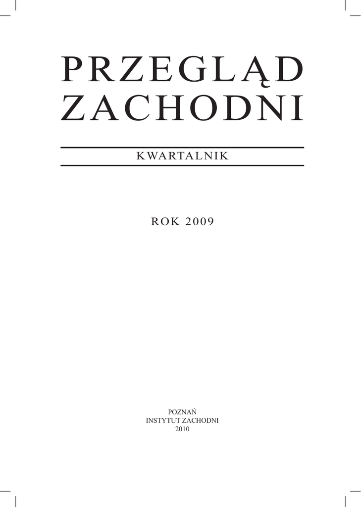 PRZEGLĄD ZACHODNI K WA RTA L N I K ROK 2009 POZNAŃ INSTYTUT ZACHODNI 2010 Spis treści za rok 2009 Priorytety polskiej polityki zagranicznej Cichocki Marek A., Polskie strategie w Europie …………………………………… Czaputowicz Jacek, Polityka zagraniczna Polski przełomu 1989 roku ………… Grodzki Radosław, Polska polityka wschodnia w okresie koabitacji po 2007 roku . Kiwerska Jadwiga, Wymarzony sojusznik Polski ………………………………… Kosman Marceli, W cieniu tradycji, fobii i nie zawsze kompetencji ……………… Lasoń Marcin, Próba bilansu zaangażowania Polski w interwencję zbrojną i proces stabilizacji Iraku w latach 2003-2008 ……………………………………………… Niedźwiecki Artur, Polityka Polski wobec Unii Europejskiej po wyborach w 2007 roku. Próba oceny ………………………………………………………… Nowosielski Michał, O strategii promocji Polski ……………………………… Podgórzańska Renata, Stosunki Polski z niepodległą Macedonią ……………… Ruszel Mariusz, Bezpieczeństwo energetyczne priorytetem polskiej polityki wobec Litwy i Ukrainy …………………………………………………………………… Sakson Andrzej, Perspektywy polsko-niemieckiej współpracy ……………………… W ę c Janusz J., Relacje polsko-niemieckie w Unii Europejskiej. Między współpracą a konfliktem interesów……………………………………………………………… Zając Justyna, Bandwagoning w polskiej polityce zagranicznej ……………………… Zięba Ryszard, Czy w stosunkach polsko-rosyjskich możliwe jest przejście od „polityki historycznej” do „polityki perspektywicznej”? ……………………… Nr 3 3 3 3 3 Str. 3 16 31 56 67 3 77 3 3 3 94 106 112 3 3 138 144 3 3 146 168 3 179 2 4 91 101 3 1 191 83 1 199 2 77 3 231 2 33 ARTYKUŁY Bachórz Agata, Wielka Wojna Ojczyźniana we współczesnej rosyjskiej kinematografii. O nośnikach pamięci zbiorowej …………………………………………………… Balisz Justyna, Artyści a historia. Kilka uwag o recepcji faszyzmu w sztuce niemieckiej… Cichocki Piotr, Jabkowski Piotr, Poczucie związku z Unią Europejską w nowych krajach członkowskich Europy Środkowo-Wschodnie …………………………… Czyżewski Jarosław, Dzieci żołnierze we współczesnych konfliktach zbrojnych …… Fiedler Radosław, USA wobec konfliktu izraelsko-palestyńskiego 1991-2008. Instrumenty, możliwości, błędy i ograniczenia amerykańskiego mediatora ……… Górczyńska–Przybyłowicz Bożena, Prześladowania i zagłada Żydów pod rządami nazistów w Kraju Warty …………………………………………………………… Hryniewicz Janusz T., Polityka wielokulturowości i imigranci. Doświadczenia państw europejskich i wnioski dla Polski…………………………………………………… Janicki Tadeusz, Niemiecka polityka gospodarcza na ziemiach wcielonych do Rzeszy w latach 1939-1945 ………………………………………………………………… Kałużna Magdalena, Przemoc seksualna w konfliktach zbrojnych. Trauma kobiet niemieckich w czasie II wojny światowej ………………………………………… Kaźmierczak Marek, Funkcje metafor w relacjach Polski z Unią Europejską ……… Kiwerska Jadwiga, Czas wielkich zawirowań ………………………………………… Koszel Bogdan, „Nowe otwarcie”? Stosunki polsko-niemieckie w okresie rządów koalicji PO-PSL (2007-2009) ……………………………………………………… Kwiatkowski Anna, Solidarność 1980-1981 w prasie Republiki Federalnej Niemiec … Loew Peter Oliver, Polska jako przedmiot badań w Republice Federalnej Niemiec … Matera Rafał, Problemy krajów rozwijających się na szczytach G7/G8 ……………… Mazur Zbigniew, Karol Marian Pospieszalski. Badania nad okupacją niemiecką w Instytucie Zachodnim …………………………………………………………… Ostant Witold, Tarcza antyrakietowa jako instrument amerykańskiej supremacji w międzynarodowym systemie bezpieczeństwa …………………………………… Pilch Wanda, Wolność we współczesnym świecie …………………………………… Rutowska Maria, Represje niemieckie wobec ludności polskiej na ziemiach wcielonych do III Rzeszy w latach II wojny światowej (1939-1945)…………………………… Sakson Anna, Stan środowiska naturalnego oraz działania ONZ na rzecz jego ochrony …………………………………………………………………………… Sepkowski Andrzej, Państwo krzyżowców …………………………………………… Sokołowska Patrycja, Zaangażowanie Niemiec na rzecz stabilizacji Macedonii …… Stankiewicz Wojciech, Zasadność roszczeń wysiedlonych Niemców ……………… Szaniawska–Schwabe Magdalena, Polityka imigracyjna Republiki Federalnej Niemiec …………………………………………………………………………… Tomczak Maria, Sieci terroryzmu na świecie. Powiązania między grupami i finansowanie ……………………………………………………………………… Wagińska–Marzec Maria, Kontrowersje wokół odbudowy zamku berlińskiego jako wyraz sporu o tożsamość Niemców…………………………………………… Weber Pierre-Frédéric, RFN - NRD - PRL (1950-1972). Normalizacja polsko-niemiecka jako „ménage à trois” ……………………………………………………………… Wojciechowski Sebastian, Stany Zjednoczone Ameryki jako przykład „osamotnionego” mocarstwa ……………………………………………………… Wywiad z Hansem-Michaelem Goldmannem i Josefem Winklerem (rozmawiała Magdalena Szaniawska-Schwabe) ………………………………………………… Żerko Stanisław, Polska, Niemc