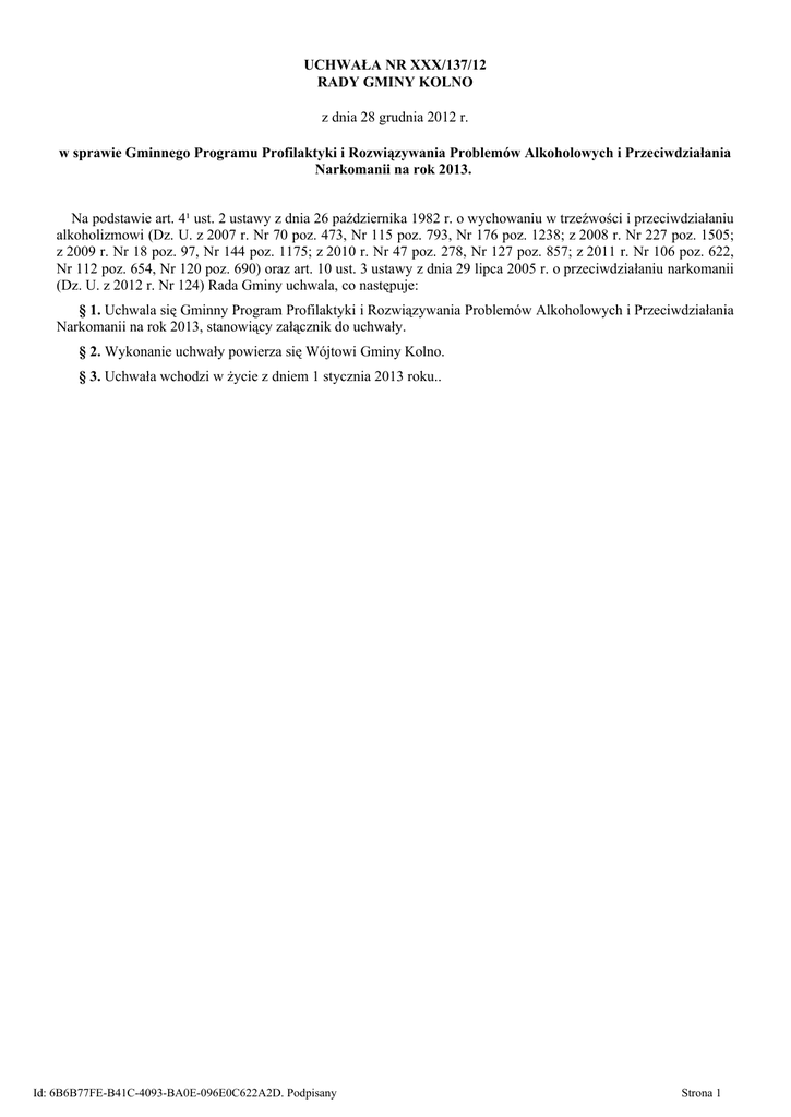 UCHWAŁA NR XXX/137/12 RADY GMINY KOLNO z dnia 28 grudnia 2012 r. w sprawie Gminnego Programu Profilaktyki i Rozwiązywania Problemów Alkoholowych i Przeciwdziałania Narkomanii na rok 2013. Na podstawie art. 4¹ ust. 2 ustawy z dnia 26 października 1982 r. o wychowaniu w trzeźwości i przeciwdziałaniu alkoholizmowi (Dz. U. z 2007 r. Nr 70 poz. 473, Nr 115 poz. 793, Nr 176 poz. 1238; z 2008 r. Nr 227 poz. 1505; z 2009 r. Nr 18 poz. 97, Nr 144 poz. 1175; z 2010 r. Nr 47 poz. 278, Nr 127 poz. 857; z 2011 r. Nr 106 poz. 622, Nr 112 poz. 654, Nr 120 poz. 690) oraz art. 10 ust. 3 ustawy z dnia 29 lipca 2005 r. o przeciwdziałaniu narkomanii (Dz. U. z 2012 r. Nr 124) Rada Gminy uchwala, co następuje: § 1. Uchwala się Gminny Program Profilaktyki i Rozwiązywania Problemów Alkoholowych i Przeciwdziałania Narkomanii na rok 2013, stanowiący załącznik do uchwały. § 2. Wykonanie uchwały powierza się Wójtowi Gminy Kolno. § 3. Uchwała wchodzi w życie z dniem 1 stycznia 2013 roku.. Id: 6B6B77FE-B41C-4093-BA0E-096E0C622A2D. Podpisany Strona 1 Załącznik Nr 1 do Uchwały Nr XXX/137/12 Rady Gminy Kolno z dnia 28 grudnia 2012 r. Gminny Program Profilaktyki i Rozwiązywania Problemów Alkoholowych i Przeciwdziałania Narkomanii na rok 2013. Rada Gminy Kolno uznając rozwiązywanie problemów alkoholowych i przeciwdziałanie narkomanii za podstawowy warunek rozwoju moralnego i materialnego mieszkańców gminy oraz mając na uwadze całokształt negatywnych, ale równocześnie wielowymiarowych konsekwencji związanych z konsumpcją alkoholu i zażywaniem substancji psychoaktywnych, ustala niniejszy program. Rozdział 1. Cele programu. 1. Podstawowym celem programu jest ograniczenie i zahamowanie rozmiarów: 1) szkód zdrowotnych i rozwojowych występujących u młodych mieszkańców gminy spowodowanych piciem alkoholu i zażywaniem innych substancji psychoaktywnych, 2) szkód zdrowotnych spowodowanych piciem alkoholu przez dorosłych, 3) zaburzenia życia rodzinnego związanego z alkoholem, w tym zjawiska przemocy w rodzinie, 4) naruszenia prawa przez osoby będące pod wpływem alkoholu i innych substancji psychoaktywnych, w tym kierowania pojazdem, 5) naruszenia prawa przez osoby handlujące alkoholem, 6) szkód ekonomicznych związanych z nadużywaniem alkoholu i innych środków psychoaktywnych. 2. Główne kierunki działania, przy realizacji celów: 1) zwiększanie dostępności pomocy terapeutycznej i rehabilitacyjnej dla osób uzależnionych, współuzależnionych oraz zagrożonych uzależnieniem, 2) udzielanie rodzinom, w których występują problemy alkoholowe i problemy narkomanii, pomocy psychospołecznej i prawnej, a w szczególności ochrony przed przemocą, 3) prowadzenie profilaktycznej działalności informacyjnej i edukacyjnej w zakresie rozwiązywania problemów alkoholowych i przeciwdziałania narkomanii, a w szczególności dla dzieci i młodzieży, w tym prowadzenie pozalekcyjnych zajęć sportowych i artystycznych, 4) wspomaganie działalności instytucji, stowarzyszeń i osób fizycznych, służącej rozwiązywaniu problemów alkoholowych i przeciwdziałaniu narkomanii, 5) podejmowanie interwencji w związku z naruszeniem przepisów określonych w art. 13¹ i 15 ustawy o wychowaniu w trzeźwości i przeciwdziałaniu alkoholizmowi oraz występowanie przed sądem w charakterze oskarżyciela publicznego. Rozdział 2. Zwiększanie dostępności pomocy terapeutycznej i rehabilitacyjnej dla osób uzależnionych, współuzależnionych oraz zagrożonych uzależnieniem. 1. Dofinansowanie programów terapii dla młodzieży uzależnionej i zagrożonej uzaleznieniem. 2. Dofinansowanie programów pomocy psychologicznej i psychoterapii dla osób doświadczających przemocy i osób stosujacych przemoc domową. 3. Dofinansowanie i zakup doposażenia lecznictwa odwykowego. 4. Zakup materiałów edukacyjnych dla pacjentów i terapeutów w placówce lecznictwa odwykowego. Id: 6B6B77FE-B41C-4093-BA0E-096E0C622A2D. Podpisany Strona 1 5. Dofinansowanie zajęć rehabilitacyjnych w trakcie obozów terapeutycznych. Rozdział 3. Udzielanie rodzinom, w których występują problemy alkoholowe i problemy narkomanii, pomocy psychospołecznej i prawnej, a w szczególności ochrony przed przemocą. 1. Podejmowanie czynności przez Gminną Komisję Rozwiązywania Problemów Alkoholowych zmierzających do orzeczenia o zastosowaniu wobec osoby uzależnionej od alkoholu obowiązku poddaniu się leczeniu odwykowemu. 2. Finansowanie zajęć i programów socjoterapeutycznych lub opiekuńczo - wychowawczych dla dzieci i młodzieży. W ich ramach możliwe jest prowadzenie różnorodnych programów rozwojowych dla dzieci (np. teatralnych, komputerowych, tanecznych, sportowych). 3. Dofinansowanie obozów socjoterapeutycznych dla dzieci z rodzin, dotkniętych ubóstwem i wykluczeniem społecznym. 4. Organizowanie lokalnych narad, seminariów i konferencji w zakresie wdrażania systemu pomocy dziecku i rodzinie. 5. Doskonalenie i upowszechnianie standartów interdyscyplinarnej pracy na rzecz przeciwdziałania przemocy w rodzinie. 6. Doskonalenie metod interwencji w sytuacji przemocy w rodzinie w ramach procedury "Niebieskiej Karty". 7. Prowadzenie edukacji społecznej. Rozdział 4. Prowadzenie profilaktycznej działalności informacyjnej i edukacyjnej w zakresie rozwiązywania problemów alkoholowych i przeciwdziałania narkomanii, a w szczególności dla dzieci i młodzieży, w tym prowadzenie pozalekcyjnych zajęć sportowych i artystycznych. Oddział 1. Działania profilaktyczne podejmowane wobec dzieci i młodzieży. 1. Realizowanie profilaktycznej działalności informacyjno - edukacyjnej skierowanej pośrednio i bezpośrednio do dzieci i młodzieży, przez: 1) prowadzenie na terenie szkół i innych placówkach oświatowych i opiekuńczo - wychowawczych programów profilaktycznych, 2) wspieranie jednorazowych krótkotrwałych akcji, np: konkursy, przedstawienia teatralne, koncerty, itp., 3) wspieranie