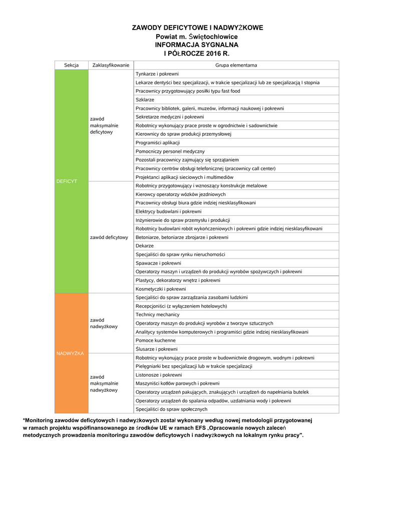 ZAWODY DEFICYTOWE I NADWYŻKOWE Powiat m. Świętochłowice INFORMACJA SYGNALNA I PÓŁROCZE 2016 R. Sekcja Zaklasyfikowanie Grupa elementarna Tynkarze i pokrewni Lekarze dentyści bez specjalizacji, w trakcie specjalizacji lub ze specjalizacją I stopnia Pracownicy przygotowujący posiłki typu fast food Szklarze Pracownicy bibliotek, galerii, muzeów, informacji naukowej i pokrewni zawód maksymalnie deficytowy Sekretarze medyczni i pokrewni Robotnicy wykonujący prace proste w ogrodnictwie i sadownictwie Kierownicy do spraw produkcji przemysłowej Programiści aplikacji Pomocniczy personel medyczny Pozostali pracownicy zajmujący się sprzątaniem Pracownicy centrów obsługi telefonicznej (pracownicy call center) Projektanci aplikacji sieciowych i multimediów DEFICYT Robotnicy przygotowujący i wznoszący konstrukcje metalowe Kierowcy operatorzy wózków jezdniowych Pracownicy obsługi biura gdzie indziej niesklasyfikowani Elektrycy budowlani i pokrewni Inżynierowie do spraw przemysłu i produkcji Robotnicy budowlani robót wykończeniowych i pokrewni gdzie indziej niesklasyfikowani zawód deficytowy Betoniarze, betoniarze zbrojarze i pokrewni Dekarze Specjaliści do spraw rynku nieruchomości Spawacze i pokrewni Operatorzy maszyn i urządzeń do produkcji wyrobów spożywczych i pokrewni Plastycy, dekoratorzy wnętrz i pokrewni Kosmetyczki i pokrewni Specjaliści do spraw zarządzania zasobami ludzkimi Recepcjoniści (z wyłączeniem hotelowych) zawód nadwyżkowy Technicy mechanicy Operatorzy maszyn do produkcji wyrobów z tworzyw sztucznych Analitycy systemów komputerowych i programiści gdzie indziej niesklasyfikowani Pomoce kuchenne Ślusarze i pokrewni NADWYŻKA Robotnicy wykonujący prace proste w budownictwie drogowym, wodnym i pokrewni Pielęgniarki bez specjalizacji lub w trakcie specjalizacji zawód maksymalnie nadwyżkowy Listonosze i pokrewni Maszyniści kotłów parowych i pokrewni Operatorzy urządzeń pakujących, znakujących i urządzeń do napełniania butelek Operatorzy urządzeń do spalania odpadów, uzdatniania wody i pokrewni Specjaliści do spraw społecznych *Monitoring zawodów deficytowych i nadwyżkowych został wykonany według nowej metodologii przygotowanej w ramach projektu współfinansowanego ze środków UE w ramach EFS „Opracowanie nowych zaleceń metodycznych prowadzenia monitoringu zawodów deficytowych i nadwyżkowych na lokalnym rynku pracy".
