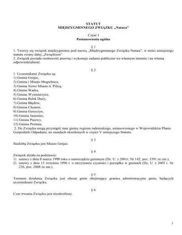 STATUT MIĘDZYGMINNEGO ZWIĄZKU „Natura” Część I Postanowienia ogólne §1 1. Tworzy się związek międzygminny pod nazwą „Międzygminnego Związku Natura”, w treści niniejszego statutu zwany dalej „Związkiem”. 2. Związek posiada osobowość prawną i wykonuje zadania publiczne we własnym imieniu i na własną odpowiedzialność. §2 1. Uczestnikami Związku są: 1) Gmina Grójec, 2) Gmina i Miasto Mogielnica, 3) Gmina Nowe Miasto n. Pilicą, 4) Gmina Warka, 5) Gmina Wyśmierzyce, 6) Gmina Belsk Duży, 7) Gmina Błędów, 8) Gmina Chynów, 9) Gmina Goszczyn, 10) Gmina Jasieniec, 11) Gmina Pniewy, 12) Gmina Promna. 2. Do Związku mogą przystąpić inne gminy regionu radomskiego, ustanowionego w Wojewódzkim Planie Gospodarki Odpadami, na zasadach określonych w części V niniejszego Statutu. §3 Siedzibą Związku jest Miasto Grójec. §4 Związek działa na podstawie: 1) ustawy z dnia 8 marca 1990 roku o samorządzie gminnym (Dz. U. z 2001r. Nr 142, poz. 1591 ze zm.), 2) ustawy z dnia 13 września 1996 r. o utrzymaniu czystości i porządku w gminach (Dz. U. z 2005 r. Nr 236, poz. 2008 ze zm.). §5 Terenem działania Związku jest obszar gmin obejmujący granice administracyjne gmin, będących uczestnikami Związku. §6 Czas trwania Związku jest nieokreślony. 1 Zadania Związku §7 1. Związek wykonuje swoje statutowe zadania dotychczas wykonywane jako zadania własne gmin. 2. Do zadań Związku należy zapewnienie czystości i porządku na terenie gmin – uczestników Związku, tworzenie warunków niezbędnych do ich utrzymania w rozumieniu ustawy z dnia 13 września 1996 r. o utrzymaniu czystości i porządku w gminach (Dz. U. z 2005 r. Nr 236, poz. 2008 ze zm.), zwanej dalej „ustawą”, a w szczególności: 1) tworzenie warunków do wykonywania prac związanych z utrzymaniem czystości i porządku na terenie gmin – uczestników Związku lub zapewnianie wykonania tych prac przez tworzenie odpowiednich jednostek organizacyjnych; 2) zapewnienie budowy, utrzymania i eksploatacji regionalnej instalacji do przetwarzania odpadów komunalnych, 3) objęcie wszystkich właścicieli nieruchomości na terenie gmin – uczestników Związku, systemem gospodarowania odpadami komunalnymi; 4) nadzór nad gospodarowaniem odpadami komunalnymi, w tym realizacja zadań powierzonych podmiotom odbierającym odpady komunalne od właścicieli nieruchomości; 5) ustanawianie selektywnego zbierania odpadów komunalnych obejmujące co najmniej następujące frakcje odpadów: papieru, metalu, tworzywa sztucznego, szkła i opakowań wielomateriałowych oraz odpadów komunalnych ulegających biodegradacji, w tym odpadów opakowaniowych ulegających biodegradacji; 6) tworzenie punktów selektywnego zbierania odpadów komunalnych w sposób zapewniający łatwy dostęp dla wszystkich mieszkańców gmin – uczestników Związku, w tym wskazywanie miejsca, w których mogą być prowadzone zbiórki zużytego sprzętu elektrycznego i elektronicznego pochodzącego z gospodarstw domowych; 7) zapewnianie osiągnięcia odpowiednich poziomów recyklingu, przygotowania do ponownego użycia i odzysku innymi metodami oraz ograniczenia masy odpadów komunalnych ulegających biodegradacji przekazywanych do składowania; 8) prowadzenie działań informacyjnych w zakresie prawidłowego gospodarowania odpadami komunalnymi, w szczególności w zakresie selektywnego zbierania odpadów komunalnych; 9) udostępnianie na stronie internetowej Związku, informacji o: a) podmiotach odbierających odpady komunalne od właścicieli nieruchomości z terenu danej gminy – uczestnika Związku, zawierające firmę, oznaczenie siedziby i adres albo imię, nazwisko i adres podmiotu odbierającego odpady komunalne od właścicieli nieruchomości, b) miejscach zagospodarowania przez podmioty odbierające odpady komunalne od właścicieli nieruchomości z terenu danej gminy – uczestnika Związku, zmieszanych odpadów komunalnych, odpadów zielonych oraz pozostałości z sortowania odpadów komunalnych przeznaczonych do składowania, c) osiągniętych przez poszczególne gminy – uczestników Związku oraz podmioty odbierające odpady komunalne od właścicieli nieruchomości, które nie działają na podstawie umowy, o której mowa w art. 6f ust. 1 ustawy, i nie świadczą takiej usługi w trybie zamówienia z wolnej ręki, o którym mowa w art. 6f ust. 2 ustawy, w danym roku kalendarzowym wymaganych poziomach recyklingu, przygotowania do ponownego użycia i odzysku innymi metodami oraz ograniczenia masy odpadów komunalnych ulegających biodegradacji przekazywanych do składowania, d) punktach selektywnego zbierania odpadów komunalnych, zawierające: - firmę, oznaczenie siedziby i adres albo imię, nazwisko i adres prowadzącego punkt selektywnego zbierania odpadów komunalnych, - adresy punktów selektywnego zbierania odpadów komunalnych na terenie danej gminy – uczestnika Związku, wraz ze wskazaniem godzin przyjmowania odpadów, 2 e) zbierających zużyty sprzęt elektryczny i elektroniczny pochodzący z gospodarstw domowych, o których mowa w ustawie z dnia 29 lipca 2005 r. o zużytym sprzęcie elektrycznym i elektronicznym (Dz. U. Nr 180, poz. 1495, z późn. zm.) zawierające: - firmę, oznaczenie siedziby i adres albo imię, nazwisko i adres zbierającego zużyty sprzęt elektryczny i elektroniczny, - adresy punktów zbierania zużytego sprzętu elektrycznego i elektronicznego na terenie danej gminy – uczestnika Związku; 10) dokonywanie corocznej analizy stanu gospodarki odpadami komunalnymi, w celu weryfikacji możliwości technicznych i organizacyjnych gmin – uczestników Związku w zakresie gospodarowania odpadami komunalnymi, w tym: a) możliwości przetwarzania zmieszanych odpadów komunalnych, odpadów zielonych oraz pozostałości z sortowania odpadów komunalnych przeznaczonych do składowania, b) potrzeb inwestycyjnych związanych z gospodarowaniem odpadami komunalnymi, c) kosztów poniesi