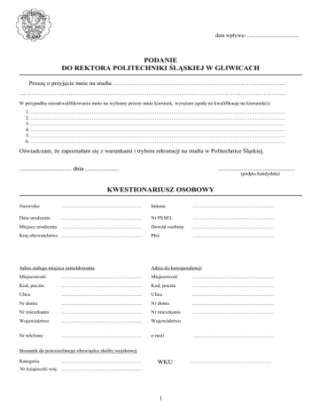 data wpływu: ..................................... PODANIE DO REKTORA POLITECHNIKI ŚLĄSKIEJ W GLIWICACH Proszę o przyjęcie mnie na studia ………………………………………………………………………… …………………………………………………………………………………………………………………. W przypadku niezakwalifikowania mnie na wybrany przeze mnie kierunek, wyrażam zgodę na kwalifikację na kierunek(i): 1. …………………………………………………………………………………………………………………………………… 2. …………………………………………………………………………………………………………………………………… 3. …………………………………………………………………………………………………………………………………… 4. …………………………………………………………………………………………………………………………………… 5. …………………………………………………………………………………………………………………………………… 6. …………………………………………………………………………………………………………………………………… Oświadczam, że zapoznałam się z warunkami i trybem rekrutacji na studia w Politechnice Śląskiej. .................................. dnia ...................... .................................................. (podpis kandydata) KWESTIONARIUSZ OSOBOWY Nazwisko ………………………………………… Imiona ………………………………………… Data urodzenia ………………………………………… Nr PESEL ………………………………………… Miejsce urodzenia ………………………………………… Dowód osobisty ………………………………………… Kraj obywatelstwa ………………………………………… Płeć ………………………………………… Adres stałego miejsca zameldowania Adres do korespondencji Miejscowość ………………………………………… Miejscowość ………………………………………… Kod, poczta ………………………………………… Kod, poczta ………………………………………… Ulica ………………………………………… Ulica ………………………………………… Nr domu ………………………………………… Nr domu ………………………………………… Nr mieszkania ………………………………………… Nr mieszkania ………………………………………… Województwo ………………………………………… Województwo Nr telefonu ………………………………………… e-mail ………………………………………… Stosunek do powszechnego obowiązku służby wojskowej Kategoria ………………………………………… WKU Nr książeczki woj. ………………………………………… 1 ………………………………………… WYKSZTAŁCENIE Szkoła średnia Nazwa szkoły ……………………………………………………………………………………………………. Rok ukończenia ………………………………………… Miejscowość ………………………………………… Numer ……………………………………… Województwo ………………………………………… Data wydania ……………………………………… Świadectwo dojrzałości Studia w szkole wyższej Nazwa uczelni ……………………………………………………………………………………………………. Miejscowość ………………………………………… Wydział ……………………………………………………………………………………………………. Kierunek ……………………………………………………………………………………………………. Rok ostatniej próby …………………… Rok zaliczenia ostatniego semestru …………………… Liczba zaliczonych semestrów …………………… Studia podyplomowe ……………………………………………………………………………………………………. Inne (np. staże lub konferencje) ……………………………………………………………………………………………………. Zatrudnienie ……………………………………………………………………………………………………. ……………………………………………………………………………………………………. ……………………………………………………………………………………………………. DANE RODZICÓW Imię matki ………………………………………… Imię ojca ………………………………………… Nazwisko panieńskie matki ………………………………………… Nazwisko ojca ………………………………………… □ Matka żyje Podstawowe źródło utrzymania rodziny □ Ojciec żyje …………………………………………………………………………………………… ŻYCIORYS (tylko dodatkowe informacje) …………………………………………………………………………………………………………….…………. …………………………………………………………………………………………………………….…………. …………………………………………………………………………………………………………….…………. ……………………………………………………………………………