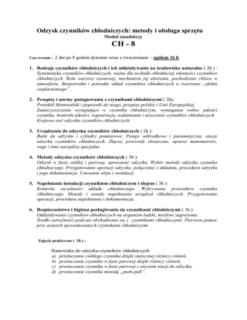 Odzysk czynników chłodniczych: metody i obsługa sprzętu Moduł zasadniczy CH - 8 Czas trwania : 2 dni po 8 godzin dziennie wraz z ćwiczeniami – ogółem 16 h 1. Rodzaje czynników chłodniczych i ich oddziaływanie na środowisko naturalne ( 2h ) : Systematyka czynników chłodniczych, ważne dla techniki chłodniczej własności czynników chłodniczych. Rola warstwy ozonowej, mechanizm jej ubożenia, pochodzenie chloru w atmosferze. Bezpośredni i pośredni wkład czynników chłodniczych w tworzenie „efektu cieplarnianego”. 2. Przepisy i normy postępowania z czynnikami chłodniczymi ( 2h): Protokół Montrealski i poprawki do niego, przepisy polskie i Unii Europejskiej. Zanieczyszczenia występujące w czynniku chłodniczym, wymagania wobec jakości czynnika, kontrola jakości, regeneracja, uzdatnianie i niszczenie czynników chłodniczych. Krajowa sieć odzysku czynników chłodniczych. 3. Urządzenia do odzysku czynników chłodniczych ( 2h ): Butle do odzysku i cylindry pomiarowe. Pompy odśrodkowe i pneumatyczne, stacje odzysku czynników chłodniczych. Złącza, przewody elastyczne, oprawy manometrów, wagi i inne narzędzia specjalne. 4. Metody odzysku czynników chłodniczych ( 3h ): Odzysk w fazie ciekłej i parowej, sprawność odzysku. Wybór metody odzysku czynnika chłodniczego. Przygotowanie operacji odzysku, połączenie z układem, procedura odzysku i jego dokumentacja. Usuwanie oleju z instalacji. 5. Napełnianie instalacji czynnikiem chłodniczym i olejem ( 3h ): Kontrola szczelności układu chłodniczego. Wykrywanie przecieków czynnika chłodniczego. Metody i zasady napełniania urządzeń chłodniczych. Przygotowanie operacji, procedura napełniania i dokumentacja. 6. Bezpieczeństwo i higiena posługiwania się czynnikami chłodniczymi ( 1h ): Oddziaływanie czynników chłodniczych na organizm ludzki, możliwe zagrożenia. Środki ostrożności podczas obchodzenia się z czynnikami chłodniczymi. Pierwsza pomoc przy urazach spowodowanych czynnikami chłodniczymi. Zajęcia praktyczne ( 3h ) : Stanowisko do odzysku czynników chłodniczych: a) przetaczanie ciekłego czynnika dzięki statycznej różnicy ciśnień, b) przetaczanie czynnika w fazie parowej dzięki różnicy ciśnień, c) przetaczanie czynnika w fazie parowej z użyciem stacji do odzysku, d) przetaczanie czynnika metodą „push-pull”.