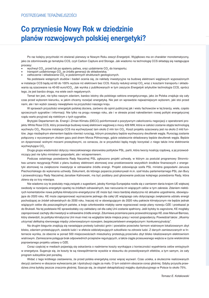Postrzeganie teraźniejszości Co przyniesie Nowy Rok w dziedzinie planów rozwojowych polskiej energetyki? Po raz kolejny przychodzi mi otwierać pierwszy w Nowym Roku zeszyt Energetyki. Wyjątkowo ma on charakter monotematyczny, jako że zdominowała go tematyka CCS, czyli Carbon Capture and Storage. Jak wiadomo na technologię CCS składają się następujące procesy: • wychwyt CO2, przed lub po spaleniu paliwa, oraz uzdatnienie CO2 do transportu; • transport uzdatnionego CO2 ze źródła generacji do składowiska; • zatłoczenie i składowanie CO2 w podziemnych strukturach geologicznych. Na podstawie wstępnych studiów i badań ocenia się, że nakłady inwestycyjne na budowę elektrowni węglowych wyposażonych w instalacje CCS będą od 60 do 100% wyższe niż elektrowni bez CCS. Koszty redukcji emisji CO2 wraz z kosztami transportu i składowania są szacowane na 40-60 euro/tCO2. Jak wynika z publikowanych w tym zeszycie Energetyki artykułów technologia CCS, oprócz tego, że jest bardzo droga, ma wiele cech negatywnych. Temat ten jest, nie tylko naszym zdaniem, bardzo istotny dla polskiego sektora energetycznego, jako że Polska znajduje się cały czas przed wyborem kierunku, w jakim chcemy rozwijać energetykę. Nie jest on wprawdzie najważniejszym wyborem, jaki stoi przed nami, ale i ten wybór zaważy niewątpliwie na przyszłości naszego kraju. W sprawach przyszłości energetyki polskiej dociera, zarówno do opinii publicznej jak i wielu fachowców w tej branży, wiele, często sprzecznych sygnałów i informacji. Nie tylko na progu nowego roku, ale i w okresie przed nakreśleniem nowej polityki energetycznej rządu warto przyjrzeć się niektórym z tych sygnałów. Brytyjski Departament ds. Energii i Zmian Klimatu (DECC) poinformował o pozytywnym zakończeniu negocjacji z operatorami projektu White Rose CCS, który przewiduje budowę nowej elektrowni węglowej o mocy 426 MW, która w całości zostanie objęta technologią wychwytu CO2. Rocznie instalacja CCS ma wychwytywać tam około 2 mln ton CO2. Koszt projektu szacowany jest na około 2 mld funtów. Jego niezbędnym elementem będzie również rurociąg, którym przesyłany będzie wychwycony dwutlenek węgla. Rurociąg zostanie połączony z wyczerpanym złożem gazu pod dnem Morza Północnego, gdzie ostatecznie składowany będzie dwutlenek węgla. Będzie on dysponować wolnymi mocami przesyłowymi, co oznacza, że w przyszłości będą mogły korzystać z niego także inne elektrownie wychwytujące CO2. Druga grupa wiadomości dotyczy nieoczekiwanego stanowiska polityków PSL, partii, która tworzy koalicję rządową, a jej przewodniczący jest nie tylko ministrem gospodarki, ale i wicepremierem. Podczas ostatniego posiedzenia Rady Naczelnej PSL zgłoszono projekt uchwały, w którym za postulat programowy Stronnictwa uznano rezygnację Polski z planu budowy elektrowni atomowej oraz przekierowanie wszystkich środków finansowych z energetyki atomowej na zwiększone inwestycje w odnawialne źródła energii. Projekt zobowiązuje szefa PSL ministra gospodarki Janusza Piechocińskiego do wykonania uchwały. Dokument, do którego poparcia przekonywali m.in. szef klubu parlamentarnego PSL Jan Bury i przewodniczący Rady Naczelnej Jarosław Kalinowski, ma być poddany pod głosowanie podczas kolejnego posiedzenia Rady, która zbiera się co trzy miesiące. Nie wiadomo czy te postulaty mają związek z sugestiami, jakoby Komisja Europejska nosiła się z zamiarem dania krajom UE większej swobody w rozwijaniu energetyki opartej na źródłach odnawialnych, bez narzucania im wiążących celów w tym zakresie. Zdaniem niektórych komentatorów nowa polityka klimatyczno-energetyczna UE może być nieco bardziej elastyczna niż aktualne uzgodnienia, obowiązujące do 2020 roku. KE może zaproponować wyznaczenie jednego dla całej UE wiążącego celu dotyczącego zwiększenia udziału energii pochodzącej ze źródeł odnawialnych do 2030 roku. Inaczej niż w obowiązującym do 2020 roku pakiecie klimatycznym nie będzie jednak wiążących celów dla poszczególnych państw, a kraje członkowskie miałyby same wypracować swoje plany rozwoju OZE i przekazać je do Brukseli. Na tej podstawie KE sprawdzałaby czy zakładany cel dla całej Unii zostanie spełniony. Jeśli byłoby to zagrożone, KE mogłaby zaproponować zachęty dla inwestycji w odnawialne źródła energii. Zdumiewa przemiana pana przewodniczącego KE Jose Manuel Barroso, który stwierdził, że polityka klimatyczna Unii musi mieć na względzie także miejsca pracy i wzrost gospodarczy. Powiedział także: „Musimy utrzymać delikatną równowagę między zrównoważonym rozwojem, bezpieczeństwem energetycznym i konkurencyjnością”. Na drugim biegunie znajdują się narastające protesty ludności gmin i powiatów przeciwko farmom wiatrowym lokalizowanym zbyt blisko, zdaniem protestujących, siedzib ludzi i w efekcie oddziaływujących szkodliwie na zdrowie ludzi. Z danych zamieszczanych w Internecie wynika, że obecnie w ponad 500 miejscowościach mieszkańcy protestują przeciwko zbyt blisko lokalizowanym elektrowniom wiatrowym. Zamieszanie potęguje brak odpowiednich przepisów regulujących, a także ciągle przesuwanego wejścia w życie wielokrotnie poprawianego projektu ustawy o OZE. Coraz częściej w mediach pojawiają się oskarżenia o nadmierne koszty wynikające z konieczności wypełnienia celów emisyjnych w energetyce. Sugeruje się, że koszty te są niewspółmiernie wysokie w stosunku do przewidywanych efektów, a tym samym, że cały program subsydiów jest porażką. Widać z tego krótkiego zestawienia, że przed polska energetyką coraz więcej wyzwań. Czas ucieka, a skutecznie realizowanych decyzji zarówno w obszarze wytwarzania jak i dystrybucji ciągle za mało. O tym ostatnim obszarze coraz głośniej. Gdyby przyszła prawdziwa zima byłoby jeszcze znacznie głośniej. Szacuje się, że stopień dekapital