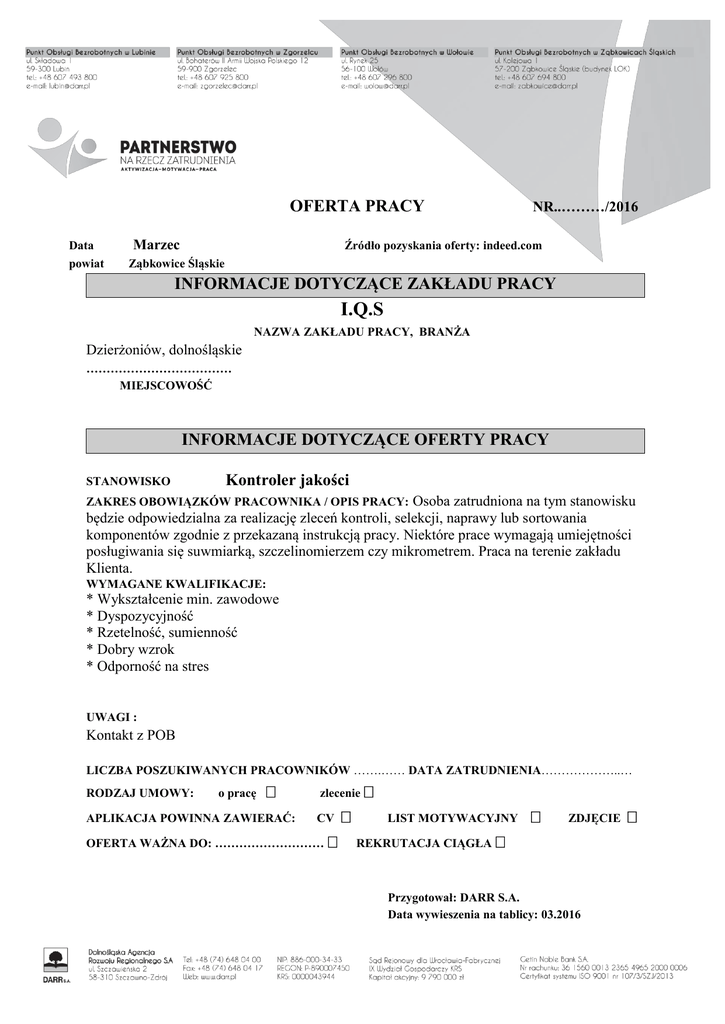 OFERTA PRACY Data powiat NR..………/2016 Źródło pozyskania oferty: indeed.com Marzec Ząbkowice Śląskie INFORMACJE DOTYCZĄCE ZAKŁADU PRACY I.Q.S NAZWA ZAKŁADU PRACY, BRANŻA Dzierżoniów, dolnośląskie ……………………………… MIEJSCOWOŚĆ INFORMACJE DOTYCZĄCE OFERTY PRACY STANOWISKO Kontroler jakości ZAKRES OBOWIĄZKÓW PRACOWNIKA / OPIS PRACY: Osoba zatrudniona na tym stanowisku będzie odpowiedzialna za realizację zleceń kontroli, selekcji, naprawy lub sortowania komponentów zgodnie z przekazaną instrukcją pracy. Niektóre prace wymagają umiejętności posługiwania się suwmiarką, szczelinomierzem czy mikrometrem. Praca na terenie zakładu Klienta. WYMAGANE KWALIFIKACJE: * Wykształcenie min. zawodowe * Dyspozycyjność * Rzetelność, sumienność * Dobry wzrok * Odporność na stres UWAGI : Kontakt z POB LICZBA POSZUKIWANYCH PRACOWNIKÓW …….…… DATA ZATRUDNIENIA………………..… RODZAJ UMOWY: o pracę APLIKACJA POWINNA ZAWIERAĆ: zlecenie CV OFERTA WAŻNA DO: ……………………… LIST MOTYWACYJNY ZDJĘCIE REKRUTACJA CIĄGŁA Przygotował: DARR S.A. Data wywieszenia na tablicy: 03.2016 LINK: http://pl.indeed.com/poka%C5%BCprac%C4%99?jk=350167045623e6f9&l=Zabkowice+Slaskie&tk=1al6lepv5 18rkfl6&from=ja&alid=565f691de4b0a8add90f02bc&utm_source=jobseeker_emails&utm_medium=email&ut m_campaign=job_alerts