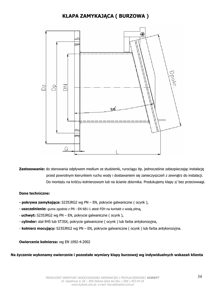 KLAPA ZAMYKAJĄCA ( BURZOWA ) Zastosowanie: do sterowania odpływem medium ze studzienki, rurociągu itp. jednocześnie zabezpieczając instalację przed powrotnym kierunkiem ruchu wody i dostawaniem się zanieczyszczeń z zewnątrz do instalacji. Do montażu na króćcu kołnierzowym lub na ścianie zbiornika. Produkujemy klapy z/ bez przeciwwagi. Dane techniczne: - pokrywa zamykająca: S235JRG2 wg PN – EN, pokrycie galwaniczne ( ocynk ), - uszczelnienie: guma zgodnie z PN - EN 681-1 atest PZH na kontakt z wodą pitną, - uchwyt: S235JRG2 wg PN – EN, pokrycie galwaniczne ( ocynk ), - cylinder: stal R45 lub ST3SX, pokrycie galwaniczne ( ocynk ) lub farba antykorozyjna, - kołnierz mocujący: S235JRG2 wg PN – EN, pokrycie galwaniczne ( ocynk ) lub farba antykorozyjna. Owiercenie kołnierza: wg EN 1092-4:2002 Na życzenie wykonamy owiercenie i pozostałe wymiary klapy burzowej wg indywidualnych wskazań klienta PRODUCENT ARMATURY WODOCIAGOWEJ NAPRAWCZEJ I PRZYŁACZENIOWEJ KUBWIT Ul. Osadnicza 5, 65 – 950 Zielona Góra tel./fax: ( 068 ) 453-54-35 www.kubwit.com.pl, e-mail: [email protected] 34 Owiercenie kołnierza: PN 10 wg wg EN 1092-4:2002 DN Dp Ilość Łącznik M [ mm ] [ mm ] otworów [ mm ] 80 18 4 lub 8 16 240 18 8 16 280 240 18 8 20 10 330 270 18 8 20 395 10 385 320 18 12 24 400 445 10 435 320 18 12 24 350 460 505 10 475 320 18 16 24 400 515 565 10 525 320 18 16 28 500 620 670 16 630 320 18 20 30 Dz [ mm ] G [ mm ] D pokr. L [ mm ] Kąt ( ° ) 160 200 8 180 180 100 180 220 8 230 150 240 285 8 200 295 349 250 350 300 PRODUCENT ARMATURY WODOCIAGOWEJ NAPRAWCZEJ I PRZYŁACZENIOWEJ KUBWIT Ul. Osadnicza 5, 65 – 950 Zielona Góra tel./fax: ( 068 ) 453-54-35 www.kubwit.com.pl, e-mail: [email protected] 35