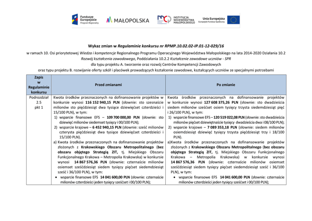 Wykaz zmian w Regulaminie konkursu nr RPMP.10.02.02-IP.01-12-029/16 w ramach 10. Osi priorytetowej Wiedza i kompetencje Regionalnego Programu Operacyjnego Województwa Małopolskiego na lata 2014-2020 Działania 10.2 Rozwój kształcenia zawodowego, Poddziałania 10.2.2 Kształcenie zawodowe uczniów - SPR dla typu projektu A. tworzenie oraz rozwój Centrów Kompetencji Zawodowych oraz typu projektu B. rozwijanie oferty szkół i placówek prowadzących kształcenie zawodowe, kształcących uczniów ze specjalnymi potrzebami Zapis w Przed zmianami Regulaminie konkursu Podrozdział Kwota środków przeznaczonych na dofinansowanie projektów w 2.5 konkursie wynosi 116 152 940,15 PLN (słownie: sto szesnaście pkt 1 milionów sto pięćdziesiąt dwa tysiące dziewięćset czterdzieści i 15/100 PLN), w tym: 1) wsparcie finansowe EFS – 109 700 000,00 PLN (słownie: sto dziewięć milionów siedemset tysięcy i 00/100 PLN); 2) wsparcie krajowe – 6 452 940,15 PLN (słownie: sześć milionów czterysta pięćdziesiąt dwa tysiące dziewięćset czterdzieści i 15/100 PLN). a) Kwota środków przeznaczonych na dofinansowanie projektów złożonych z Krakowskiego Obszaru Metropolitalnego (bez obszaru objętego Strategią ZIT, tj. Miejskiego Obszaru Funkcjonalnego Krakowa – Metropolia Krakowska) w konkursie wynosi 14 867 576,36 PLN (słownie: czternaście milionów osiemset sześćdziesiąt siedem tysięcy pięćset siedemdziesiąt sześć i 36/100 PLN), w tym: wsparcie finansowe EFS 14 041 600,00 PLN (słownie: czternaście milionów czterdzieści jeden tysięcy sześćset i 00/100 PLN); Po zmianie Kwota środków przeznaczonych na dofinansowanie projektów w konkursie wynosi 127 608 375,26 PLN (słownie: sto dwadzieścia siedem milionów sześćset osiem tysięcy trzysta siedemdziesiąt pięć i 26/100 PLN), w tym: 1) wsparcie finansowe EFS – 120 519 022,08 PLN (słownie: sto dwadzieścia milionów pięćset dziewiętnaście tysięcy dwadzieścia dwa i 08/100 PLN); 2) wsparcie krajowe – 7 089 353,18 PLN (słownie: siedem milionów osiemdziesiąt dziewięć tysięcy trzysta pięćdziesiąt trzy i 18/100 PLN). a) Kwota środków przeznaczonych na dofinansowanie projektów złożonych z Krakowskiego Obszaru Metropolitalnego (bez obszaru objętego Strategią ZIT, tj. Miejskiego Obszaru Funkcjonalnego Krakowa – Metropolia Krakowska) w konkursie wynosi 14 867 576,36 PLN (słownie: czternaście milionów osiemset sześćdziesiąt siedem tysięcy pięćset siedemdziesiąt sześć i 36/100 PLN), w tym: wsparcie finansowe EFS 14 041 600,00 PLN (słownie: czternaście milionów czterdzieści jeden tysięcy sześćset i 00/100 PLN); wsparcie krajowe – 825 976,36 PLN (słownie: osiemset dwadzieścia pięć tysięcy dziewięćset siedemdziesiąt sześć i 36/100 PLN). b) Kwota środków przeznaczonych na dofinansowanie projektów złożonych z Subregionu tarnowskiego w konkursie wynosi 24 972 882,03 PLN (słownie: dwadzieścia cztery miliony dziewięćset siedemdziesiąt dwa tysiące osiemset osiemdziesiąt dwa i 03/100 PLN), w tym: wsparcie finansowe EFS – 23 585 500,00 PLN (słownie: dwadzieścia trzy miliony pięćset osiemdziesiąt pięć tysięcy pięćset i 00/100 PLN); wsparcie krajowe – 1 387 382,03 PLN (słownie: jeden milion trzysta osiemdziesiąt siedem tysięcy trzysta osiemdziesiąt dwa i 03/100 PLN). c) Kwota środków przeznaczonych na dofinansowanie projektów złożonych z Subregionu sądeckiego w konkursie wynosi 29 735 152,71 PLN (słownie: dwadzieścia dziewięć milionów siedemset trzydzieści pięć tysięcy sto pięćdziesiąt dwa i 71/100 PLN), w tym: wsparcie finansowe EFS – 28 083 200,00 zł PLN (słownie: dwadzieścia osiem milionów osiemdziesiąt trzy tysiące dwieście i 00/100 PLN); wsparcie krajowe – 1 651 952,71 PLN (słownie: jeden milion sześćset pięćdziesiąt jeden tysięcy dziewięćset pięćdziesiąt dwa i 71/100 PLN). d) Kwota środków przeznaczonych na dofinansowanie projektów złożonych z Subregionu podhalańskiego w konkursie wynosi 18 352 164,57 PLN (słownie: osiemnaście milionów trzysta pięćdziesiąt dwa tysiące sto sześćdziesiąt cztery i 57/100 PLN), w tym: 2 wsparcie krajowe – 825 976,36 PLN (słownie: osiemset dwadzieścia pięć tysięcy dziewięćset siedemdziesiąt sześć i 36/100 PLN). b) Kwota środków przeznaczonych na dofinansowanie projektów złożonych z Subregionu tarnowskiego w konkursie wynosi 30 066 328,01 PLN (słownie: trzydzieści milionów sześćdziesiąt sześć tysięcy trzysta dwadzieścia osiem i 01/100 PLN), w tym: wsparcie finansowe EFS – 28 395 976,64 PLN (słownie: dwadzieścia osiem milionów trzysta dziewięćdziesiąt pięć tysięcy dziewięćset siedemdziesiąt sześć i 64/100 PLN); wsparcie krajowe – 1 670 351,37 PLN (słownie: jeden milion sześćset siedemdziesiąt tysięcy trzysta pięćdziesiąt jeden i 37/100 PLN). c) Kwota środków przeznaczonych na dofinansowanie projektów złożonych z Subregionu sądeckiego w konkursie wynosi 29 735 152,71 PLN (słownie: dwadzieścia dziewięć milionów siedemset trzydzieści pięć tysięcy sto pięćdziesiąt dwa i 71/100 PLN), w tym: wsparcie finansowe EFS – 28 083 200,00 zł PLN (słownie: dwadzieścia osiem milionów osiemdziesiąt trzy tysiące dwieście i 00/100 PLN); wsparcie krajowe – 1 651 952,71 PLN (słownie: jeden milion sześćset pięćdziesiąt jeden tysięcy dziewięćset pięćdziesiąt dwa i 71/100 PLN). d) Kwota środków przeznaczonych na dofinansowanie projektów złożonych z Subregionu podhalańskiego w konkursie wynosi 18 352 164,57 PLN (słownie: osiemnaście milionów trzysta pięćdziesiąt dwa tysiące sto sześćdziesiąt cztery i 57/100 PLN), w tym: wsparcie finansowe EFS – 17 332 600,00 PLN (słownie: siedemnaście milionów trzysta trzydzieści dwa tysiące sześćset i 00/100 PLN); wsparcie krajowe 1 019 564,57 PLN (słownie: jeden milion dziewiętnaście tysięcy pięćset sześćdziesiąt cztery 