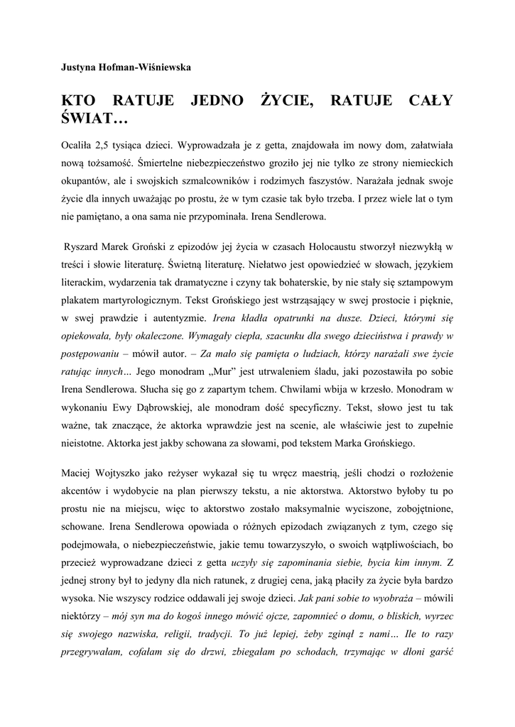 Justyna Hofman-Wiśniewska KTO RATUJE ŚWIAT… JEDNO ŻYCIE, RATUJE CAŁY Ocaliła 2,5 tysiąca dzieci. Wyprowadzała je z getta, znajdowała im nowy dom, załatwiała nową tożsamość. Śmiertelne niebezpieczeństwo groziło jej nie tylko ze strony niemieckich okupantów, ale i swojskich szmalcowników i rodzimych faszystów. Narażała jednak swoje życie dla innych uważając po prostu, że w tym czasie tak było trzeba. I przez wiele lat o tym nie pamiętano, a ona sama nie przypominała. Irena Sendlerowa. Ryszard Marek Groński z epizodów jej życia w czasach Holocaustu stworzył niezwykłą w treści i słowie literaturę. Świetną literaturę. Niełatwo jest opowiedzieć w słowach, językiem literackim, wydarzenia tak dramatyczne i czyny tak bohaterskie, by nie stały się sztampowym plakatem martyrologicznym. Tekst Grońskiego jest wstrząsający w swej prostocie i pięknie, w swej prawdzie i autentyzmie. Irena kładła opatrunki na dusze. Dzieci, którymi się opiekowała, były okaleczone. Wymagały ciepła, szacunku dla swego dzieciństwa i prawdy w postępowaniu – mówił autor. – Za mało się pamięta o ludziach, którzy narażali swe życie ratując innych… Jego monodram „Mur” jest utrwaleniem śladu, jaki pozostawiła po sobie Irena Sendlerowa. Słucha się go z zapartym tchem. Chwilami wbija w krzesło. Monodram w wykonaniu Ewy Dąbrowskiej, ale monodram dość specyficzny. Tekst, słowo jest tu tak ważne, tak znaczące, że aktorka wprawdzie jest na scenie, ale właściwie jest to zupełnie nieistotne. Aktorka jest jakby schowana za słowami, pod tekstem Marka Grońskiego. Maciej Wojtyszko jako reżyser wykazał się tu wręcz maestrią, jeśli chodzi o rozłożenie akcentów i wydobycie na plan pierwszy tekstu, a nie aktorstwa. Aktorstwo byłoby tu po prostu nie na miejscu, więc to aktorstwo zostało maksymalnie wyciszone, zobojętnione, schowane. Irena Sendlerowa opowiada o różnych epizodach związanych z tym, czego się podejmowała, o niebezpieczeństwie, jakie temu towarzyszyło, o swoich wątpliwościach, bo przecież wyprowadzane dzieci z getta uczyły się zapominania siebie, bycia kim innym. Z jednej strony był to jedyny dla nich ratunek, z drugiej cena, jaką płaciły za życie była bardzo wysoka. Nie wszyscy rodzice oddawali jej swoje dzieci. Jak pani sobie to wyobraża – mówili niektórzy – mój syn ma do kogoś innego mówić ojcze, zapomnieć o domu, o bliskich, wyrzec się swojego nazwiska, religii, tradycji. To już lepiej, żeby zginął z nami… Ile to razy przegrywałam, cofałam się do drzwi, zbiegałam po schodach, trzymając w dłoni garść powietrza zamiast małej i ufnej dłoni uratowanego. Ale zdarzało się i tak, że idąc z podopiecznym płakałam, mając w oczach sceny pożegnania, dorównujące antycznym tragediom (cytat z programu teatralnego Teatru Żydowskiego). Tekst obejmuje nie tylko epizody dotyczące ratowania żydowskich dzieci, ale i z życia codziennego Ireny Sendlerowej. A to życie było, mimo strasznych czasów, wielobarwne i obfitujące także w wydarzenia humorystyczne, niekiedy wręcz groteskowe. Jak to życie. Dzięki takiemu ujęciu Irena Sendlerowea staje się żywym człowiekiem, nie bohaterskim pomnikiem. Zderzenie słów z wyrazistymi akcentami muzycznymi Jerzego Derfla wydobywało z nich głębię znaczeń, stanowiło pewnego rodzaju pointy zamykające epizody, otwierające drogę do refleksji. Irena Sendlerowa myślała i działała z ogromną precyzją, kalkulowała, co przecież nie znaczyło, że nie tkwiły w tym głęboko skrywane emocje. Andre Malraux pisał: Odnaleźć człowieka wszędzie tam, gdzie znaleźliśmy to, co go miażdży. Twórcy spektaklu „Mur” w Teatrze Żydowskim go odnaleźli. Właśnie w tych wszystkich gestach, drobiazgach, słowach, codzienności trudnej, tragicznej i groteskowej, nie w pomnikowym bohaterstwie wystawionym ku czci, co tym cenniejsze i osobliwsze, że ten monodram jest wpisany w obchody 68.rocznicy powstania w getcie warszawskim. Może wreszcie dzięki takim spektaklom i takiej literaturze uwolnimy się od sztampy martyrologicznej, która towarzyszy nam od wielu lat odzierając te wydarzenia ze wszystkiego, co ważne i powinno w naszej pamięci pozostać. I jako refleksja i jako emocje. „Mur”, monodram wg scen. Ryszarda Marka Grońskiego, reż. Maciej Wojtyszko, wyk. Ewa Dąbrowska, Teatr Żydowski, Warszawa, premiera 12 kwietnia 2011. - Bardzo zależało mi na dostrzeżeniu może nie humoru, ale groteskowości w niektórych wydarzeniach - mówi Wojtyszko. - W każdej tragedii jest coś zabawnego, kłopotliwego, niezręcznego. I to czyni tamtą rzeczywistość bardziej zrozumiałą dla współczesnego widza. Nie chciałem, żeby nasza bohaterka stała na pomniku i wygłaszała komunały. Ten spektakl ma być spotkaniem z człowiekiem. http://www.aict.art.pl/yorick-mainmenu-65/nr-29-kwiecie-2011/2040-kto-ratuje-jedno-cyieratuje-cay-wiat