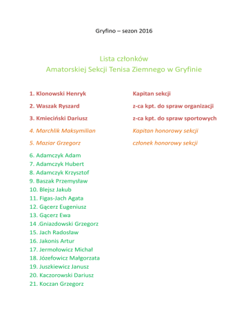 Gryfino – sezon 2016 Lista członków Amatorskiej Sekcji Tenisa Ziemnego w Gryfinie 1. Klonowski Henryk Kapitan sekcji 2. Waszak Ryszard z-ca kpt. do spraw organizacji 3. Kmieciński Dariusz z-ca kpt. do spraw sportowych 4. Marchlik Maksymilian Kapitan honorowy sekcji 5. Maziar Grzegorz członek honorowy sekcji 6. Adamczyk Adam 7. Adamczyk Hubert 8. Adamczyk Krzysztof 9. Baszak Przemysław 10. Blejsz Jakub 11. Figas-Jach Agata 12. Gącerz Eugeniusz 13. Gącerz Ewa 14 .Gniazdowski Grzegorz 15. Jach Radosław 16. Jakonis Artur 17. Jermołowicz Michał 18. Józefowicz Małgorzata 19. Juszkiewicz Janusz 20. Kaczorowski Dariusz 21. Koczan Grzegorz 22. Koczan Witold 23. Kuziemko Regina 24. Łazarz Łukasz 25. Łuszczewski Janusz 26. Malinka Krzysztof 27. Maślany Waldemar 28. Pałka Piotr 29. Pałka Marzena 30. Potocki Tomasz 31. Słupski Daniel 32. Stankiewicz Wiesław 33. Tomasiewicz Mariusz 34. Urbański Zbigniew 35. Wawrzyniak Stanisław 36. Wiśniewski Bogdan 37. Wrzosek Maciej 38. Zając Adam