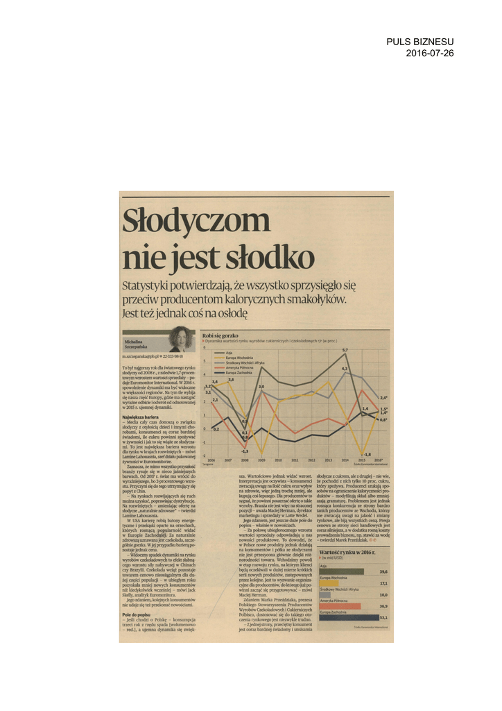 PULS BIZNESU 2016-07-26 Słodyczom nie jest słodko Statystyki potwierdzają, że wszystko sprzysięgło się przeciw producentom kalorycznych smakołyków Jest też jednak coś na osłodę Robi się gorzko Michalina Szczepańska • Dynamika wartości rynku wyrobów cukierniczych i czekoladowych r/r (w proc.) 6 > Azja [email protected]» 22-333-98-18 Europa Wschodnia Środkowy Wschód i Afryka To byłnajgorszy rok dla światowego rynku słodyczy od 2008 r., z zaledwie 1,7-procentowym wzrostem wartościsprzedaży - po daje Euromonitor International. W 2016 r. spowolnienie dynamiki ma być widoczne w większości regionów. Na tym tle wybija się nasza część Europy, gdzie ma nastąpić wyraźne odbicieiodwrót od odnotowanej w 2015 r. ujemnej dynamiki. Największa bariera - Media cały czas donoszą o związku słodyczy z otyłością dzieci i innymi cho robami, konsumenci są coraz bardziej świadomi, ile cukru powinni spożywać w żywności ijak to się wiąże ze słodycza mi. To jest największa bariera wzrostu dla rynku w krajach rozwiniętych- mówi Laminę Lahouasnia,szef działupakowanej żywności w Euromonitorze. Zaznacza, że mimo wszystkoprzyszłość branży rysuje się w nieco jaśniejszych barwach. Od 2017 r. świat ma wrócić do wyraźniejszego, bo 2-procentowego wzro stu. Przyczyni się do tego utrzymujący się popyt z Chin. - Na rynkach rozwijających się ruch można uzyskać, poprawiając dystrybucję. Na rozwiniętych - zmieniając ofertę na słodycze „naturalnie zdrowsze" - twierdzi Laminę Lahouasnia. W USA karierę robią batony energe tyczne i przekąski oparte na orzechach, których rosnącą popularność widać w Europie Zachodniej. Za naturalnie zdrowszą uznawana jest czekolada, szcze gólnie gorzka. W jej przypadku barierąpo zostaje jednak cena. - Widoczny spadek dynamiki na rynku wyrobów czekoladowych to efekt słabną cego wzrostu siły nabywczej w Chinach czy Brazylii. Czekolada wciąż pozostaje towarem cenowo nieosiągalnym dla du żej części populacji - w ubiegłym roku pozyskała mniej nowych konsumentów niż kiedykolwiek wcześniej - mówi Jack Skelly, analityk Euromonitora. Jego zdaniem, kolejnychkonsumentów nie udaje się też przekonać nowościami. Pole do popisu - Jeśli chodzi o Polskę - konsumpcja trzeci rok z rzędu spada [wolumenowo - red.], a ujemna dynamika się zwięk Ameryka Północna i Europa Zachodnia 3,6 *0,8* 2014 [KOgMO.-a 2015 2016* Źródło: Euromonitor International sza. Wartościowo jednak widać wzrost. słodycze z cukrem, ale z drugiej - nie wie, Interpretacja jest oczywista -konsumenci że pochodzi z nich tylko 10 proc. cukru, zwracają uwagę nailość cukru oraz wpływ który spożywa. Producenci szukają spo na zdrowie, więc jedzą trochę mniej, ale sobów na ograniczenie kaloryczności pro kupują coś lepszego. Dia producentów to duktów - modyfikują skład albo zmniej sygnał, że powinniposzerzać ofertę o takie szają gramaturę. Problemem jest jednak wyroby. Branża nie jest więc na straconej rosnąca konkurencja ze strony bardzo pozycji - uważa Maciej Herman, dyrektor tanich producentów ze Wschodu, którzy marketingu i sprzedaży w Lotte Wedel. nie zwracają uwagi na jakość i zmiany Jego zdaniem, jest jeszcze duże pole do rynkowe, ale biją wszystkich ceną. Presja popisu - właśnie w nowościach. cenowa ze strony sieci handlowych jest - Za połowę ubiegłorocznego wzrostu coraz silniejsza, a w dodatku rosną koszty wartości sprzedaży odpowiadają u nas prowadzenia biznesu, np. stawki za wodę nowości produktowe. To dowodzi, że - twierdzi Marek Przeździak. ® w Polsce nowe produkty jednak działają na konsumentów i półka ze słodyczami Wartość rynku w 2016 r. nie jest przesycona głównie dzięki róż • (w mld USD) norodności towaru. Wchodzimy powoli w etap rozwoju rynku, na którym klienci będą oczekiwali w dużej mierze krótkich 39,6 serii nowych produktów, zastępowanych Europa Wschodnia przez kolejne. Jest to wyzwanie organiza cyjne dla producentów, do którego jużpo Środkowy Wschód i Afryka winni zacząć się przygotowywać - mówi Maciej Herman. Zdaniem Marka Przeździaka, prezesa i Ameryka Północna Polskiego Stowarzyszenia Producentów Wyrobów CzekoladowychiCukierniczych [ Europa Zachodnia Polbisco, dostosować się do takiego oto 53,1 czenia rynkowego jest niezwykle trudno. - Z jednej strony, przeciętnykonsument Źródło: Euromonitor International jest coraz bardziej świadomy i utożsamia