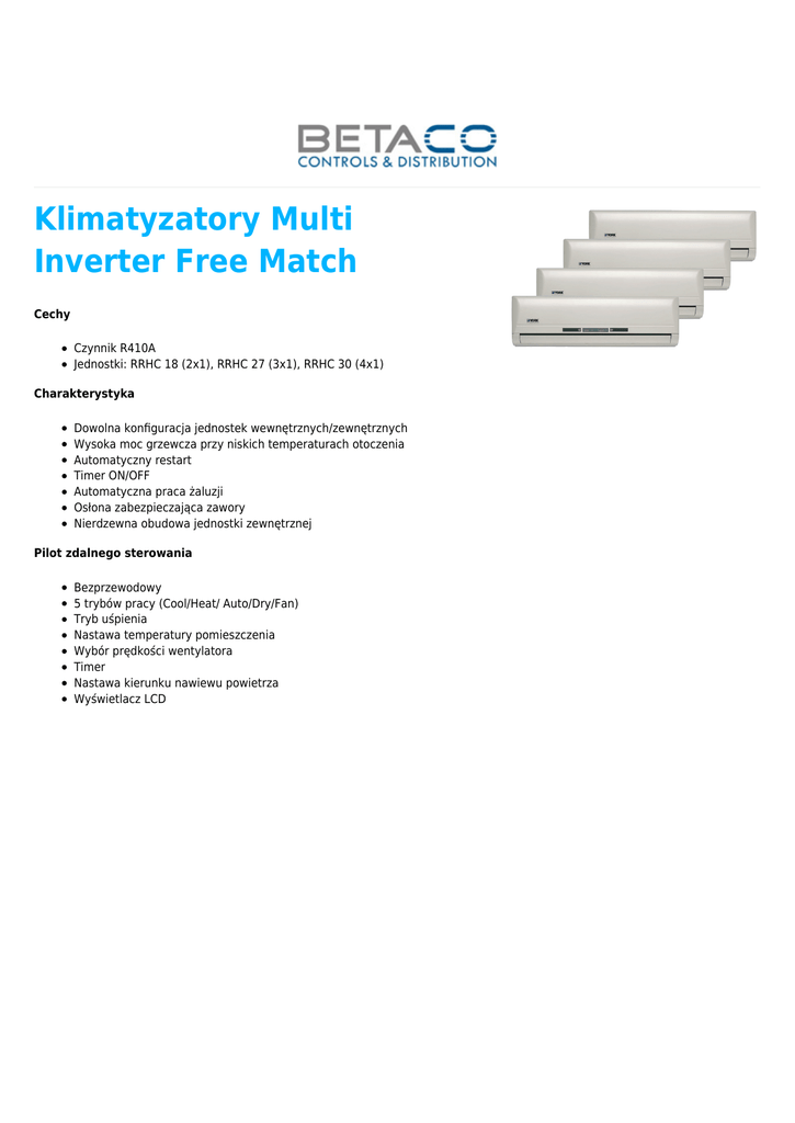 Klimatyzatory Multi Inverter Free Match Cechy Czynnik R410A Jednostki: RRHC 18 (2x1), RRHC 27 (3x1), RRHC 30 (4x1) Charakterystyka Dowolna konfiguracja jednostek wewnętrznych/zewnętrznych Wysoka moc grzewcza przy niskich temperaturach otoczenia Automatyczny restart Timer ON/OFF Automatyczna praca żaluzji Osłona zabezpieczająca zawory Nierdzewna obudowa jednostki zewnętrznej Pilot zdalnego sterowania Bezprzewodowy 5 trybów pracy (Cool/Heat/ Auto/Dry/Fan) Tryb uśpienia Nastawa temperatury pomieszczenia Wybór prędkości wentylatora Timer Nastawa kierunku nawiewu powietrza Wyświetlacz LCD Jednostki zewnętrzne RRJC Kod modelu Wydajność chłodnicza Wydajność grzewcza Zasilanie V/Q/Hz Pobór mocy kW Wymiary RRJC 12 5,3 (2,7 / 5,6) 6,3 (3,1 / 6,7) 230/1/50 1,7 / 2,0 695 x 845 x 335 RRJC 27 6,5 (2,8 - 9,5) 7,5 (3,4 - 10,4) 230/1/50 2,4 / 2,6 695 x 845 x 335 RRJC 30 8,2 (2,1 - 10,6) 8,5 (2,6 - 11,0) 230/1/50 2,7 / 2,8 860 x 895 x 330 Jednostki wewnętrzne RRKC Kod modelu Wydajność chłodnicza Wydajność grzewcza Zasilanie V/Q/Hz Pobór mocy kW Wymiary RRKC 07 2,0 2,3 230/1/50 - 250 x 710 x 190 RRKC 09 2,5 3,0 230/1/50 - 250 x 710 x 195 RRKC 12 3,4 3,5 230/1/50 - 265 x 790 x 193 Kompatybilność jednostek wewnętrznych/zewnętrznych RRHC 18 Dwie jednostki wewnętrzne RRHC 27 Trzy jednostki wewnętrzne RRHC 30 Cztery jednostki wewnętrzne 07 x 2 07 + 09 07 x 3 07 x 2 + 09 09 x 2 + 12 07 x 4 07 x 3 + 09 07 x 2 + 09 x 2 09 x 2 07 + 12 09 x 3 07 x 2 + 12 12 x 2 + 07 09 x 3 + 07 07 x 3 + 12 07 x 2 + 09 + 12 12 x 2 09 + 12 07 + 09 + 12 09 x 2 + 07 12 x 2 + 09 09 x 2 + 07 + 12 - -