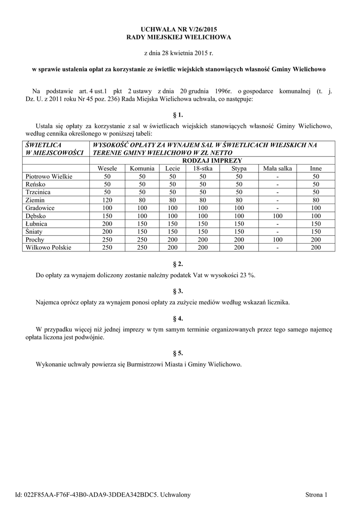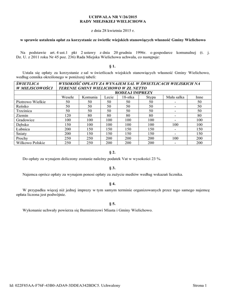 UCHWAŁA NR V/26/2015 RADY MIEJSKIEJ WIELICHOWA z dnia 28 kwietnia 2015 r. w sprawie ustalenia opłat za korzystanie ze świetlic wiejskich stanowiących własność Gminy Wielichowo Na podstawie art. 4 ust.1 pkt 2 ustawy z dnia 20 grudnia 1996r. o gospodarce komunalnej (t. j. Dz. U. z 2011 roku Nr 45 poz. 236) Rada Miejska Wielichowa uchwala, co następuje: § 1. Ustala się opłaty za korzystanie z sal w świetlicach wiejskich stanowiących własność Gminy Wielichowo, według cennika określonego w poniższej tabeli: ŚWIETLICA W MIEJSCOWOŚCI Piotrowo Wielkie Reńsko Trzcinica Ziemin Gradowice Dębsko Łubnica Śniaty Prochy Wilkowo Polskie WYSOKOŚĆ OPŁATY ZA WYNAJEM SAL W ŚWIETLICACH WIEJSKICH NA TERENIE GMINY WIELICHOWO W ZŁ NETTO RODZAJ IMPREZY Wesele Komunia Lecie 18-stka Stypa Mała salka Inne 50 50 50 50 50 50 50 50 50 50 50 50 50 50 50 50 50 50 120 80 80 80 80 80 100 100 100 100 100 100 150 100 100 100 100 100 100 200 150 150 150 150 150 200 150 150 150 150 150 250 250 200 200 200 100 200 250 250 200 200 200 200 § 2. Do opłaty za wynajem doliczony zostanie należny podatek Vat w wysokości 23 %. § 3. Najemca oprócz opłaty za wynajem ponosi opłaty za zużycie mediów według wskazań licznika. § 4. W przypadku więcej niż jednej imprezy w tym samym terminie organizowanych przez tego samego najemcę opłata liczona jest podwójnie. § 5. Wykonanie uchwały powierza się Burmistrzowi Miasta i Gminy Wielichowo. Id: 022F85AA-F76F-43B0-ADA9-3DDEA342BDC5. Uchwalony Strona 1 § 6. Uchwała wchodzi w życie z dniem podjęcia. Przewodniczący Rady Miejskiej Genowefa Feldgebel Id: 022F85AA-F76F-43B0-ADA9-3DDEA342BDC5. Uchwalony Strona 2 Uzasadnienie do Uchwały Nr V/26/2015 Rady Miejskiej Wielichowo z dnia 28 kwietnia 2015 roku w sprawie ustalenia opłat za korzystanie ze świetlic wiejskich stanowiących własność Gminy Wielichowo. Na terenie Gminy Wielichowo znajduje się 10 świetlic wiejskich będących własnością Gminy. Świetlice oprócz miejsca spotkań i imprez nieodpłatnych integrujących środowiska lokalne są również wynajmowane odpłatnie na imprezy prywatne. W związku z dużymi rozbieżnościami w stawkach opłat za wynajem świetlic wiejskich stanowiących własność Gminy Wielichowo ich ujednolicenie podjęcie niniejszej uchwały jest słuszne i zasadne. Burmistrz Miasta i Gminy Honorata Kozłowska Id: 022F85AA-F76F-43B0-ADA9-3DDEA342BDC5. Uchwalony Strona 1