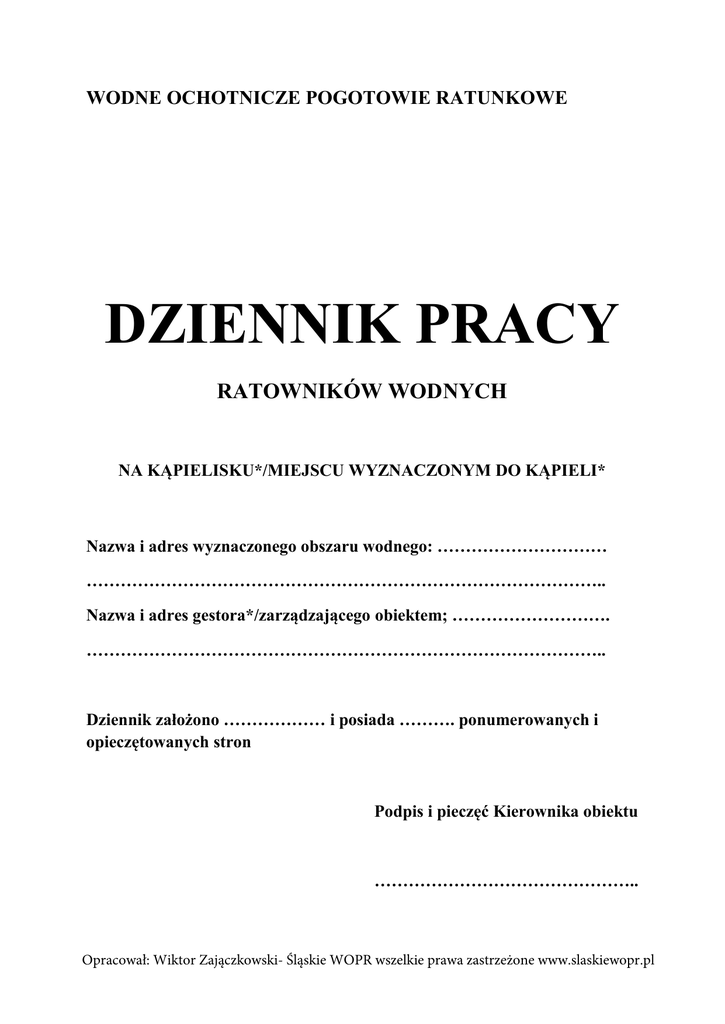 WODNE OCHOTNICZE POGOTOWIE RATUNKOWE DZIENNIK PRACY RATOWNIKÓW WODNYCH NA KĄPIELISKU*/MIEJSCU WYZNACZONYM DO KĄPIELI* Nazwa i adres wyznaczonego obszaru wodnego: ………………………… ……………………………………………………………………………….. Nazwa i adres gestora*/zarządzającego obiektem; ………………………. ……………………………………………………………………………….. Dziennik założono ……………… i posiada ………. ponumerowanych i opieczętowanych stron Podpis i pieczęć Kierownika obiektu ……………………………………….. Opracował: Wiktor Zajączkowski- Śląskie WOPR wszelkie prawa zastrzeżone www.slaskiewopr.pl SYGNALIZACJA DŹWIĘKOWA 1 GWIZDEK 2 GWIZDKI SERIA KRÓTKICH GWIZDKÓW Uwaga! Należy przerwać wszystkie zabawy, uwaga wszystkich kąpiących się powinna być zwrócona na ratownika Koniec kąpieli ALARM !! Wszyscy natychmiast wychodzą z wody OZNAKOWANIE STREF KĄPIELISKA*/MIEJSCA WYZNACZONEGO DO KĄPIELI KOLORY FLAG INFORMACYJNYCH KĄPIEL DOZWOLONA KĄPIEL ZABRONIONA GRANICA STREFY GRANICA STREFY DLA NIE UMIEJĄCYCH DLA UMIEJĄCYCH PŁYWAĆ GRANICA BRODZIKA PŁYWAĆ GRANICA STREFY DLA SPRZĘTU PŁYWAJĄCEGO TELEFONY ALARMOWE SŁUŻBA TELEFON TELEFON MIEJSKI ALARMOWY POLICJA 997 STRAŻ POŻARNA 998 POGOTOWIE RATUNKOWE 999 STRAŻ MIEJSKA 986 SCHEMAT SYTUACYJNY KĄPIELISKA*/MIEJSCA WYZNACZONEGO DO KĄPIELI* (zaznaczone, drogi dojazdowe dla służb ratowniczych, dojścia, wejścia, sanitariaty, stanowiska ratownicze, punkt pierwszej pomocy, telefon, parkingi) SCHEMAT KĄPIELISKA*/MIEJSCA WYZNACZONEGO DO KĄPIELI (z podaniem wymiarów rzeczywistych: stanowiska ratownicze, sprzęt ratowniczy, maszt sygnalizacyjny, punkt pierwszej pomocy, pomieszczenia socjalne, slip*, pomosty*, boje*) MAPA BATYMETRYCZNA WYZNACZONEGO OBSZARU WODNEGO W OBRĘBIE KĄPIELISKA*/MIEJSCA WYZNACZONEGO DO KĄPIELI* SPRZĘT RATOWNICZY, MEDYCZNY, POMOCNICZY I SYGNALIZACYJNY 1. Łączność: a/ wykaz stanowisk z rodzajem środka łączności ………………………………………………………………………………………… ………………………………………………………………………………………… b/ wdrożona procedura łączności ze Zintegrowanym Systemem Ratowniczym tak/nie* 2. Sprzęt ratowniczy, pomocniczy i sygnalizacyjny. Wymagany zgodnie z Rozporządzeniem Ministra Spraw Wewnętrznych) z dnia 27 lutego 2012 r. w sprawie wymagań dotyczących wyposażenia wyznaczonych obszarów wodnych w sprzęt ratunkowy i pomocniczy, urządzenia sygnalizacyjne i ostrzegawcze oraz sprzęt medyczny, leki i artykuły sanitarne (Dz. U. z dnia 9 marca 2012 r. poz. 261), Lp. Nazwa sprzętu Ilość/norma 1 Łódź wiosłowa 1/100 mb 2 Koło ratunkowe z linką 1/50 mb 3 Lina asekuracyjna (kołowrót, 1/100 mb zasobnik linowy) 4 Sygnał dźwiękowy 1/stanowisko 5 Rzutka ratownicza 1/ 1 ratownika 6 Lornetka 1/mwdk 7 Sprzęt ABC 1/1 ratownika 8 Maszt sygnałowy 1/mwdk 9 Komplet flag sygnałowych 1/mwdk 10 Boje czerwone 4/100 mb 11 Boje żółte 4/100 mb 12 Boje białe 8/10 mb 13 Tablica meteo 1/mwdk 14 Pas ratowniczy 1/100 mb 15 Tuba elektroakustyczna 1//stanowisko 16 Łączność CB 1/stanowisko 17 Łodzie motorowe 1/400 mb Termometr do wody 1/mwdk Termometr do powietrza 1/mwdk 17 Sprzęt medyczny, leki i art. sanitarne 1 kpl/1mwdk 18 Deska ortopedyczna 1/1mwdk Wymagana ilość w zależności od długości linii brzegowej Stan posiadania Dodatkowe wyposażenie: …………………………………………………………………………………………………................ ........................................................................................................................................ 3. Sprzęt do resuscytacji krążeniowo-oddechowej: Lp. Rodzaj sprzętu Ilość Stan wymagana posiadania 2 Maseczka do sztucznego oddychania 1 3 Rurki ustno-gardłowe dla dzieci i dorosłych 1 4 Maska twarzowa dla dzieci i dorosłych po 1 5 Worek samorozprężalny 1 6 Maska tlenowa dla dorosłego 1 7 Maska tlenowa dla dziecka 1 8 Rezerwuar tlenowy 1 9 Wąsy tlenowe 1 10 Reduktor tlenowy 1 11 Butla tlenowa 1 12 Ssak ręczny 1 13 Maseczka do sztucznego oddychania 1 14 Rurki ustno-gardłowe dla dzieci i 1 dorosłych 15 Maska twarzowa dla dzieci i dorosłych 1 po 16 Worek samorozprężalny 1 17 Maska tlenowa dla dorosłego 1 18 Maska tlenowa dla dziecka 1 Uwagi 19 Rezerwuar tlenowy 1 20 Wąsy tlenowe 1 21 Reduktor tlenowy 1 22 Butla tlenowa 1 Dodatkowe wyposażenie: …………………………………………………………………………………………………………… ……………………………………………………………………………………… 4. Środki opatrunkowe: Lp. Rodzaj środka Ilość Stan wymagana posiadania 1 Gaza jałowa 1 m2 1 szt. 1 2 Gaza jałowa 0,5 m2 2 szt. 2 3 Gaza jałowa 9x9 cm 5 szt. 5 4 Gaza jałowa 7x7 cm 5 szt. 5 5 Gaza jałowa 5x5 cm 10 szt. 10 6 Opaska elastyczna 12 cm 2 szt. 2 7 Opaska elastyczna 10 cm 2 szt. 2 8 Opaska elastyczna 8 cm 2 szt. 2 9 Opaska dziana 15 cm 5 szt. 5 10 Opaska dziana 10 cm 5 szt. 5 11 Opaska dziana 5 cm 5 szt. 5 12 Siatki opatrunkowe 1 kpl 1 kpl 13 Opatrunki hydrożelowe schładzające 2 szt. 2 14 Przylepiec 1 szt. 1 15 Plaster z opatrunkiem 1 szt. 1 Uwagi 16 Chusta trójkątna 2 szt. 2 17 Opatrunek na głowę 3 szt. 3 18 Szyna usztywniająca – różne rozmiary 3 szt. 3 19 Kołnierz ortopedyczny dla dorosłych 1 szt. 1 20 Kołnierz ortopedyczny pediatryczny 1 szt. 1 21 Koc termiczny 2 szt. 2 22 Rękawiczki jednorazowe 12 szt. 12 23 Maski ochronne 6 szt. 6 24 Nożyczki zakrzywione 1 szt. 1 25 Worek czerwony na odpady medyczne 2 szt. 2 26 Nosze ratunkowe 1 szt. 1 Dodatkowe wyposażenie: …………………………………………………………………………………………………………… ………………………………………
