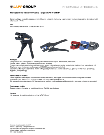 INFORMACJA O PRODUKCIE Narzędzie do odizolowywania i cięcia EASY STRIP Samoregulujące narzędzie z zapasowymi wkładami, ostrzami, elastyczny, ergonomiczny kształt, niezawodne, również do kabli teflonowych i PTFE Info Teraz dostępne również w formie pistoletu (RA ) Korzyści Łatwy w obsłudze, ze względu na automatyczne dostosowanie się do obrabianych przekrojów Szeroki zakres aplikacji dzięki łatwo wymienialnym wkładom Precyzyjna regulacja położenia umożliwia zdjęcie izolacji (również z przewodów o niewielkiej średnicy) bez uszkodzenia żył Długi czas pracy, testowane podczas ponad 150,000 operacji usuwania izolacji Ergonomia: atrakcyjne wzornictwo, miękki uchwyt, zoptymalizowana szerokość uchwytu, głowicy i niska masa gwarantują wygodną, łatwą obsługę Zakres zastosowania Łatwo wyjmowane kasety do zdejmowania izolacji umożliwiają precyzyjne odizolowywanie wielu różnych materiałów izolacyjnych (np. PVC/PTFE) i różnych średnic za pomocą jednego narzędzia Dla przewodów standardowych (90% wszystkich produktów można odizolować bez potrzeby ręcznego ustawienia narzędzia) Budowa produktu Dostępne dwa wykonania - w kształcie pistoletu (RA) lub standardowej Uwaga Nie stosować do obróbki pojedynczych żył MTW 16 mm² Ostania aktualizacja (06.03.2017) ©2017 Lapp Group - all rights reserved. Zarządzanie produktem http://lapppoland.lappgroup.com Aktualne dane w pliku Dane techniczne. PN 0456 / 02_03.16 INFORMACJA O PRODUKCIE Narzędzie do odizolowywania i cięcia EASY STRIP Dane techniczne Klasyfikacja: ETIM 5.0 Class-ID: EC000163 Opis klasy ETIM 5.0: Narzędzie do ściągania izolacji Ważne: Zakres odizolowywania: 0,02 - 16,0 mm² Waga: 136 g Długość: Wymiary całkowite: L x H x W Wersja standardowa: 191x123x20 mm Wersja RA: 144x186x23 mm Info: Możliwość cięcia: Żyły jednodrutowe: do 1,5mm² Żyły giętkie: do 10 mm² Przewody giętkie: - do 10 mm² Wskazówka Fotografie nie mogą być używane do wymiarowania oraz nie stanowią szczegółowego odwzorowania przedstawionych produktów. * Podane ceny to ceny netto bez podatku VAT i dodatkowych opłat. Sprzedaż klientom biznesowym. Krótka instrukcja jest dołączona do produktu, można ją również pobrać z: http://www.lappkabel.com/instructions.html Ostania aktualizacja (06.03.2017) ©2017 Lapp Group - all rights reserved. Zarządzanie produktem http://lapppoland.lappgroup.com Aktualne dane w pliku Dane techniczne. PN 0456 / 02_03.16 Powered by TCPDF (www.tcpdf.org) Oznaczenie wyrobu Dla przekrojów [mm 2 ] Kolor Dla izolacji żył Kształt kasety Wersja standardowa narzędzia z wkładem 61735800 EASY STRIP z kasetą prostą 0,02 - 10 czarny PVC Prosty 61735805 EASY STRIP z kasetą typu V 0,1 - 4 niebieski PTFE etc. Kształt V 61735807 EASY STRIP z kasetą typu O 4 - 16 czerwony PVC Okrągły Wersja narzędzia RA z wkładem 61735813 EASY STRIP RA z kasetą prostą 0,02 - 10 czarny PVC Prosty 61735814 EASY STRIP RA z kasetą typu V 0,1 - 4 niebieski PTFE etc. Kształt V 61735815 EASY STRIP RA EASY STRIP RA z kasetą typu O 4 - 16 czerwony PVC Okrągły 61735801 Kaseta prosta 0,02 - 10 czarny PVC Prosty 61735803 Kaseta V 0,1 - 4 niebieski PTFE etc. Kształt V 61735802 Kaseta typu O 4 - 16 czerwony PVC Okrągły 61735806 Szczęki wspierające EASY STRIP Kasety i elementy zapasowe Narzędzie do odizolowywania i cięcia EASY STRIP Ostania aktualizacja (06.03.2017) ©2017 Lapp Group - all rights reserved. Zarządzanie produktem http://lapppoland.lappgroup.com Aktualne dane w pliku Dane techniczne. PN 0456 / 02_03.16 INFORMACJA O PRODUKCIE Powered by TCPDF (www.tcpdf.org) Numer katalogowy