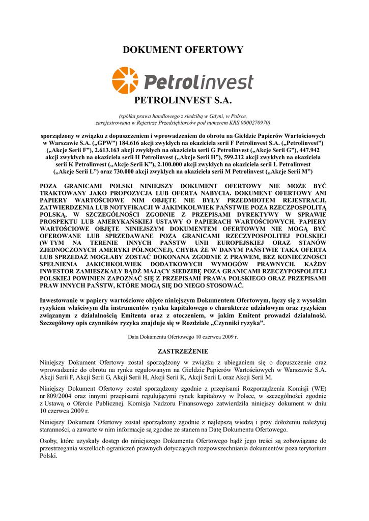 DOKUMENT OFERTOWY PETROLINVEST S.A. (spółka prawa handlowego z siedzibą w Gdyni, w Polsce, zarejestrowana w Rejestrze Przedsiębiorców pod numerem KRS 0000270970) sporządzony w związku z dopuszczeniem i wprowadzeniem do obrotu na Giełdzie Papierów Wartościowych w Warszawie S.A. („GPW”) 184.616 akcji zwykłych na okaziciela serii F Petrolinvest S.A. („Petrolinvest”) („Akcje Serii F”), 2.613.163 akcji zwykłych na okaziciela serii G Petrolinvest („Akcje Serii G”), 447.942 akcji zwykłych na okaziciela serii H Petrolinvest („Akcje Serii H”), 599.212 akcji zwykłych na okaziciela serii K Petrolinvest („Akcje Serii K”), 2.100.000 akcji zwykłych na okaziciela serii L Petrolinvest („Akcje Serii L”) oraz 730.000 akcji zwykłych na okaziciela serii M Petrolinvest („Akcje Serii M”) POZA GRANICAMI POLSKI NINIEJSZY DOKUMENT OFERTOWY NIE MOŻE BYĆ TRAKTOWANY JAKO PROPOZYCJA LUB OFERTA NABYCIA. DOKUMENT OFERTOWY ANI PAPIERY WARTOŚCIOWE NIM OBJĘTE NIE BYŁY PRZEDMIOTEM REJESTRACJI, ZATWIERDZENIA LUB NOTYFIKACJI W JAKIMKOLWIEK PAŃSTWIE POZA RZECZPOSPOLITĄ POLSKĄ, W SZCZEGÓLNOŚCI ZGODNIE Z PRZEPISAMI DYREKTYWY W SPRAWIE PROSPEKTU LUB AMERYKAŃSKIEJ USTAWY O PAPIERACH WARTOŚCIOWYCH. PAPIERY WARTOŚCIOWE OBJĘTE NINIEJSZYM DOKUMENTEM OFERTOWYM NIE MOGĄ BYĆ OFEROWANE LUB SPRZEDAWANE POZA GRANICAMI RZECZYPOSPOLITEJ POLSKIEJ (W TYM NA TERENIE INNYCH PAŃSTW UNII EUROPEJSKIEJ ORAZ STANÓW ZJEDNOCZONYCH AMERYKI PÓŁNOCNEJ), CHYBA ŻE W DANYM PAŃSTWIE TAKA OFERTA LUB SPRZEDAŻ MOGŁABY ZOSTAĆ DOKONANA ZGODNIE Z PRAWEM, BEZ KONIECZNOŚCI SPEŁNIENIA JAKICHKOLWIEK DODATKOWYCH WYMOGÓW PRAWNYCH. KAŻDY INWESTOR ZAMIESZKAŁY BĄDŹ MAJĄCY SIEDZIBĘ POZA GRANICAMI RZECZYPOSPOLITEJ POLSKIEJ POWINIEN ZAPOZNAĆ SIĘ Z PRZEPISAMI PRAWA POLSKIEGO ORAZ PRZEPISAMI PRAW INNYCH PAŃSTW, KTÓRE MOGĄ SIĘ DO NIEGO STOSOWAĆ. Inwestowanie w papiery wartościowe objęte niniejszym Dokumentem Ofertowym, łączy się z wysokim ryzykiem właściwym dla instrumentów rynku kapitałowego o charakterze udziałowym oraz ryzykiem związanym z działalnością Emitenta oraz z otoczeniem, w jakim Emitent prowadzi działalność. Szczegółowy opis czynników ryzyka znajduje się w Rozdziale „Czynniki ryzyka”. Data Dokumentu Ofertowego 10 czerwca 2009 r. ZASTRZEŻENIE Niniejszy Dokument Ofertowy został sporządzony w związku z ubieganiem się o dopuszczenie oraz wprowadzenie do obrotu na rynku regulowanym na Giełdzie Papierów Wartościowych w Warszawie S.A. Akcji Serii F, Akcji Serii G, Akcji Serii H, Akcji Serii K, Akcji Serii L oraz Akcji Serii M. Niniejszy Dokument Ofertowy został sporządzony zgodnie z przepisami Rozporządzenia Komisji (WE) nr 809/2004 oraz innymi przepisami regulującymi rynek kapitałowy w Polsce, w szczególności zgodnie z Ustawą o Ofercie Publicznej. Komisja Nadzoru Finansowego zatwierdziła niniejszy dokument w dniu 10 czerwca 2009 r. Niniejszy Dokument Ofertowy został sporządzony zgodnie z najlepszą wiedzą i przy dołożeniu należytej staranności, a zawarte w nim informacje są zgodne ze stanem na Datę Dokumentu Ofertowego. Osoby, które uzyskały dostęp do niniejszego Dokumentu Ofertowego bądź jego treści są zobowiązane do przestrzegania wszelkich ograniczeń prawnych dotyczących rozpowszechniania dokumentów poza terytorium Polski. SPIS TREŚCI ROZDZIAŁ I CZYNNIKI RYZYKA ............................................................................................................ 4 ROZDZIAŁ II OŚWIADCZENIA ................................................................................................................. 6 ROZDZIAŁ III KAPITAŁY WŁASNE I ZADŁUŻENIE........................................................................... 7 1. Oświadczenie o kapitale obrotowym ....................................................................................................7 2. Kapitały własne i zadłużenie.................................................................................................................9 ROZDZIAŁ IV REGULACJE DOTYCZĄCE RYNKU KAPITAŁOWEGO ........................................ 11 1. Dematerializacja papierów wartościowych dopuszczonych do obrotu na rynku regulowanym.........11 2. Obowiązki informacyjne.....................................................................................................................12 3. Obrót papierami wartościowymi z wykorzystaniem informacji poufnych .........................................12 4. Obowiązki związane z nabywaniem lub zbywaniem akcji w trakcie trwania okresów zamkniętych.12 5. Obowiązki związane z nabywaniem oraz zbywaniem znacznych pakietów akcji ..............................13 6. Podmioty objęte obowiązkami związanymi z posiadaniem znacznych pakietów akcji......................16 7. Żądanie powołania rewidenta do spraw szczególnych........................................................................17 8. Kontrola koncentracji..........................................................................................................................17 ROZDZIAŁ V OPODATKOWANIE .......................................................................................................... 19 1. Zasady opodatkowania podatkiem dochodowym od osób fizycznych oraz podatkiem dochodowym od osób prawnych ...............................................................................................................................19 2. Zasady opodatkowania podatkiem od czynności cywilnoprawnych umów sprzedaży papierów wartościowych ....................................................................................................................................23 3. Zasady opodatkowania podatkiem od spadków i darowizn................................................................24 ROZDZIAŁ VI DANE O EMISJI................................................................................................................ 2