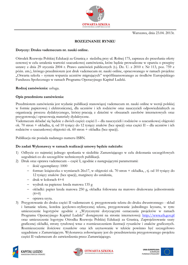 Warszawa, dnia 23.04. 2013r. ROZEZNANIE RYNKU Dotyczy: Druku vademecum nt. nauki online. Ośrodek Rozwoju Polskiej Edukacji za Granicą z siedzibą przy ul. Rolnej 175, zaprasza do przesłania oferty cenowej w celu ustalenia wartości szacunkowej zamówienia, które będzie prowadzone w oparciu o przepisy ustawy z dnia 29 stycznia 2004 r. Prawo zamówień publicznych (t.j. Dz. U. z 2010 r. Nr 113, poz. 759 z późn. zm.), którego przedmiotem jest druk vademecum nt. nauki online, opracowanego w ramach projektu: „Otwarta szkoła – system wsparcia uczniów migrujących” współfinansowanego ze środków Europejskiego Funduszu Społecznego w ramach Programu Operacyjnego Kapitał Ludzki. Rodzaj zamówienia: usługa. Opis przedmiotu zamówienia: Przedmiotem zamówienia jest wydanie publikacji stanowiącej vademecum nt. nauki online w wersji polskiej w formie papierowej i elektronicznej, dla uczniów i ich rodziców oraz nauczycieli odpowiedzialnych za organizację procesu dydaktycznego, którzy pracują z dziećmi w obszarach zasobów internetowych oraz przygotowują i opracowują materiały dydaktyczne. Vademecum składać się będzie z dwóch części: części I – dla nauczycieli i rodziców o szacunkowej objętości ok. 70 stron + okładka, tj. od 10 tysięcy do 12 tysięcy znaków (bez spacji) oraz części II – dla uczniów i ich rodziców o szacunkowej objętości ok. 60 stron + okładka (bez spacji). Publikacja nie posiada nadanego numeru ISBN. Do zadań Wykonawcy w ramach realizacji umowy będzie należało: 1) Odbycie co najmniej jednego spotkania w siedzibie Zamawiającego w celu dokonania szczegółowych uzgodnień co do szczegółów technicznych publikacji. 2) Druk oraz oprawa vademecum – część I, zgodnie z następującymi parametrami: ilość egzemplarzy: 1000 format: książeczka o wymiarach 26x17, w objętości ok. 70 stron + okładka, , tj. od 10 tysięcy do 12 tysięcy znaków (bez spacji), marginesy do ustalenia, druk w kolorach 4+4 wydruk na papierze: kreda matowa 135 g okładki: papier kreda matowa 250 g, okładka foliowana na matowo drukowana jednostronnie (4+0) oprawa szyta. 3) Przygotowanie do druku części II vademecum tj. przygotowanie tekstu do druku dwustronnego - skład i łamanie tekstu, korekta językowo-stylistycznej tekstu, przygotowanie jednolitego leyoutu, w tym: umieszczenie logotypów zgodnie z „Wytycznymi dotyczącymi oznaczania projektów w ramach Programu Operacyjnego Kapitał Ludzki” dostępnymi na stronie internetowej: http://www.efs.gov.pl oraz umieszczenie logotypu Ośrodka Rozwoju Polskiej Edukacji za Granicą. Zaprojektowanie szaty graficznej okładki, strony tytułowej wraz z rozmieszczeniem ilustracji rysunków i znaków graficznych. Rozmieszczenie ilościowe rysunków oraz ich usytuowanie w tekście powinno być szczegółowo uzgadniane z Zamawiającym. Wykonawca zobowiązany jest do przedstawienia przygotowanego projektu części II vademecum do zatwierdzenia przez Zamawiającego. 4) Druk oraz oprawa vademecum – część II, zgodnie z następującymi parametrami: ilość egzemplarzy: 1000 format: książeczka o wymiarach 26x17, w objętości ok. 60 stron + okładka, marginesy do ustalenia, druk w kolorach 4+4 wydruk na papierze: kreda matowa 135 g okładki: papier kreda matowa 250 g, okładka foliowana na matowo drukowana jednostronnie (4+0) oprawa tzw. „zeszytowa”. 5) Przekazanie Zamawiającemu zaakceptowanej wersji publikacji do druku w wersji elektronicznej edytowalnej Word oraz PDF na płycie CD. 6) Dostawa wydrukowanych publikacji „na półkę” do siedziby Zamawiającego. Materiały zniszczone lub niekompletne zostaną odrzucone przez Zamawiającego, a Wykonawca zobowiązuje się dostarczyć pełnowartościowe materiały w ilości wskazanej w umowie. Warunki odbioru przedmiotu zamówienia: a) Materiały muszą zostać dostarczone do siedziby Zamawiającego – dostawa „na półkę”: b) Materiały zniszczone lub niekompletne zostaną odrzucone przez Zamawiającego, a Wykonawca zobowiązuje się dostarczyć pełnowartościowe materiały w ilości wskazanej w umowie. Warunki udziału w postępowaniu: Wykonawca posiada niezbędną wiedzę i doświadczenie, dysponuje odpowiednim potencjałem technicznym oraz osobami zdolnymi do wykonania zamówienia. Wymagany termin realizacji zamówienia: Od dnia podpisania umowy do 3 czerwca 2013r. Warunki płatności Jednorazowo, po wykonaniu całości przedmiotu zamówienia, przelew na konto bankowe. Ofertę proszę przesłać do dnia 27 kwietnia 2013 r. do godz. 10:00 na adres korespondencyjny Zamawiającego (ul. Rolna 175, 02-729 Warszawa) lub na numer faksu +48 22 853 8702 lub adres e-mail: [email protected] z dopiskiem/tytułem: „Oferta na druk vademecum” Oferta powinna zawierać: 1) Nazwę/firmę/Imię i nazwisko i adres Wykonawcy; 2) Informację o rodzaju prowadzonej działalności (działalność wykonywana osobiście, działalność gospodarcza prowadzona przez osobę fizyczną, działalność prowadzona w formie spółki ze wskazaniem nr KRS); 3) Oferowaną cenę (brutto) za realizację zamówienia. 4) Termin realizacji zamówienia, 5) Termin ważności oferty nie krótszy niż 60 dni, licząc od daty złożenia, 6) Warunki płatności (jednorazowo po wykonaniu całości, przelew na konto bankowe); Niniejsze zapytanie ofertowe nie stanowi zobowiązania do zawarcia umowy.