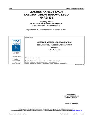 PCA Zakres akredytacji Nr AB 895 ZAKRES AKREDYTACJI LABORATORIUM BADAWCZEGO Nr AB 895 wydany przez POLSKIE CENTRUM AKREDYTACJI 01-382 Warszawa, ul. Szczotkarska 42 Wydanie nr 10 Data wydania: 14 marca 2016 r. Nazwa i adres LUBELSKI WĘGIEL „BOGDANKA” S.A. DZIAŁ KONTROLI JAKOŚCI I LABORATORIUM Bogdanka 21-013 Puchaczów AB 895 Kod identyfikacji dziedziny/przedmiotu badań C/9/P; C/10/P G/9 N/9/P; N/10/P Dziedzina/przedmiot badań: Badania chemiczne i pobieranie próbek powietrza, paliw stałych Badania dotyczące inżynierii środowiska – hałas, drgania Badania właściwości fizycznych i pobieranie próbek powietrza, paliw stałych Wersja strony: A KIEROWNIK DZIAŁU AKREDYTACJI LABORATORIÓW TADEUSZ MATRAS Niniejszy dokument jest załącznikiem do Certyfikatu Akredytacji Nr AB 895 z dnia 14.03.2016 r. Status akredytacji oraz aktualność zakresu akredytacji można potwierdzić na stronie internetowej PCA www.pca.gov.pl Dział Akredytacji Laboratoriów Wydanie nr 10, 14 marca 2016 r. str. 1/6 PCA Zakres akredytacji Nr AB 895 Przedmiot badań/wyrób Środowisko pracy – powietrze Środowisko pracy – pyły Laboratorium Środowiska Pracy Pracownia Analiz Pyłów i Krzemionki Bogdanka, 21-013 Puchaczów Rodzaj działalności/badane cechy/metoda Pobieranie próbek do oceny narażenia zawodowego na pyły przemysłowe - frakcja wdychalna - frakcja respirabilna Metoda dozymetrii indywidualnej Wskaźnik narażenia (z obliczeń) Stężenie pyłu - frakcja wdychalna - frakcja respirabilna Zakres: (0,2 – 52) mg/m3 Metoda wagowa Zawartość wolnej krystalicznej krzemionki Zakres: (1 – 100) % Metoda spektrometrii absorpcyjnej w podczerwieni (IR) Dokumenty odniesienia PN-G-04035:2002+Az1:2005 PN-G-04035:2002+Az1:2005 PN-91/Z-04018/03 IN/LŚP-05 wydanie 2 z dnia 03.09.2015 Wersja strony: A Dział Akredytacji Laboratoriów Wydanie nr 10, 14 marca 2016 r. str. 2/6 PCA Zakres akredytacji Nr AB 895 Przedmiot badań/wyrób Środowisko pracy – hałas Środowisko pracy – drgania działające na organizm człowieka przez kończyny górne Środowisko pracy – drgania mechaniczne o ogólnym działaniu na organizm człowieka Laboratorium Środowiska Pracy Pracownia Drgań Mechanicznych i Hałasu Bogdanka, 21-013 Puchaczów Rodzaj działalności/badane Dokumenty odniesienia cechy/metoda Równoważny poziom dźwięku A PN-N-01307:1994 Maksymalny poziom dźwięku A PN-EN ISO 9612:2011 Zakres: (24 – 137) dB z wyłączeniem metody obejmującej Szczytowy poziom dźwięku C strategię 2 - punkt 10 Zakres: (24 – 137) dB i strategię 3 - punkt 11 Metoda pomiarowa bezpośrednia Poziom ekspozycji na hałas odniesiony do: - 8-godz. dobowego wymiaru czasu pracy - tygodnia pracy (z obliczeń) Skuteczne ważone częstotliwościowo PN-EN ISO 5349-1:2004 przyśpieszenie drgań PN-EN ISO 5349-2:2004 Zakres: (0,1 – 100) m/s2 Metoda pomiarowa bezpośrednia Ekspozycja dzienna, wyrażona w postaci równoważnej energetycznie dla 8-godzin działania sumy wektorowej skutecznych, ważonych częstotliwościowo przyspieszeń drgań, wyznaczonych dla trzech składowych kierunkowych (ahwx, ahwy, ahwz). Ekspozycja trwająca 30 minut i krócej, wyrażona w postaci sumy wektorowej skutecznych, ważonych częstotliwościowo przyspieszeń drgań, wyznaczonych dla trzech składowych kierunkowych (ahwx, ahwy, ahwz) (z obliczeń) Skuteczne ważone częstotliwościowo PN-EN 14253+A1:2011 przyspieszenie drgań Zakres: (0,01 – 100) m/s² Metoda pomiarowa bezpośrednia Ekspozycja dzienna, wyrażona w postaci równoważnego energetycznie dla 8-godzin działania skutecznego, ważonego częstotliwościowo przyspieszenia drgań, dominującego wśród przyspieszeń drgań, wyznaczonych dla trzech składowych kierunkowych z uwzględnieniem właściwych współczynników (1.4awx, 1.4awy, awz). Ekspozycja trwająca 30 minut i krócej, wyrażona w postaci skutecznego, ważonego częstotliwościowo przyspieszenia drgań, dominującego wśród przyspieszeń drgań, wyznaczonych dla trzech składowych kierunkowych z uwzględnieniem właściwych współczynników (1.4awx, 1.4awy, awz) (z obliczeń) Wersja strony: A Dział Akredytacji Laboratoriów Wydanie nr 10, 14 marca 2016 r. str. 3/6 PCA Zakres akredytacji Nr AB 895 Przedmiot badań/wyrób Paliwa stałe – węgiel kamienny Laboratorium Analiz Węgla Bogdanka, 21-013 Puchaczów Rodzaj działalności/badane cechy/metoda Zawartość wilgoci całkowitej Zakres: (0,3 – 25,0) % Metoda wagowa Zawartość wilgoci w próbce analitycznej Zakres: (0,1 – 10,0) % Metoda wagowa Zawartość popiołu Zakres: (0,1 – 35,0) % Metoda wagowa Zawartość siarki całkowitej Zakres: (0,03 – 5,0) % Metoda wysokotemperaturowego spalania z detekcją IR Ciepło spalania Zakres: (14000 – 35000) kJ/kg Metoda kalorymetryczna Wartość opałowa (z obliczeń) Zawartość wilgoci w próbce analitycznej Zakres: (0,1 – 10,0) % Metoda termograwimetryczna Zawartość popiołu Zakres: (0,1 – 35,0) % Metoda termograwimetryczna Zawartość węgla całkowitego Zakres: (12 – 80,0) % Metoda wysokotemperaturowego spalania z detekcją IR Dokumenty odniesienia PN-80/G-04511, pkt. 2.3.2 PN-80/G-04511, pkt. 2.4.1.7a PN-80/G-04512+Az1:2002 PN-G-04584:2001 PN-81/G-04513 PN-G-04560:1998 PN-G-04560:1998 PN-G-04571:1998 Wersja strony: A Dział Akredytacji Laboratoriów Wydanie nr 10, 14 marca 2016 r. str. 4/6 PCA Zakres akredytacji Nr AB 895 Przedmiot badań/wyrób Paliwa stałe – węgiel kamienny Kontrola Jakości Bogdanka, 21-013 Puchaczów Rodzaj działalności/badane cechy/metoda Pobieranie próbek do badań chemicznych i właściwości fizycznych urządzeniem mechanicznym Ręczne pobieranie próbek do badań chemicznych i właściwości fizycznych Dokumenty odniesienia PN-G-04502:2014-11, pkt. 5.3.1.3 PN-90/G-04502, pkt. 3.2.1.3 Wersja strony: A Dział Akredytacji Laboratoriów Wydanie nr 10, 14 marca 2016 r. str. 5/6 PCA Zakres akredytacji Nr AB 895 Wykaz zmian Zakresu Akredytacji Nr AB 895 Status zmian: wersja pi