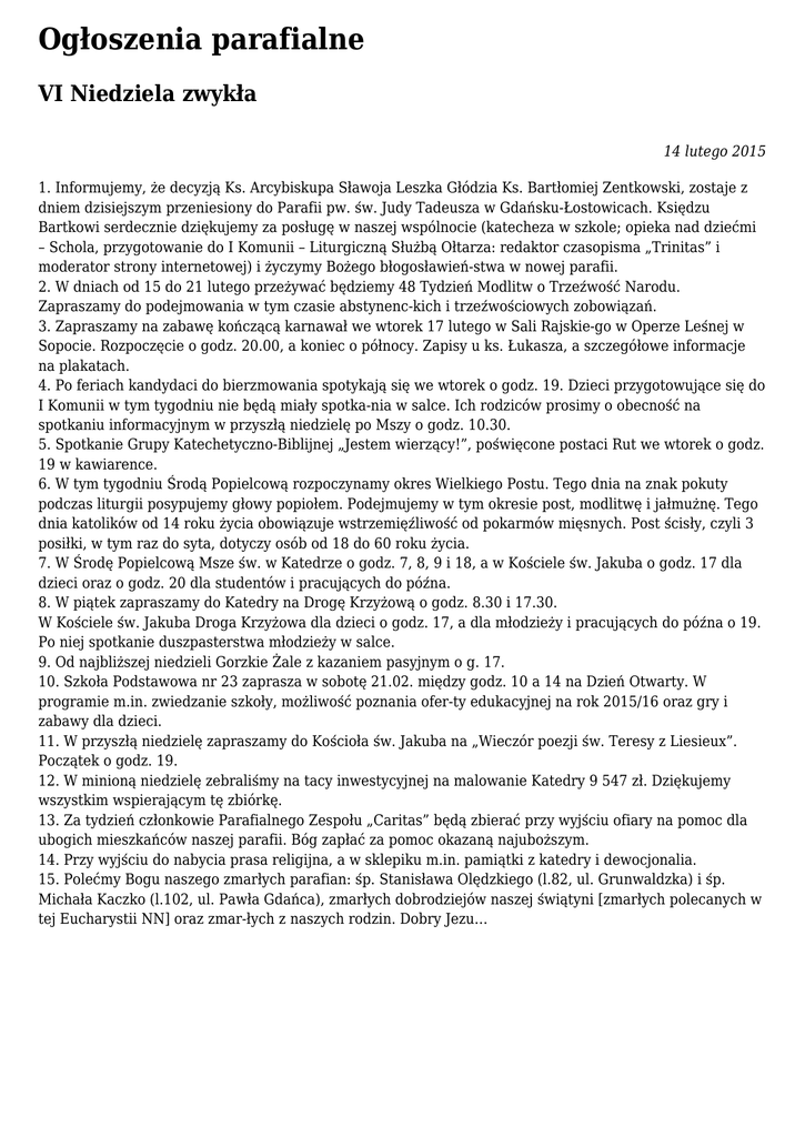 Ogłoszenia parafialne VI Niedziela zwykła 14 lutego 2015 1. Informujemy, że decyzją Ks. Arcybiskupa Sławoja Leszka Głódzia Ks. Bartłomiej Zentkowski, zostaje z dniem dzisiejszym przeniesiony do Parafii pw. św. Judy Tadeusza w Gdańsku-Łostowicach. Księdzu Bartkowi serdecznie dziękujemy za posługę w naszej wspólnocie (katecheza w szkole; opieka nad dziećmi – Schola, przygotowanie do I Komunii – Liturgiczną Służbą Ołtarza: redaktor czasopisma „Trinitas” i moderator strony internetowej) i życzymy Bożego błogosławień-stwa w nowej parafii. 2. W dniach od 15 do 21 lutego przeżywać będziemy 48 Tydzień Modlitw o Trzeźwość Narodu. Zapraszamy do podejmowania w tym czasie abstynenc-kich i trzeźwościowych zobowiązań. 3. Zapraszamy na zabawę kończącą karnawał we wtorek 17 lutego w Sali Rajskie-go w Operze Leśnej w Sopocie. Rozpoczęcie o godz. 20.00, a koniec o północy. Zapisy u ks. Łukasza, a szczegółowe informacje na plakatach. 4. Po feriach kandydaci do bierzmowania spotykają się we wtorek o godz. 19. Dzieci przygotowujące się do I Komunii w tym tygodniu nie będą miały spotka-nia w salce. Ich rodziców prosimy o obecność na spotkaniu informacyjnym w przyszłą niedzielę po Mszy o godz. 10.30. 5. Spotkanie Grupy Katechetyczno-Biblijnej „Jestem wierzący!”, poświęcone postaci Rut we wtorek o godz. 19 w kawiarence. 6. W tym tygodniu Środą Popielcową rozpoczynamy okres Wielkiego Postu. Tego dnia na znak pokuty podczas liturgii posypujemy głowy popiołem. Podejmujemy w tym okresie post, modlitwę i jałmużnę. Tego dnia katolików od 14 roku życia obowiązuje wstrzemięźliwość od pokarmów mięsnych. Post ścisły, czyli 3 posiłki, w tym raz do syta, dotyczy osób od 18 do 60 roku życia. 7. W Środę Popielcową Msze św. w Katedrze o godz. 7, 8, 9 i 18, a w Kościele św. Jakuba o godz. 17 dla dzieci oraz o godz. 20 dla studentów i pracujących do późna. 8. W piątek zapraszamy do Katedry na Drogę Krzyżową o godz. 8.30 i 17.30. W Kościele św. Jakuba Droga Krzyżowa dla dzieci o godz. 17, a dla młodzieży i pracujących do późna o 19. Po niej spotkanie duszpasterstwa młodzieży w salce. 9. Od najbliższej niedzieli Gorzkie Żale z kazaniem pasyjnym o g. 17. 10. Szkoła Podstawowa nr 23 zaprasza w sobotę 21.02. między godz. 10 a 14 na Dzień Otwarty. W programie m.in. zwiedzanie szkoły, możliwość poznania ofer-ty edukacyjnej na rok 2015/16 oraz gry i zabawy dla dzieci. 11. W przyszłą niedzielę zapraszamy do Kościoła św. Jakuba na „Wieczór poezji św. Teresy z Liesieux”. Początek o godz. 19. 12. W minioną niedzielę zebraliśmy na tacy inwestycyjnej na malowanie Katedry 9 547 zł. Dziękujemy wszystkim wspierającym tę zbiórkę. 13. Za tydzień członkowie Parafialnego Zespołu „Caritas” będą zbierać przy wyjściu ofiary na pomoc dla ubogich mieszkańców naszej parafii. Bóg zapłać za pomoc okazaną najuboższym. 14. Przy wyjściu do nabycia prasa religijna, a w sklepiku m.in. pamiątki z katedry i dewocjonalia. 15. Polećmy Bogu naszego zmarłych parafian: śp. Stanisława Olędzkiego (l.82, ul. Grunwaldzka) i śp. Michała Kaczko (l.102, ul. Pawła Gdańca), zmarłych dobrodziejów naszej świątyni [zmarłych polecanych w tej Eucharystii NN] oraz zmar-łych z naszych rodzin. Dobry Jezu…