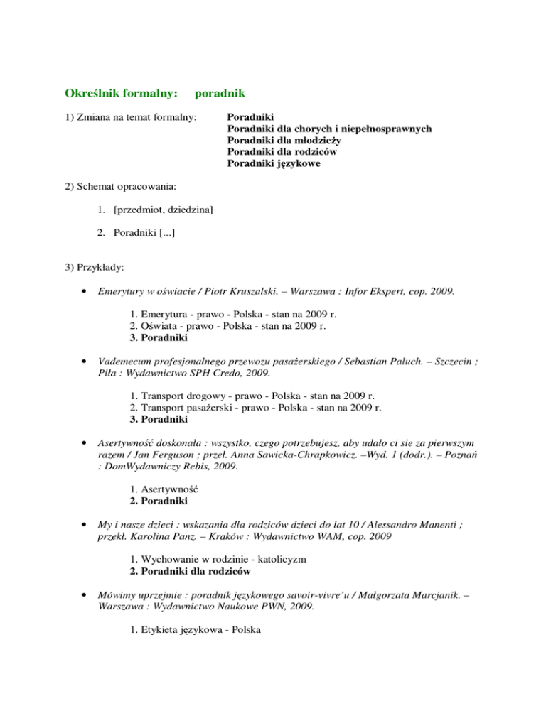 Określnik formalny: poradnik 1) Zmiana na temat formalny: Poradniki Poradniki dla chorych i niepełnosprawnych Poradniki dla młodzieży Poradniki dla rodziców Poradniki językowe 2) Schemat opracowania: 1. [przedmiot, dziedzina] 2. Poradniki [...] 3) Przykłady: • Emerytury w oświacie / Piotr Kruszalski. – Warszawa : Infor Ekspert, cop. 2009. 1. Emerytura - prawo - Polska - stan na 2009 r. 2. Oświata - prawo - Polska - stan na 2009 r. 3. Poradniki • Vademecum profesjonalnego przewozu pasażerskiego / Sebastian Paluch. – Szczecin ; Piła : Wydawnictwo SPH Credo, 2009. 1. Transport drogowy - prawo - Polska - stan na 2009 r. 2. Transport pasażerski - prawo - Polska - stan na 2009 r. 3. Poradniki • Asertywność doskonała : wszystko, czego potrzebujesz, aby udało ci sie za pierwszym razem / Jan Ferguson ; przeł. Anna Sawicka-Chrapkowicz. –Wyd. 1 (dodr.). – Poznań : DomWydawniczy Rebis, 2009. 1. Asertywność 2. Poradniki • My i nasze dzieci : wskazania dla rodziców dzieci do lat 10 / Alessandro Manenti ; przekł. Karolina Panz. – Kraków : Wydawnictwo WAM, cop. 2009 1. Wychowanie w rodzinie - katolicyzm 2. Poradniki dla rodziców • Mówimy uprzejmie : poradnik językowego savoir-vivre’u / Małgorzata Marcjanik. – Warszawa : Wydawnictwo Naukowe PWN, 2009. 1. Etykieta językowa - Polska 2. Poradniki jezykowe • ABC dojrzewania : poradnik dla nastolatków. – Janki k. Warszawy, 2007 1. Miłość – psychologia 2. Pokwitanie 3. Życie seksualne 4. Poradniki dla młodzieży • Panna dorosła w rodzinie i społeczeństwie : podręcznik życia praktycznego dla dziewic polskich wszelkich stanów : opracowany na podstawie licznych źródeł swojskich i obcych ; wskazówki, dotyczące zachowania zdrowia, humoru [...] / Mieczysław Rościszewski. – Warszawa, 1905 1. Dziewczęta – higiena 2. Dziewczęta - wychowanie 3. Gospodarstwo domowe 4. Obyczaje towarzyskie 5. Poradniki dla młodzieży • ABC chorego na cukrzycę / June Biermann, Barbara Toohey. – Warszawa, 2000 1. Cukrzyca 2. Poradniki dla chorych i niepełnosprawnych • Aktywnie szukam pracy /[aut. tekstów Katarzyna Karczmarczyk, Magda Sarnecka]. – Warszawa, 2008 1. Niepełnosprawni - praca - prawo - Polska - stan na 2008 r. 2. Poradniki dla chorych i niepełnosprawnych