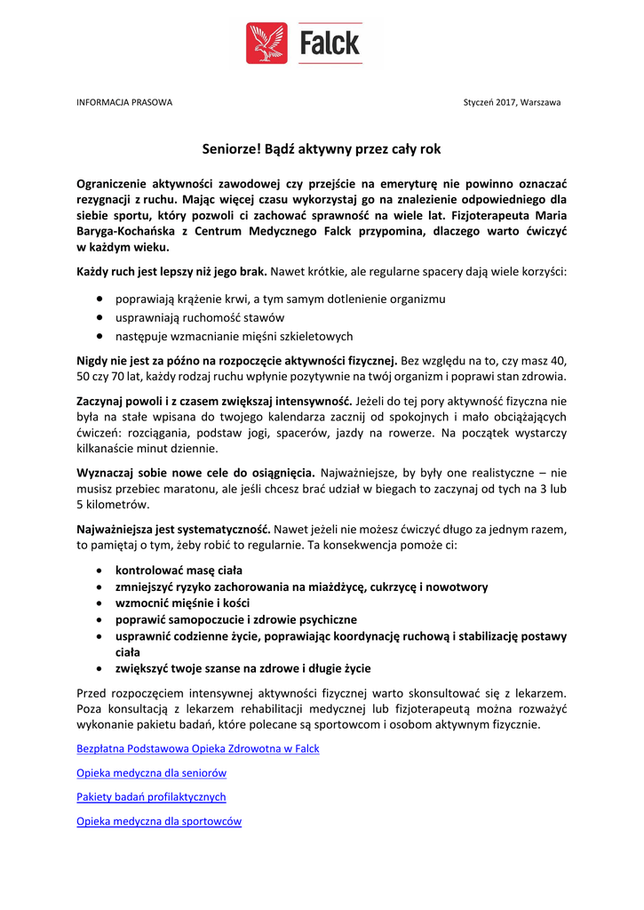INFORMACJA PRASOWA Styczeń 2017, Warszawa Seniorze! Bądź aktywny przez cały rok Ograniczenie aktywności zawodowej czy przejście na emeryturę nie powinno oznaczać rezygnacji z ruchu. Mając więcej czasu wykorzystaj go na znalezienie odpowiedniego dla siebie sportu, który pozwoli ci zachować sprawność na wiele lat. Fizjoterapeuta Maria Baryga-Kochańska z Centrum Medycznego Falck przypomina, dlaczego warto ćwiczyć w każdym wieku. Każdy ruch jest lepszy niż jego brak. Nawet krótkie, ale regularne spacery dają wiele korzyści: poprawiają krążenie krwi, a tym samym dotlenienie organizmu usprawniają ruchomość stawów następuje wzmacnianie mięśni szkieletowych Nigdy nie jest za późno na rozpoczęcie aktywności fizycznej. Bez względu na to, czy masz 40, 50 czy 70 lat, każdy rodzaj ruchu wpłynie pozytywnie na twój organizm i poprawi stan zdrowia. Zaczynaj powoli i z czasem zwiększaj intensywność. Jeżeli do tej pory aktywność fizyczna nie była na stałe wpisana do twojego kalendarza zacznij od spokojnych i mało obciążających ćwiczeń: rozciągania, podstaw jogi, spacerów, jazdy na rowerze. Na początek wystarczy kilkanaście minut dziennie. Wyznaczaj sobie nowe cele do osiągnięcia. Najważniejsze, by były one realistyczne – nie musisz przebiec maratonu, ale jeśli chcesz brać udział w biegach to zaczynaj od tych na 3 lub 5 kilometrów. Najważniejsza jest systematyczność. Nawet jeżeli nie możesz ćwiczyć długo za jednym razem, to pamiętaj o tym, żeby robić to regularnie. Ta konsekwencja pomoże ci: kontrolować masę ciała zmniejszyć ryzyko zachorowania na miażdżycę, cukrzycę i nowotwory wzmocnić mięśnie i kości poprawić samopoczucie i zdrowie psychiczne usprawnić codzienne życie, poprawiając koordynację ruchową i stabilizację postawy ciała zwiększyć twoje szanse na zdrowe i długie życie Przed rozpoczęciem intensywnej aktywności fizycznej warto skonsultować się z lekarzem. Poza konsultacją z lekarzem rehabilitacji medycznej lub fizjoterapeutą można rozważyć wykonanie pakietu badań, które polecane są sportowcom i osobom aktywnym fizycznie. Bezpłatna Podstawowa Opieka Zdrowotna w Falck Opieka medyczna dla seniorów Pakiety badań profilaktycznych Opieka medyczna dla sportowców
