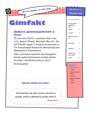 . ie my.. n o t , łego Bo co z Rok 2014 nr 1. Styczeń-luty W tym numerze: Gimfakt Sukces gimnazjalistów z Psar 15 stycznia 2014r. uczniowie klas trzecich: Dawid Ślimok, Mateusz Myrcik i Kamil Pilarski zajęli I miejsce drużynowo w IX Powiatowym Konkursie MatematycznoBankowym w Pawonkowie. Nasi uczniowie wykazali się umiejętnościami wykorzystywania wiedzy ekonomicznej i matematycznej w życiu. Gratulujemy! Sukces gimnazjalistów z Psar 1 WOŚP 2 Trendy 2 Muzyczne top 10 3 Recenzja 4 Kulinaria 5 Piękny jest nasz świat 5 Humor 6 Zawsze w Gimfakcie: • Trendy • Piękny jest nasz świat • Kulinaria • Recenzje książek, filmów Złota myśl na luty Nie powinno się zbyt mocno wierzyć w szansę, którą z łatwością można stracić. James Salter • Humor WOŚP w Gimnazjum w Psarach 12 stycznia 2014r. odbył się finał Wielkiej Orkiestry Świątecznej Pomocy pod hasłem przewodnim „Na ratunek”. Trzydziestu wolontariuszy z naszej szkoły zbierało tym razem pieniądze na zakup specjalistycznego sprzętu dla dziecięcej medycyny ratunkowej i godnej opieki medycznej seniorów. Po raz kolejny mieszkańcy naszej gminy nie zawiedli. W parafii Babienica wolontariusze zebraliśmy kwotę 4696, 06zł, w parafii Lubsza – 2721.05, w Woźnikach 3947.39zł, a Kamieńskich Młynach 1626.19zł. W licytacji uzyskaliśmy 138zł. Na cele Fundacji Wielkiej Orkiestry Świątecznej Pomocy przekazaliśmy 13128,93zł. Mieszkańcy naszej gminy pokazali, że mają dobre serca. Dziękujemy i do zobaczenia za rok. SIE MA J.G. Trendy Ledwie skończyły się zimowe wyprzedaże, a już można poczuć wiosenny powiew (modowy, oczywiście). Nie mniej jednak dziwi mnie, że już w połowie stycznia można było zauważyć pastelowe kolory niemal wszędzie. No cóż, takimi prawami rządzi się świat mody i nic nie da się zrobić (ale jeśli zobaczę kożuszki we wrześniu, to chyba wybuchnę śmiechem). W tym sezonie - ku mojemu wielkiemu zdziwieniu - króluje klasyka! Czyli to, co lubię najbardziej. Oprócz tego nie może zabraknąć zieleni (dla wtajemniczonych: "limonka"), błękitu i purdowego różu, przeurocze. ;) Do łask wraca też jeans oraz czarno-białe pasy. Str. 2 Gimfakt 1. Kim Cesarion – Undressed 2. Martin Garrix / Jay Hardway – Wizard 3. Klingande – Jubel 4. ATB – Face to face 5. Faul & Wad Ad – Changes 6. Shakira / Rihanna – Can’t Remember To Forget You 7. Bob One / Bas Tajpan – Daj z siebie wszystko 8. Armin van Buuren – Save My Night 9. Gorgon City / MNEK – Ready For Your Love 10. Katy Perry – Dark Horse Rok 2014 nr 1. Str. 3 Recenzja książki „Bóg nigdy nie mruga” i z jednej strony wypisz przykrości, które Cię spotkały w ostatnim miesiącu, roku albo życiu. Następnie odwróć kartkę i zapisz piękne chwile oraz wszystkie dobrze rzeczy, z tego samego okresu czasu. Która lista jest dłuższa? Jeśli ta druga, to ta książka jest dla Ciebie. A jeżeli uważasz, że w życiu nic dobrego Cię nie spotkało i nie spotka, to sięgnij po nią jak najprędzej! Tytuł: "Bóg nigdy nie mruga. 50 lekcji na trudniejsze chwile w życiu" Mieliście(lub może macie) takie wrażenie, że podczas Waszych narodzin Bóg mrugnął? Myśleliście, że je przegapił i nigdy nie dowiedział się, że przyszedłeś na tę niesamowitą książkę! świat? Nic z tych rzeczy! Bóg nigdy nie mruga! To, że spotkało Cię wiele przykrości, wcale nie oznacza, że Bóg o Tobie zapomniał. Bo życie jest nie sprawiedliwe, ale i tak jest dobre. Naprawdę! Nie wierzysz? Weź czystą kartkę papieru Str. 4 Książka „Bóg nigdy nie mruga” jest zbiorem pięćdziesięciu felietonów, w których znajdziemy pięćdziesiąt rad na trudniejsze chwile życiu. I nie tylko. Na każde chwile. Ta książka jest owocem wszystkich cierpień autorki, której życie nie szczędziło. I to jest wspaniałym przykładem, że wszystkie cierpienia są po coś. Autorka przeżyła wiele trudnych chwil, ale dzięki temu mamy Książka jest dla każdego. Nie bójcie się słowa "Bóg" w tytule. Owszem, znajdziemy w książce kilka odniesień do religii, wiary czy modlitwy, jednak są one uniwersalne. Felietony zwracają uwagę na to, co w życiu najważniejsze. Zawierają wiele genialnych myśli i świetnych rad. Z tej książki każdy może wynieść coś dla siebie. Nie trzeba się też bać tych "50 lekcji". Spokojnie, nie ma kartkówek ani ocen. Niektóre rzeczy, o których wspomina Autorka, są oczywiste, ale to właśnie jest piękne. Banały są zdecydowanie najlepsze, a tak często o nich zapominamy. 320 stron wspaniałości! „Bóg nigdy nie mruga” działa jak ten spadochron z okładki. W życiu nietrudno o upadek mniejszy lub większy. A książka pozwala powoli, z góry spojrzeć na własne życie i sprawić, by także inni patrzyli na nas jak na kogoś wyjątkowego. A wszystkiemu przypatruje się wielki Bóg, który nigdy, przenigdy nie mruga. Autorka pokazuje, że i ona w przeszłości popełniała błędy. Podczas czytania otwiera się w duszy nowe oko i spogląda na świat pod zupełnie innym kątem... Gimfakt Kulinaria Składniki (kubek o pojemności 300ml): 1 jajko 3 łyżki mleka 3 łyżki oleju 3 łyżki Nutelli 2-3 łyżki cukru 2,5 łyżki kakao szczypta soli 4 łyżki mąki 1-2 łyżeczki cukru waniliowego lub 1/2 łyżeczki cynamonu 1. Do kubka wbić jajko i rozmieszać widelcem. 2. Dodać mleko, olej i Nutellę, energicznie wymieszać. 3. Następnie dodać resztę składników i znów dokładnie wymieszać. 4. Kubek z ciastem wstawić do mikrofalówki, piec na największej mocy mikrofalówki (u mnie 800W) przez 2 minuty. Smacznego! Piękny jest nasz świat Wspaniały tunel kolejowy na Ukrainie, nazwany "Tunelem Miłości". Jak głosi legenda: jeśli para darząca się szczerym uczuciem wypowie życzenie w tunelu, wówczas na pewno się ono spełni. Rok 2014 nr 1. Str. 5 Jeśli chciałbyś tworzyć z nami te gazetkę… zapraszamy do kółka dziennikarskiego! Osoby ch