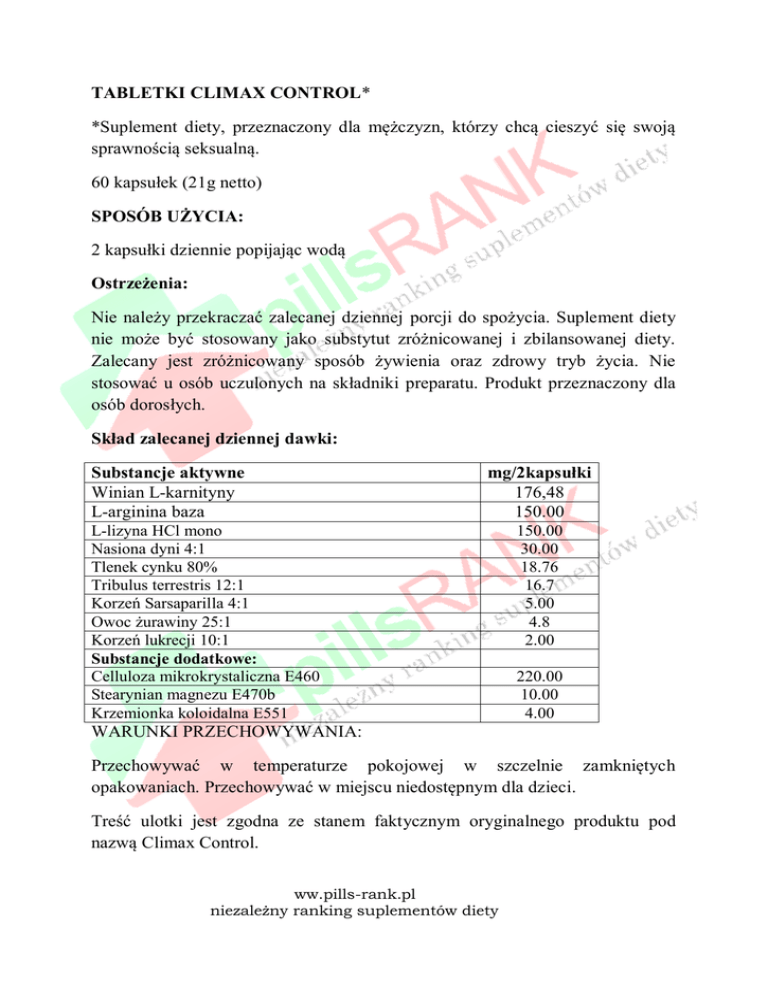 TABLETKI CLIMAX CONTROL* *Suplement diety, przeznaczony dla mężczyzn, którzy chcą cieszyć się swoją sprawnością seksualną. 60 kapsułek (21g netto) SPOSÓB UŻYCIA: 2 kapsułki dziennie popijając wodą Ostrzeżenia: Nie należy przekraczać zalecanej dziennej porcji do spożycia. Suplement diety nie może być stosowany jako substytut zróżnicowanej i zbilansowanej diety. Zalecany jest zróżnicowany sposób żywienia oraz zdrowy tryb życia. Nie stosować u osób uczulonych na składniki preparatu. Produkt przeznaczony dla osób dorosłych. Skład zalecanej dziennej dawki: Substancje aktywne Winian L-karnityny L-arginina baza mg/2kapsułki 176,48 150.00 L-lizyna HCl mono Nasiona dyni 4:1 Tlenek cynku 80% Tribulus terrestris 12:1 Korzeń Sarsaparilla 4:1 Owoc żurawiny 25:1 Korzeń lukrecji 10:1 Substancje dodatkowe: Celluloza mikrokrystaliczna E460 Stearynian magnezu E470b Krzemionka koloidalna E551 150.00 30.00 18.76 16.7 5.00 4.8 2.00 220.00 10.00 4.00 WARUNKI PRZECHOWYWANIA: Przechowywać w temperaturze pokojowej w szczelnie zamkniętych opakowaniach. Przechowywać w miejscu niedostępnym dla dzieci. Treść ulotki jest zgodna ze stanem faktycznym oryginalnego produktu pod nazwą Climax Control. ww.pills-rank.pl niezależny ranking suplementów diety