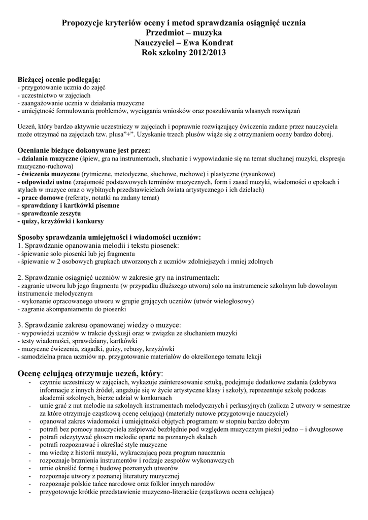 Propozycje kryteriów oceny i metod sprawdzania osiągnięć ucznia Przedmiot – muzyka Nauczyciel – Ewa Kondrat Rok szkolny 2012/2013 Bieżącej ocenie podlegają: - przygotowanie ucznia do zajęć - uczestnictwo w zajęciach - zaangażowanie ucznia w działania muzyczne - umiejętność formułowania problemów, wyciągania wniosków oraz poszukiwania własnych rozwiązań Uczeń, który bardzo aktywnie uczestniczy w zajęciach i poprawnie rozwiązujący ćwiczenia zadane przez nauczyciela może otrzymać na zajęciach tzw. plusa”+”. Uzyskanie trzech plusów wiąże się z otrzymaniem oceny bardzo dobrej. Ocenianie bieżące dokonywane jest przez: - działania muzyczne (śpiew, gra na instrumentach, słuchanie i wypowiadanie się na temat słuchanej muzyki, ekspresja muzyczno-ruchowa) - ćwiczenia muzyczne (rytmiczne, metodyczne, słuchowe, ruchowe) i plastyczne (rysunkowe) - odpowiedzi ustne (znajomość podstawowych terminów muzycznych, form i zasad muzyki, wiadomości o epokach i stylach w muzyce oraz o wybitnych przedstawicielach świata artystycznego i ich dziełach) - prace domowe (referaty, notatki na zadany temat) - sprawdziany i kartkówki pisemne - sprawdzanie zeszytu - quizy, krzyżówki i konkursy Sposoby sprawdzania umiejętności i wiadomości uczniów: 1. Sprawdzanie opanowania melodii i tekstu piosenek: - śpiewanie solo piosenki lub jej fragmentu - śpiewanie w 2 osobowych grupkach utworzonych z uczniów zdolniejszych i mniej zdolnych 2. Sprawdzanie osiągnięć uczniów w zakresie gry na instrumentach: - zagranie utworu lub jego fragmentu (w przypadku dłuższego utworu) solo na instrumencie szkolnym lub dowolnym instrumencie melodycznym - wykonanie opracowanego utworu w grupie grających uczniów (utwór wielogłosowy) - zagranie akompaniamentu do piosenki 3. Sprawdzanie zakresu opanowanej wiedzy o muzyce: - wypowiedzi uczniów w trakcie dyskusji oraz w związku ze słuchaniem muzyki - testy wiadomości, sprawdziany, kartkówki - muzyczne ćwiczenia, zagadki, guizy, rebusy, krzyżówki - samodzielna praca uczniów np. przygotowanie materiałów do określonego tematu lekcji Ocenę celującą otrzymuje uczeń, który: - - czynnie uczestniczy w zajęciach, wykazuje zainteresowanie sztuką, podejmuje dodatkowe zadania (zdobywa informacje z innych źródeł, angażuje się w życie artystyczne klasy i szkoły), reprezentuje szkołę podczas akademii szkolnych, bierze udział w konkursach umie grać z nut melodie na szkolnych instrumentach melodycznych i perkusyjnych (zalicza 2 utwory w semestrze za które otrzymuje cząstkową ocenę celującą) (materiały nutowe przygotowuje nauczyciel) opanował zakres wiadomości i umiejętności objętych programem w stopniu bardzo dobrym potrafi bez pomocy nauczyciela zaśpiewać bezbłędnie pod względem muzycznym pieśni jedno – i dwugłosowe potrafi odczytywać głosem melodie oparte na poznanych skalach potrafi rozpoznawać i określać style muzyczne ma wiedzę z historii muzyki, wykraczającą poza program nauczania rozpoznaje brzmienia instrumentów i rodzaje zespołów wykonawczych umie określić formę i budowę poznanych utworów rozpoznaje utwory z poznanej literatury muzycznej rozpoznaje polskie tańce narodowe oraz folklor innych narodów przygotowuje krótkie przedstawienie muzyczno-literackie (cząstkowa ocena celująca) Ocenę bardzo dobrą otrzymuje uczeń, który: - wykazuje aktywną postawę w pracach indywidualnych i zespołowych potrafi bez pomocy nauczyciela zaśpiewać poprawnie pod względem muzycznym pieśni jednogłosowe posługuje się zapisem nutowym w śpiewie i grze na szkolnych instrumentach potrafi tworzyć proste akompaniamenty melodyczno-rytmiczne do poznanych piosenek rozpoznaje utwory literatury obowiązkowej opanował wiedzę z historii muzyki określoną programem nauczania rozpoznaje podstawowe instrumenty i formy muzyczne rozpoznaje polskie tańce ludowe i umie powtórzyć ich charakterystyczne rytmy uzyskuje bardzo dobre i dobre oceny cząstkowe starannie wykonuje prace plastyczno-muzyczne Ocenę dobrą otrzymuje uczeń, który: - opanował zakres programowy w stopniu średnim, zwykle pracuje systematyczne i efektywnie indywidualnie i w grupie potrafi przy pomocy nauczyciela zaśpiewać poprawnie pod względem muzycznym pieśni jednogłosowe potrafi odczytać przy pomocy nut proste tematy melodyczno-rytmiczne rozpoznaje niektóre utwory z literatury obowiązkowej rozpoznaje niektóre instrumenty i formy muzyczne rozpoznaje polskie tańce narodowe najczęściej otrzymuje dobre oceny cząstkowe Ocenę dostateczną otrzymuje uczeń, który: - potrafi przy pomocy nauczyciela zaśpiewać kilka pieśni, utrzymując tonacje i rytm opanował podstawowe wiadomości z historii muzyki niezbyt chętnie podejmuje wszelkie działania i nie zawsze pracuje systematycznie rzadko uczestniczy w pracach zespołowych i grupowych rozpoznaje niektóre motywy muzyczne z twórczości słynnych kompozytorów rozpoznaje brzmienie niektórych instrumentów rozpoznaje niektóre tańce ludowe czasami poprawnie formułuje wnioski Ocenę dopuszczającą otrzymuje uczeń, który: - opanował zakres wiedzy w stopniu elementarnym ma problemy z intonacją i dykcją podczas śpiewania niestarannie powtarza głosem kilka prostych wzorów melodycznych nie pracuje systematycznie i niezbyt chętnie podejmuje działania biernie uczestniczy w dyskusjach i zadaniach wykonywanych na lekcjach Ocenę niedostateczną otrzymuje uczeń, który: - pomimo starań nauczyciela nie przejawiał zainteresowania przedmiotem oraz żadnej aktywności na lekcjach muzyki nie opanował żadnych umiejętności muzycznych nie potrafi, nawet przy pomocy nauczyciela, zaśpiewać żadnej piosenki nie opanował minimum wiadomości określonych programem nauczania nie prowadzi zeszytu do przedmiotu nie bierze udziału w zadaniach twórczych oraz nie wykazuje żadnej chęci do poprawy swojej oceny