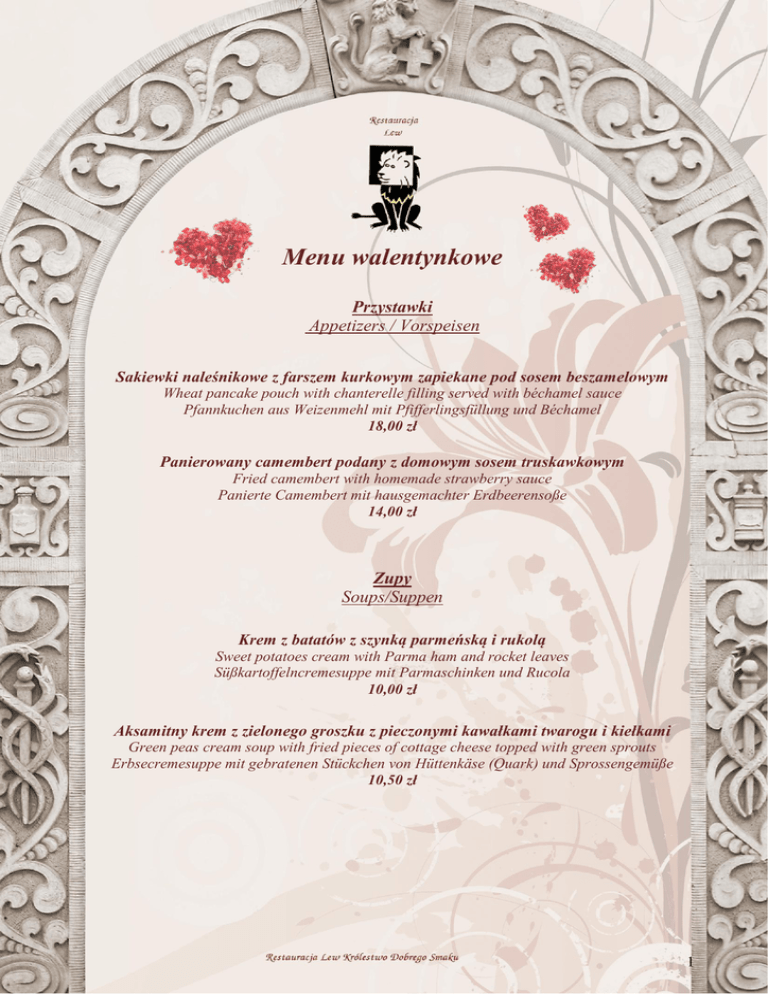 Menu walentynkowe Przystawki Appetizers / Vorspeisen Sakiewki naleśnikowe z farszem kurkowym zapiekane pod sosem beszamelowym Wheat pancake pouch with chanterelle filling served with béchamel sauce Pfannkuchen aus Weizenmehl mit Pfifferlingsfüllung und Béchamel 18,00 zł Panierowany camembert podany z domowym sosem truskawkowym Fried camembert with homemade strawberry sauce Panierte Camembert mit hausgemachter Erdbeerensoße 14,00 zł Zupy Soups/Suppen Krem z batatów z szynką parmeńską i rukolą Sweet potatoes cream with Parma ham and rocket leaves Süßkartoffelncremesuppe mit Parmaschinken und Rucola 10,00 zł Aksamitny krem z zielonego groszku z pieczonymi kawałkami twarogu i kiełkami Green peas cream soup with fried pieces of cottage cheese topped with green sprouts Erbsecremesuppe mit gebratenen Stückchen von Hüttenkäse (Quark) und Sprossengemüße 10,50 zł 1 Dania główne Main dishes/Hauptgerichte Wołowe bitki z jałowcem z purée z selera i ziemniaków, carpaccio z buraków Tender beef cutlets with juniper with celery and potato purée, beetroot carpaccio Geklopfte Koteletts vom Rind mit Wacholder dazu Sellerie- und Kartoffelpüree und roten Rüben-Carpaccio 30,00 zł Filet z indyka marynowany w rozmarynie i soku z limonki w sosie morelowym podawany z jabłkiem faszerowanym orzechami i serem pleśniowym, ziemniakami puree oraz mieszanką zielonych sałat Turkey fillet marinated in rosemary and lime juice in apricot sauce served with apple filled with walnuts and blue cheese, potato puree, green salad mix Im Rosmarin und Limonesaft marinierte Putefilet in der Aprikosesoße dazu Apfel mit Blauschimmelkäse- und Walnüssefüllung, Kartoffelpüree und Salatmix 35,00 zł Polędwiczki wieprzowe w szynce parmeńskiej z pieczoną pietruszką i gruszką, serwowane na liściach szpinaku wraz z opiekanymi ziemniakami Port tenderloin in Prosciutto di Parma with roasted pear and parsley served on spinach leaves with roasted potato wedges Schweinelende in Parmaschinken mit gebackener Petersilienwurzel und Birne serviert auf Spinatblättern mit geröstete Kartoffeln 39,00 zł Sałatki Salads / Salate Mix sałat zielonych z kurczakiem w sezamie i sosem jogurtowo-miodowym Mix of green lettuce leaves with chicken breast in sesame and honey yoghurt sauce Gemischter Salat mit Hähnchen im Sesammantel und Honig-Joghurt-Soße 26,00zł Sałatka z liści młodego szpinakuz serem brie i sosem z malin Fresh spinach leaves in a raspberry sauce with brie cheese Frische Spinatblätter in einer Himbeersauce mit Brie-Käse 26,00zł 2 Desery Desserts / Nachspeisen Lody na ostro (duża gałka lodów śmietankowych w pikantnej otulinie z sezamu z czekoladowym sosem balsamicznym) Spicy Ice Cream (Large scoop of creamy ice in a spicy sesame coated with chocolate balsamicosauce) Würziges Eis (Große Sahneeiskugel in würzigem Sesammantel dazu Schokolade-BalsamicoSoße) 15,00zł Torcik czekoladowy z wiśniami Chocolate-cherry cake / Schokoladentorte mit Kirschen 10,00zł Napoje rozgrzewające Warm-up drinks / Wärmende Getränke Herbata cytrusowo-korzenna Citrus-spicy tea (with ginger, honey) Würziger Zitronentee mit Ingwer und Honig 8,00zł Prawdziwa gorąca czekolada Hot chocolate / Heißse Schokolade 10,00zł Grzaniec piwny z miodem przyprawiony kardamonem, cynamonem i goździkami Mulled beer (with cardamom, honey, cinnamon, cloves) Heißses Bier (mit Honig, Zimt, Gewürznelken, Kardamom) 10,00zł Grzane wino z migdałami i pomarańczami 250 ml / 1000 ml Mulled wine served with almonds and oranges Glühwein mit Mandeln und Orangen serviert 15,00zł / 60,00 zł 3