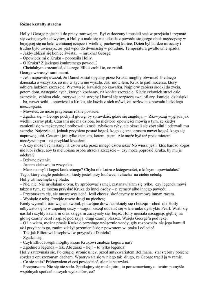 Różne kształty strachu Holly i George pojechali do pracy tramwajem. Był zatłoczony i musieli stać w przejściu i trzymać się zwisających uchwytów, a Holly o mało się nie udusiła z powodu stojącego obok mężczyzny w bujającej się na boki wełnianej czapce i wielkiej puchowej kurtce. Dzień był bardzo mroczny i trudno było uwierzyć, że jest wpół do dwunastej w południe. Temperatura gwałtownie spadła. – Jakby zbliżał się koniec świata... – mruknął George. – Opowiedz mi o Kruku – poprosiła Holly. – O Kruku? Z jakiegoś konkretnego powodu? – Chciałabym zrozumieć, dlaczego Elliot zrobił to, co zrobił. George wzruszył ramionami. – Jeśli naprawdę uważał, że Daniel został opętany przez Kruka, mógłby obwiniać biednego dzieciaka o wszystko, co mu w życiu nie wyszło. Jak mówiłem, Kruk to padlinożerca, który odbiera ludziom szczęście. Wyrywa je kawałek po kawałku. Najpierw zabiera środki do życia, potem dom, następnie tych, których kochamy, na koniec szczęście. Kiedy człowiek straci całe szczęście, zabiera ciało, rozrywa je na strzępy i karmi się rozpaczą swej ofi ary. Istnieją dziesiątki – ba, nawet setki – opowieści o Kruku, ale każda z nich mówi, że rozkwita z powodu ludzkiego nieszczęścia. – Mówiłeś, że może przybierać różne postacie. – Zgadza się. – George pochylił głowę, by sprawdzić, gdzie się znajdują. – Zazwyczaj wygląda jak wielki, czarny ptak. Czasami nie ma dzioba, bo niektóre opowieści mówią o tym, że kiedyś zamienił się w mężczyznę i próbował ukraść rybakom ryby, ale okazali się zbyt silni i oderwali mu szczękę. Najczęściej jednak przybiera postać kogoś, kogo się zna, czasem nawet kogoś, kogo się naprawdę lubi. Czasami jest tylko cieniem, kotem, psem. Ale może być też przedmiotem nieożywionym – na przykład krzesłem. – A czy może być nasłany na człowieka przez innego człowieka? No wiesz, jeśli ktoś bardzo kogoś nie lubi i chce, aby ta nielubiana osoba utraciła szczęście – czy może poprosić Kruka, by mu je odebrał? – Dziwne pytanie. – Jestem ciekawa, to wszystko. – Masz na myśli kogoś konkretnego? Chyba nie Lutza z księgowości, o którym opowiadałaś? Tego, który ciągle podchodzi, kiedy jesteś przy lodówce, i chucha na ciebie cebulą. Holly uśmiechnęła się blado. – Nie, nie. Nie myślałam o tym, by spróbować samej, zastanawiałam się tylko, czy legenda mówi także o tym, że można przysłać Kruka do innej osoby – z zemsty albo innego powodu... – Przepraszam cię, ale muszę wysiadać. Jeśli chcesz, skończymy tę rozmowę innym razem. – Wysiądę z tobą. Przejdę resztę drogi na piechotę. Kiedy wysiedli, tramwaj zadzwonił, podwójne drzwi zamknęły się i bucząc – choć dla Holly odbywało się to w zupełnej ciszy – wagon zaczął oddalać się w kierunku dystryktu Pearl. Wiatr się nasilał i szyldy kawiarni oraz księgarni zaczynały się bujać. Holly musiała naciągnąć głębiej na głowę czarny beret i zapiąć pod szyją długi czarny płaszcz. Wzięła George’a pod rękę. – O ile wiem, można prosić Kruka o przysługę wyłącznie wtedy, gdy rozpoznało się jego kamufl aż i przyłapało go, zanim zdążył przemienić się z powrotem w ptaka i odlecieć. – Tak jak Elliotowi Josephowi w przypadku Daniela? – Zgadza się. – Czyli Elliot Joseph mógłby kazać Krukowi znaleźć kogoś z nas? – Zgodnie z legendą – tak. Ale zaraz – hej! – to tylko legenda! Holly zatrzymała się. Po drugiej stronie ulicy, przed antykwariatem Bellmana, stał srebrny porsche spyder z opuszczonym dachem. Wpatrywała się w niego tak długo, że George trącił ją w ramię. – Co się stało? Próbowałem ci coś powiedzieć, ale nie patrzyłaś. – Przepraszam. Nic się nie stało. Spotkajmy się może jutro, to porozmawiamy o twoim pomyśle wspólnych spotkań naszych wydziałów, co? – Zajrzę do terminarza i zawiadomię cię telefonicznie. Uważaj na siebie... wyglądasz, jakby potrzebna ci była fi liżanka mocnej kawy. Holly wspięła się na palce i pocałowała go w policzek. – Porozmawiamy potem, dobrze? George niczym duch zniknął za błyszczącymi szklanymi drzwiami wejściowymi budynku, w którym pracował, a Holly stała dalej bez ruchu i wpatrywała się w porsche. Był to ten sam model, pochodził z tego samego roku i był w takim samym kolorze jak auto, w którym w 1955 roku zginął James Dean. Młody aktor był idolem jej męża i David kupił sobie niemal identyczny samochód. W nim właśnie zginął. Samochód stał na Salmon Street, przed ulubionym antykwariatem Davida, jakby cofnięto o sześć i pół roku kartki kalendarza, a David żył i siedział w środku, przerzucając kartki książek o historii kina. Nie oglądaj się za siebie Przeszła przez ulicę i osłaniając oczy dłonią, zajrzała do wnętrza antykwariatu przez okno wystawowe, w środku było jednak zbyt ciemno, by dostrzec coś więcej niż przesuwające się cienie. Podeszła do samochodu. Jego widok sprawił, że poczuła się, jakby nagle zanurzono ją po szyję w zimnej wodzie. Wyprodukowano jedynie dziewięćdziesiąt sztuk tego modelu, a na rynek trafi ło siedemdziesiąt osiem, istniało więc spore prawdopodobieństwo, że był to samochód Davida – naprawiony i polakierowany na nowo. Na tylnym siedzeniu leżał owinięty w celofan wielki bukiet żółtych róż. Holly nienawidziła tego samochodu. David kupił go za spadek po ciotce z Forest Grove. Mogli wykorzystać te pieniądze na dom, kiedy jednak David dowiedział się, że wystawiono porsche na aukcję, natychmiast złożył ofertę. Jeździł, zawsze rycząc silnikiem i szaleńczo piszcząc oponami. „Wiesz, Jimmy twierdził, że w tym draniu są tylko dwa biegi – postój i banzai” – mawiał. Sposób, w jaki mówił o „Jimmym”, mógł sugerować, że James Dean był jego najlepszym kumple