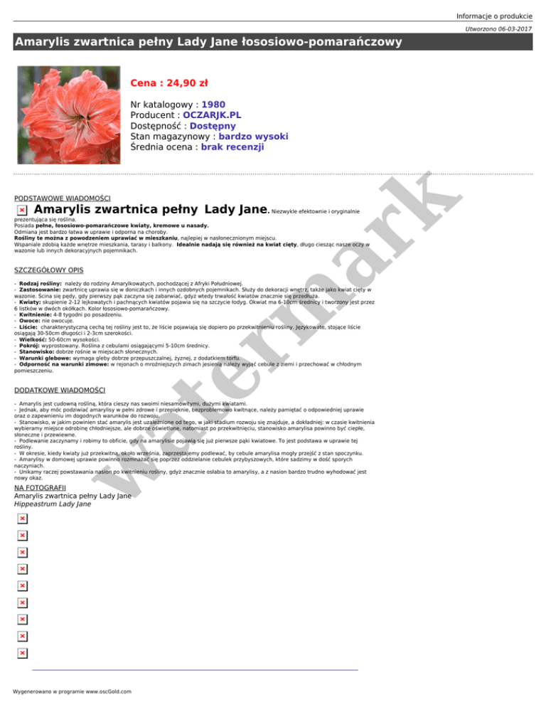 Informacje o produkcie Utworzono 06-03-2017 Amarylis zwartnica pełny Lady Jane łososiowo-pomarańczowy Cena : 24,90 zł PODSTAWOWE WIADOMOŚCI er m ar k Nr katalogowy : 1980 Producent : OCZARJK.PL Dostępność : Dostępny Stan magazynowy : bardzo wysoki Średnia ocena : brak recenzji Amarylis zwartnica pełny Lady Jane. Niezwykle efektownie i oryginalnie prezentująca się roślina. Posiada pełne, łososiowo-pomarańczowe kwiaty, kremowe u nasady. Odmiana jest bardzo łatwa w uprawie i odporna na choroby. Rośliny te można z powodzeniem uprawiać w mieszkaniu, najlepiej w nasłonecznionym miejscu. Wspaniale zdobią każde wnętrze mieszkania, tarasy i balkony. Idealnie nadają się również na kwiat cięty, długo ciesząc nasze oczy w wazonie lub innych dekoracyjnych pojemnikach. SZCZEGÓŁOWY OPIS - Rodzaj rośliny: należy do rodziny Amarylkowatych, pochodzącej z Afryki Południowej. - Zastosowanie: zwartnicę uprawia się w doniczkach i innych ozdobnych pojemnikach. Służy do dekoracji wnętrz, także jako kwiat cięty w wazonie. Ścina się pędy, gdy pierwszy pąk zaczyna się zabarwiać, gdyż wtedy trwałość kwiatów znacznie się przedłuża. - Kwiaty: skupienie 2-12 lejkowatych i pachnących kwiatów pojawia się na szczycie łodyg. Okwiat ma 6-10cm średnicy i tworzony jest przez 6 listków w dwóch okółkach. Kolor łososiowo-pomarańczowy. - Kwitnienie: 4-8 tygodni po posadzeniu. - Owoce: nie owocuje. - Liście: charakterystyczną cechą tej rośliny jest to, że liście pojawiają się dopiero po przekwitnieniu rośliny. Językowate, stojące liście osiągają 30-50cm długości i 2-3cm szerokości. - Wielkość: 50-60cm wysokości. - Pokrój: wyprostowany. Roślina z cebulami osiągającymi 5-10cm średnicy. - Stanowisko: dobrze rośnie w miejscach słonecznych. - Warunki glebowe: wymaga gleby dobrze przepuszczalnej, żyznej, z dodatkiem torfu. - Odporność na warunki zimowe: w rejonach o mroźniejszych zimach jesienią należy wyjąć cebule z ziemi i przechować w chłodnym pomieszczeniu. DODATKOWE WIADOMOŚCI w at - Amarylis jest cudowną rośliną, która cieszy nas swoimi niesamowitymi, dużymi kwiatami. - Jednak, aby móc podziwiać amarylisy w pełni zdrowe i przepięknie, bezproblemowo kwitnące, należy pamiętać o odpowiedniej uprawie oraz o zapewnieniu im dogodnych warunków do rozwoju. - Stanowisko, w jakim powinien stać amarylis jest uzależnione od tego, w jaki stadium rozwoju się znajduje, a dokładniej: w czasie kwitnienia wybieramy miejsce odrobinę chłodniejsze, ale dobrze oświetlone, natomiast po przekwitnięciu, stanowisko amarylisa powinno być ciepłe, słoneczne i przewiewne. - Podlewanie zaczynamy i robimy to obficie, gdy na amarylisie pojawią się już pierwsze pąki kwiatowe. To jest podstawa w uprawie tej rośliny. - W okresie, kiedy kwiaty już przekwitną, około września, zaprzestajemy podlewać, by cebule amarylisa mogły przejść z stan spoczynku. - Amarylisy w domowej uprawie powinno rozmnażać się poprzez oddzielanie cebulek przybyszowych, które sadzimy w dość sporych naczyniach. - Unikamy raczej powstawania nasion po kwitnieniu rośliny, gdyż znacznie osłabia to amarylisy, a z nasion bardzo trudno wyhodować jest nowy okaz. NA FOTOGRAFII Amarylis zwartnica pełny Lady Jane Hippeastrum Lady Jane Wygenerowano w programie www.oscGold.com DLACZEGO WARTO KUPIĆ ROŚLINY U NAS - Wszystkie cebule i kłącza staramy się dostarczać w bardzo dobrym stanie, zdrowe i zadbane. Dokładamy wszelkich starań, aby wygląd materiału sadzeniowego spełniał Państwa oczekiwania. Poza tym na większości stron naszych ofert na ostatnim zdjęciu poniżej przedstawiamy wygląd przykładowych rzeczywistych cebul oraz kłączy, aby każdy mógł zobaczyć co kupuje. - W okresie zimowym, wczesnowiosennym lub późnojesiennym możliwe są braki poszczególnych gatunków, co naturalnie związane jest z sezonem wegetacyjnym roślin. - Cebule, kłącza w ilościach jednostkowych przeważnie wysyłane są w kopertach bąbelkowych lub pudełkach kartonowych jako listy dla zminimalizowania kosztu wysyłki. W większych ilościach wysłane są jako paczki. - Cebule sprzedawane są po 1 szt. dużej cebuli. w at er m ar k KONIECZNIE ZOBACZ