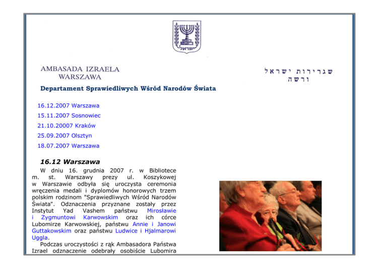 Departament Sprawiedliwych Wśród Narodów Świata 16.12.2007 Warszawa 15.11.2007 Sosnowiec 21.10.20007 Kraków 25.09.2007 Olsztyn 18.07.2007 Warszawa 16.12 Warszawa W dniu 16. grudnia 2007 r. w Bibliotece m. st. Warszawy prezy ul. Koszykowej w Warszawie odbyła się uroczysta ceremonia wręczenia medali i dyplomów honorowych trzem polskim rodzinom "Sprawiedliwych Wśród Narodów Świata". Odznaczenia przyznane zostały przez Instytut Yad Vashem państwu Mirosławie i Zygmuntowi Karwowskim oraz ich córce Lubomirze Karwowskiej, państwu Annie i Janowi Guttakowskim oraz państwu Ludwice i Hjalmarowi Uggla. Podczas uroczystości z rąk Ambasadora Państwa Izrael odznaczenie odebrały osobiście Lubomira Karwowska i Ludwik Uggla, natomiast w imieniu nieżyjących państwa Guttakowskich medal odebrał ich wnuk – Zbigniew Surowiński. Specjalnie na tę uroczystość przyleciał do Polski razem z rodziną pan Cass Lewart (Kazimierz Lewartowicz), jeden z uratowanych przez państwo Uggla. Program Zapraszamy do galerii zdjęć z uroczystości. 15.11 Sosnowiec W dniu 15. listopada 2007 r. Ambasador Izraela wręczył medale i dyplomy "Sprawiedliwych Wśród Narodów Świata" kolejnym polskim rodzinom. Odznaczeniem Yad Vashem pośmiertnie uhonorowano panią Romanę Iżycką-Fedorską., państwo Janinę i Tadeusza Górskich oraz państwo Mariannę i Piotra Zmarzłych. Uroczystość miała miejsce Pałacu Schoena – Muzeum w Sosnowcu. Ceremonię uświetnił koncert piosenek żydowskich krakowskiej artystki Urszuli Makosz. Zapraszamy do galerii zdjęć, za których udostępnienie dziękujemy panu Leszkowi Wolskiemu. 21.10 Kraków 21. października 2007 r. w Synagodze Wysokiej w Krakowie miała miejsce uroczysta ceremonia nadania medali i dyplomów honorowych "Sprawiedliwi Wśród Narodów Świata". Odznaczenia Instytutu Yad Vashem w Jerozolimie otrzymali Zofia i Maciej Dudzik (pośmiertnie). Medale wręczał Ambasador Izraela w Polsce David Peleg. Zdjęcia z uroczystości dostępne są w wirtualnej galerii Ambasady. Historie osób odznaczonych można przeczytać tutaj. 25.09 Olsztyn 25. września w Muzeum Warmii i Mazur na zamku olsztyńskim odbyła się uroczysta ceremonia nadania tytułu "Sprawiedliwi Wśród Narodów Świata" państwu Alfredzie i Bolesławowi Pietraszkom. Publikujemy tekst przemówień, wygłoszonych przez Jolantę Okulicz-Kozaryn oraz Grażynę PanfilRogińską, które w imieniu nieżyjących już Sprawiedliwych odebrały medal z rąk Wiceambasadora Izraela Yossefa Levy. Zapraszamy do obejrzenia galerii zdjęć z uroczystości. 18.07 Warszawa W dniu 18. lipca 2007 w rezydencji Ambasadora Izraela Davida Pelega miała miejsce uroczysta ceremonia przyznania tytułu "Sprawiedliwi Wśród Narodów Świata" państwu Antoninie i Sylwestrowi Sielskim oraz ich synowi Julianowi. W ich imieniu dyplom i medal odebrała pani Alina Miętek. W czasie wojny cała rodzina zaangażowała się w pomoc dwóm cókom swoich żydowskich sąsiadów- Etli i Hannie Wolberg. Etla po ucieczce z jednego z podobozów Majdanka ukrywana była najpierw w Lublinie u Juliana Sielskiego, a później we wsi Oblasy koło Janowca u jego rodziców. Z lubelskiego getta udało się również uciec jej siostrze, która pod przybranym nazwiskiem mieszkała w Warszawie u kuzynów państwa Sielskich. W galerii można obejrzeć zdjęcia z ceremonii, nadesłane przez rodzinę Sprawiedliwych.