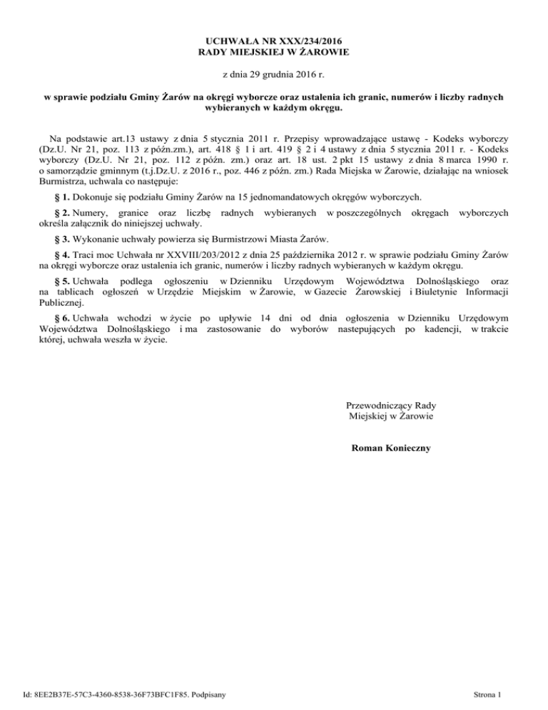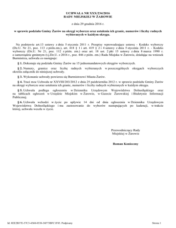 UCHWAŁA NR XXX/234/2016 RADY MIEJSKIEJ W ŻAROWIE z dnia 29 grudnia 2016 r. w sprawie podziału Gminy Żarów na okręgi wyborcze oraz ustalenia ich granic, numerów i liczby radnych wybieranych w każdym okręgu. Na podstawie art.13 ustawy z dnia 5 stycznia 2011 r. Przepisy wprowadzające ustawę - Kodeks wyborczy (Dz.U. Nr 21, poz. 113 z późn.zm.), art. 418 § 1 i art. 419 § 2 i 4 ustawy z dnia 5 stycznia 2011 r. - Kodeks wyborczy (Dz.U. Nr 21, poz. 112 z późn. zm.) oraz art. 18 ust. 2 pkt 15 ustawy z dnia 8 marca 1990 r. o samorządzie gminnym (t.j.Dz.U. z 2016 r., poz. 446 z późn. zm.) Rada Miejska w Żarowie, działając na wniosek Burmistrza, uchwala co następuje: § 1. Dokonuje się podziału Gminy Żarów na 15 jednomandatowych okręgów wyborczych. § 2. Numery, granice oraz liczbę określa załącznik do niniejszej uchwały. radnych wybieranych w poszczególnych okręgach wyborczych § 3. Wykonanie uchwały powierza się Burmistrzowi Miasta Żarów. § 4. Traci moc Uchwała nr XXVIII/203/2012 z dnia 25 października 2012 r. w sprawie podziału Gminy Żarów na okręgi wyborcze oraz ustalenia ich granic, numerów i liczby radnych wybieranych w każdym okręgu. § 5. Uchwała podlega ogłoszeniu w Dzienniku Urzędowym Województwa Dolnośląskiego oraz na tablicach ogłoszeń w Urzędzie Miejskim w Żarowie, w Gazecie Żarowskiej i Biuletynie Informacji Publicznej. § 6. Uchwała wchodzi w życie po upływie 14 dni od dnia ogłoszenia w Dzienniku Urzędowym Województwa Dolnośląskiego i ma zastosowanie do wyborów nastepujących po kadencji, w trakcie której, uchwała weszła w życie. Przewodniczący Rady Miejskiej w Żarowie Roman Konieczny Id: 8EE2B37E-57C3-4360-8538-36F73BFC1F85. Podpisany Strona 1 Załącznik do Uchwały Nr XXX/234/2016 Rady Miejskiej w Żarowie z dnia 29 grudnia 2016 r. Nr okręgu wyborczego 1 2 3 4 5 6 7 8 9 10 11 12 13 14 15 Granice okręgu wyborczego Żarów- ulice: Aleja Złotych Dębów, Armii Krajowej nr 1-11A (nieparzyste) i nr 2-12E (parzyste), Bolesława Krzywoustego, Henryka Brodatego, Henryka Pobożnego, Kazimierza Wielkiego, Księżnej Jadwigi Śląskiej, Piastowska, Spokojna Żarów- ulice: Aleja Janusza Korczaka,Górnicza, Mieszka I, Wiejska,Władysława Łokietka nr 8A - 12C (parzyste) Żarów- ulice: Bolesława Chrobrego, Władysława Łokietka nr 2A-6D (parzyste) i nr 1-15 (nieparzyste) Żarów-ulice: Akacjowa, Brzozowa, Bukowa, Dębowa, Jarzębinowa, Jaworowa, Jesienna, Jesionowa, Jodłowa, Kasztanowa, Klonowa, Kręta, Krótka, Lipowa, Modrzewiowa, Pogodna, Polna, Rybacka, Słoneczna, Świerkowa, Topolowa, Wierzbowa, Wiosenna, Wyspiańskiego Żarów-ulice: Fabryczna, Hutnicza, Kopernika, Ks. Mariana Cembrowskiego, Kwiatowa, Mickiewicza nr 1-33(nieparzyste), Plac Wolności, Przemysłowa Puszkina, Słowackiego, Słowiańska, Strefowa, Różana, Fiołkowa Żarów-ulice: Armii Krajowej nr 13-41 (nieparzyste), nr 14-40A (parzyste), Krasińskiego, Mickiewicza od nr 2 - 12 (parzyste) Żarów-ulice: 1 Maja, Armii Krajowej nr 42-62 (parzyste) i nr 43-51 (nieparzyste), Dworcowa, Generała Sikorskiego, Ogrodowa nr 4,4A, 6 (parzyste), Szkolna, Wojska Polskiego, Parkowa Żarów-ulice: Armii Krajowej nr 55-71 (nieparzyste) i nr 76-80 (parzyste), Cicha, Ogrodowa nr 8-26, Sportowa, Zamkowa Kruków, Łażany Mielęcin, Mikoszowa, Przyłęgów Mrowiny Bożanów, Wierzbna Gołaszyce, Kalno, Kalno-Wostówka,Siedlimowice Imbramowice, Pożarzysko, Tarnawa Buków, Marcinowiczki, Pyszczyn, Zastruże Id: 8EE2B37E-57C3-4360-8538-36F73BFC1F85. Podpisany Liczba radnych 1 1 1 1 1 1 1 1 1 1 1 1 1 1 1 Strona 1 Uzasadnienie Na mocy art.13 ustawy z dnia 5 stycznia 2011 r. Przepisy wprowadzające ustawę - Kodeks wyborczy (Dz.U. Nr 21, poz. 113 ze zm.) rada gminy została zobowiązana do podziału gminy na okręgi wyborcze w wyborach do rady gminy w terminie 15 miesięcy od dnia wejścia w życie ustawy - Kodeks wyborczy . tj. do dnia 1 listopada 2012 r. Zgodnie z art. 418 ustawy z dnia 5 stycznia 2011 r. Kodeks wyborczy (Dz.U. Nr 21, poz.112 ze zm.) w każdym okręgu wyborczym tworzonym dla wyboru rady w gminie niebędącej miastem na prawach powiatu wybiera się jednego radnego. Podział na okręgi wyborcze, ich granice i numery oraz liczbę radnych wybieranych w każdym okręgu ustala, na wniosek burmistrza rada gminy, według jednolitej normy przedstawicielstwa obliczonej przez podzielenie liczby mieszkańców gminy przez liczbę radnych wybieranych do danej rady z uwzględnieniem zasad okreśolonych w art. 419 cytowanej wyżej ustawy. Mając powyższe na uwadze podjęcie niniejszej uchwały jest w pełni uzasadnione. Sporządziła: Sylwia Pawlik Sekretarz Gminy Id: 8EE2B37E-57C3-4360-8538-36F73BFC1F85. Podpisany Strona 1