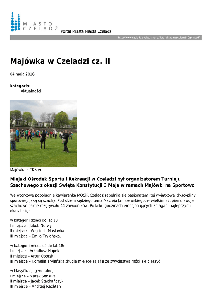 Portal Miasta Miasta Czeladź http://www.czeladz.pl/aktualnosci/lista_aktualnosci/idn:149/printpdf Majówka w Czeladzi cz. II 04 maja 2016 kategoria: Aktualności Majówka z CKS-em Miejski Ośrodek Sportu i Rekreacji w Czeladzi był organizatorem Turnieju Szachowego z okazji Święta Konstytucji 3 Maja w ramach Majówki na Sportowo We wtorkowe popołudnie kawiarenka MOSiR Czeladź zapełniła się pasjonatami tej wyjątkowej dyscypliny sportowej, jaką są szachy. Pod okiem sędziego pana Macieja Janiszewskiego, w wielkim skupieniu swoje szachowe partie rozgrywało 44 zawodników. Po kilku godzinach emocjonujących zmagań, najlepszymi okazali się: w kategorii dzieci do lat 10: I miejsce – Jakub Nerwy II miejsce – Wojciech Maślanka III miejsce – Emila Tryjańska. w kategorii młodzież do lat 18: I miejsce – Arkadiusz Hopek II miejsce – Artur Oborski III miejsce – Kornelia Tryjańska,drugie miejsce zajął a ze zwycięstwa mógł się cieszyć. w klasyfikacji generalnej: I miejsce – Marek Sensuła, II miejsce – Jacek Stachańczyk III miejsce – Andrzej Rachtan Zwycięzcy otrzymali z rąk Dyrektora MOSiR Czeladź Henryk Michalski medale i dyplomy. Zwycięzcom serdecznie gratulujemy i zapraszamy na listopadowy Turniej Szachowy. 3 maja 2016 r na stadionie im. Józefa Pawełczyka w Czeladzi odbyła się po raz kolejny „Majówka z CKS-em Czeladź”, organizowana przez Miasto Czeladź i Czeladzki Klub Sportowy „Majówkę z CKS-em” otworzył przemówieniem Burmistrz Miasta Czeladź Zbigniew Szaleniec, który spędził trochę czasu z najmłodszymi na boisku i rozmawiał z mieszkańcami Czeladzi. Mimo, że pogoda od rana była zmienna, to podczas imprezy wyjątkowo dopisała. Czeladzianie, przybyli na stadion, byli zadowoleni z przygotowanych atrakcji, wśród których znalazły się zjeżdżalnia dmuchana, Boom Bang Boom piłki dmuchane, stoiska z balonami, popcornem, sprzętem sportowym, pamiątkami klubu CKS Czeladź, stanowisko z grillem, gdzie każdy uczestnik majówki mógł zjeść coś ciepłego za darmo. Uczestnicy otrzymywali kapelusze, trąbki, łapki kibica, które cieszyły się takim powodzeniem, że bardzo szybko ich zabrakło. Atmosfera na stadionie zrobiła się niepowtarzalna. O wystartowały 14.00 konkursy i zabawy, prowadzone przez pięciu trenerów w czterech konkurencjach – „Turbo Kozak” znany z programu Canal+ , „Mistrz Prowadzenia Piłki” , „Król Karnych”, „Mistrz Slalomu”. O 16.00 odbył się cieszący się dużym zainteresowaniem, Festiwal Ciasta. Czteroosobowa komisja oceniała wygląd i smak wypieków. Zwycięzca, pani Magdalena Jankowska, otrzymała piękny puchar, a pozostali uczestnicy – pamiątkowe medale. Organizatorzy wszystkie ciasta podzielili na setki kawałków i przeznaczyli do degustacji dla uczestników majówki. Podsumowaniem tej części imprezy było wręczenie nagród wszystim uczestnikom gier i zabaw. Tegoroczną „Majówkę z CKS-em” zakończył mecz „Zarząd i przyjaciele” kontra „Rodzice/Trenerzy Szkółki CKS”. Po zaciętej meczu rywalizacji okazało się, że z wynikiem 9:8 wygrała drużyna „Zarządu i przyjaciół”. Imprezę można zaliczyć do udanych. Setki ludzi odwiedziło stadion, w ciągu dwóch godzin ponad sto osób wzięło udział w konkursach sportowych, na Festiwalu Ciasta przybyły tłumy. Organizatorzy pokazali, że dobra współpraca Miasta i CKS-u , przy niewielkich nakładach finansowych, ale dobrym pomyśle i zaangażowaniu, może dać znakomite efekty. Poniżej przedstawiamy zestawienie laureatów konkursów, odbywających się w ramach „Majówki z CKS-em”. „Turbo Kozak” zawodnicy niezrzeszeni w klubach Dziewczynki: I miejsce Maja II miejsce Martyna Podsiadło III miejsce Liliana Chłopcy: I miejsce Filip Adamczyk II miejsce Piotr Całka III miejsce Tomasz Raczek „Turbo Kozak” zawodnicy zrzeszeni w klubach I miejsce Oliwier Kubicki II miejsce Filip Maślanka III miejsce Maciej Ligęza IV miejsce Daniel Wałek V miejsce Amadeusz Sosiński „Mistrz prowadzenia piłki” I miejsce Antoni Skop II miejsce Franciszek Sidoruk III miejsce Szymon Żakiewicz Nagroda specjalna Kacper Wójcik „Król Karnych” I miejsce Bartosz Zdunek II miejsce Alan Borowski III miejsce Max Kudłaszyk Najlepszy Bramkarz Paweł Całka „Mistrz Slalomu” Kategoria wiekowa rocznik 2006 I miejsce Paweł Całka II miejsce Max Kudłaszyk III miejsce Andrzej Strzępka Kategoria wiekowa rocznik 2006-2007 I miejsce Oskar Krzemiński II miejsce Patryk Marzec III miejsce Mateusz Bartosz Kategoria wiekowa rocznik 2008 I miejsce Filip Jaros II miejsce Emil Konderak III miejsce Błażej Skop Nagrody specjalne dla dziewczynek Kingi, Nataszy, Nikoletty Podziękowania należą się wszystkim,którzy mieli swój udział w organizacji tegorocznej „Majówki w Czeladzi”. Majówka w Czeladzi cz. II 5 maj 2016 9 zdjęć Poza oficjalnymi uroczystościami, które odbyły się 3 maja w kościele św. Stanisława i na placu Konstytucji 3 Maja, mieszkańcy mieli okazję uczestniczyć także w innych ciekawych wydarzeniach. Majówka w Czeladzi cz. II Majówka w Czeladzi cz. II Majówka w Czeladzi cz. II Majówka w Czeladzi cz. II Majówka w Czeladzi cz. II Majówka w Czeladzi cz. II Majówka w Czeladzi cz. II Majówka w Czeladzi cz. II Majówka w Czeladzi cz. II