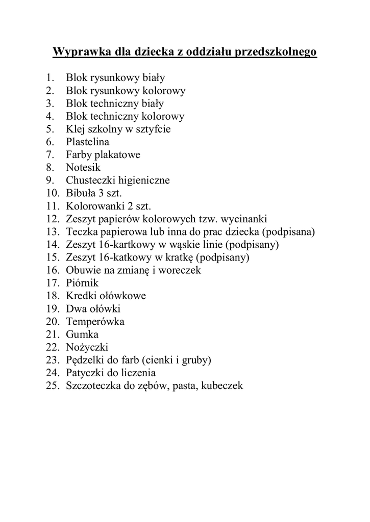 Wyprawka dla dziecka z oddziału przedszkolnego 1. 2. 3. 4. 5. 6. 7. 8. 9. 10. 11. 12. 13. 14. 15. 16. 17. 18. 19. 20. 21. 22. 23. 24. 25. Blok rysunkowy biały Blok rysunkowy kolorowy Blok techniczny biały Blok techniczny kolorowy Klej szkolny w sztyfcie Plastelina Farby plakatowe Notesik Chusteczki higieniczne Bibuła 3 szt. Kolorowanki 2 szt. Zeszyt papierów kolorowych tzw. wycinanki Teczka papierowa lub inna do prac dziecka (podpisana) Zeszyt 16-kartkowy w wąskie linie (podpisany) Zeszyt 16-katkowy w kratkę (podpisany) Obuwie na zmianę i woreczek Piórnik Kredki ołówkowe Dwa ołówki Temperówka Gumka Nożyczki Pędzelki do farb (cienki i gruby) Patyczki do liczenia Szczoteczka do zębów, pasta, kubeczek