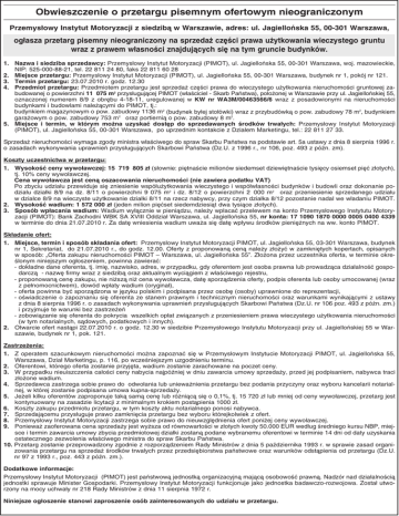 Obwieszczenie o przetargu pisemnym ofertowym nieograniczonym Przemysłowy Instytut Motoryzacji z siedzibą w Warszawie, adres: ul. Jagiellońska 55, 00-301 Warszawa, ogłasza przetarg pisemny nieograniczony na sprzedaż części prawa użytkowania wieczystego gruntu wraz z prawem własności znajdujących się na tym gruncie budynków. 1. Nazwa i siedziba sprzedawcy: Przemysłowy Instytut Motoryzacji (PIMOT), ul. Jagiellońska 55, 00-301 Warszawa, woj. mazowieckie, NIP: 525-000-88-21, tel. 22 811 24 80, faks 22 811 60 28 2. Miejsce przetargu: Przemysłowy Instytut Motoryzacji (PIMOT), ul. Jagiellońska 55, 00-301 Warszawa, budynek nr 1, pokój nr 121. 3. Termin przetargu: 23.07.2010 r. godz. 12.30 4. Przedmiot przetargu: Przedmiotem przetargu jest sprzedaż części prawa do wieczystego użytkowania nieruchomości gruntowej zabudowanej o powierzchni 11 075 m2 przysługującej PIMOT (właściciel - Skarb Państwa), położonej w Warszawie przy ul. Jagiellońskiej 55, oznaczonej numerem 8/9 z obrębu 4-18-11, uregulowanej w KW nr WA3M/00463566/6 wraz z posadowionymi na nieruchomości budynkami i budowlami należącymi do PIMOT, tj.: budynkiem magazynowym o pow. zabudowy 1136 m2 (budynek byłej stołówki) wraz z przybudówką o pow. zabudowy 78 m2, budynkiem garażowym o pow. zabudowy 753 m2ā oraz portiernią o pow. zabudowy 8 m2. 5. Miejsce i termin, w którym można uzyskać dostęp do sprzedawanych środków trwałych: Przemysłowy Instytut Motoryzacji (PIMOT), ul. Jagiellońska 55, 00-301 Warszawa, po uprzednim kontakcie z Działem Marketingu, tel.: 22 811 27 33. Sprzedaż nieruchomości wymaga zgody ministra właściwego do spraw Skarbu Państwa na podstawie art. 5a ustawy z dnia 8 sierpnia 1996 r. o zasadach wykonywania uprawnień przysługujących Skarbowi Państwa (Dz.U. z 1996 r., nr 106, poz. 493 z późn. zm). Koszty uczestnictwa w przetargu: 1. Wysokość ceny wywoławczej: 15 719 805 zł (słownie: piętnaście milionów siedemset dziewiętnaście tysięcy osiemset pięć złotych), tj. 10% ceny wywoławczej. Cena wywoławcza jest ceną oszacowania nieruchomości (nie zawiera podatku VAT) Po zbyciu udziału przewiduje się zniesienie współużytkowania wieczystego i współwłasności budynków i budowli oraz dokonanie podziału działki 8/9 na dz. 8/11 o powierzchni 9 075 m2 i dz. 8/12 o powierzchni 2 000 m2ā oraz przeniesienie sprzedanego udziału w działce 8/9 na wieczyste użytkowanie działki 8/11 na rzecz nabywcy, przy czym działka 8/12 pozostanie nadal we władaniu PIMOT. 2. Wysokość wadium: 1 572 000 zł (jeden milion pięćset siedemdziesiąt dwa tysiące złotych). 3. Sposób wpłacania wadium: Wadium wyłącznie w pieniądzu, należy wpłacać przelewem na konto Przemysłowego Instytutu Motoryzacji (PIMOT): Bank Zachodni WBK SA XVIII Oddział Warszawa, ul. Jagiellońska 55, nr konta: 17 1090 1870 0000 0005 0400 4339 w terminie do dnia 21.07.2010 r. Za datę wniesienia wadium uważa się datę wpływu środków pieniężnych na ww. konto PIMOT. Składanie ofert: 1. Miejsce, termin i sposób składania ofert: Przemysłowy Instytut Motoryzacji PIMOT, ul. Jagiellońska 55, 03-301 Warszawa, budynek nr 1, Sekretariat, do 21.07.2010 r., do godz. 12.00. Oferty z proponowaną ceną należy złożyć w zamkniętych kopertach, opisanych w sposób: „Oferta zakupu nieruchomości PIMOT – Warszawa, ul. Jagiellońska 55”. Złożona przez uczestnika oferta, w terminie określonym niniejszym ogłoszeniem, powinna zawierać: - dokładne dane oferenta, tj. imię, nazwisko, adres, w przypadku, gdy oferentem jest osoba prawna lub prowadząca działalność gospodarczą - nazwę firmy wraz z siedzibą oraz aktualnym wyciągiem z właściwego rejestru, - proponowaną cenę zakupu, nie niższą niż cena wywoławcza, datę sporządzenia oferty, podpis oferenta lub osoby umocowanej (wraz z pełnomocnictwem), dowód wpłaty wadium (oryginał), - oferta powinna być sporządzona w języku polskim i podpisana przez osobę (osoby) uprawnione do reprezentacji, - oświadczenie o zapoznaniu się oferenta ze stanem prawnym i technicznym nieruchomości oraz warunkami wynikającymi z ustawy z dnia 8 sierpnia 1996 r. o zasadach wykonywania uprawnień przysługujących Skarbowi Państwa (Dz.U. nr 106 poz. 493 z późn. zm.) i przyjmuje te warunki bez zastrzeżeń - zobowiązanie się oferenta do pokrycia wszelkich opłat związanych z przeniesieniem prawa wieczystego użytkowania nieruchomości (w tym notarialnych, sądowych, podatkowych i innych). 2. Otwarcie ofert nastąpi 22.07.2010 r. o godz. 12.30 w siedzibie Przemysłowego Instytutu Motoryzacji przy ul. Jagiellońskiej 55 w Warszawie, budynek nr 1, pok. 121. Zastrzeżenia: 1. Z operatem szacunkowym nieruchomości można zapoznać się w Przemysłowym Instytucie Motoryzacji PIMOT, ul. Jagiellońska 55, Warszawa, Dział Marketingu, p. 116, po wcześniejszym uzgodnieniu terminu. 2. Oferentowi, którego oferta zostanie przyjęta, wadium zostanie zarachowane na poczet ceny. 3. W przypadku nieuiszczenia całości ceny nabycia najpóźniej w dniu zawarcia umowy sprzedaży, przed jej podpisaniem, nabywca traci złożone wadium. 4. Sprzedawca zastrzega sobie prawo do odwołania lub unieważnienia przetargu bez podania przyczyny oraz wyboru kancelarii notarialnej, w której zostanie podpisana umowa kupna-sprzedaży. 5. Jeżeli kilku oferentów zaproponuje taką samą cenę lub różniącą się o 0,1%, tj. 15 720 zł lub mniej od ceny wywoławczej, przetarg jest kontynuowany na zasadzie licytacji z minimalnym krokiem postąpienia 1000 zł. 6. Koszty zakupu przedmiotu przetargu, w tym koszty aktu notarialnego ponosi nabywca. 7. Sprzedającemu przysługuje prawo zamknięcia przetargu bez wyboru którejkolwiek z ofert. 8. Przemysłowy Instytut Motoryzacji zastrzega sobie prawo do nieuwzględnienia ofert poniżej ceny wywoławczej. 9. Ponieważ zaoferowana cena sprzedaży jest wyższa od równowartości w złotych kwoty 50.000 EUR według średnieg