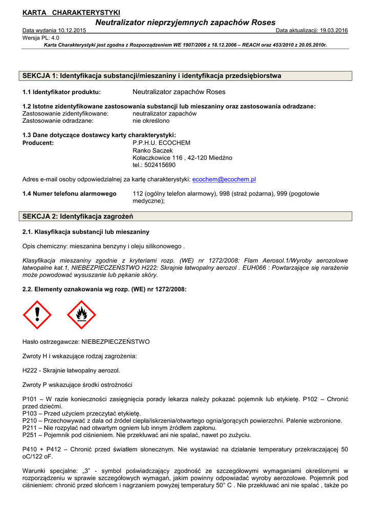 KARTA CHARAKTERYSTYKI Neutralizator nieprzyjemnych zapachów Roses Data wydania 10.12.2015 Wersja PL: 4.0 Data aktualizacji: 19.03.2016 Karta Charakterystyki jest zgodna z Rozporządzeniem WE 1907/2006 z 18.12.2006 – REACH oraz 453/2010 z 20.05.2010r. SEKCJA 1: Identyfikacja substancji/mieszaniny i identyfikacja przedsiębiorstwa 1.1 Identyfikator produktu: Neutralizator zapachów Roses 1.2 Istotne zidentyfikowane zastosowania substancji lub mieszaniny oraz zastosowania odradzane: Zastosowanie zidentyfikowane: neutralizator zapachów Zastosowanie odradzane: nie określono 1.3 Dane dotyczące dostawcy karty charakterystyki: Producent: P.P.H.U. ECOCHEM Ranko Saczek Kołaczkowice 116 , 42-120 Miedźno tel.: 502415690 Adres e-mail osoby odpowiedzialnej za kartę charakterystyki: [email protected] 1.4 Numer telefonu alarmowego 112 (ogólny telefon alarmowy), 998 (straż pożarna), 999 (pogotowie medyczne); SEKCJA 2: Identyfikacja zagrożeń 2.1. Klasyfikacja substancji lub mieszaniny Opis chemiczny: mieszanina benzyny i oleju silikonowego . Klasyfikacja mieszaniny zgodnie z kryteriami rozp. (WE) nr 1272/2008: Flam Aerosol.1/Wyroby aerozolowe łatwopalne kat.1, NIEBEZPIECZEŃSTWO H222: Skrajnie łatwopalny aerozol . EUH066 : Powtarzające się narażenie może powodować wysuszanie lub pękanie skóry. 2.2. Elementy oznakowania wg rozp. (WE) nr 1272/2008: Hasło ostrzegawcze: NIEBEZPIECZEŃSTWO Zwroty H i wskazujące rodzaj zagrożenia: H222 - Skrajnie łatwopalny aerozol. Zwroty P wskazujące środki ostrożności P101 – W razie konieczności zasięgnięcia porady lekarza należy pokazać pojemnik lub etykietę. P102 – Chronić przed dziećmi. P103 – Przed użyciem przeczytać etykietę. P210 – Przechowywać z dala od źródeł ciepła/iskrzenia/otwartego ognia/gorących powierzchni. Palenie wzbronione. P211 – Nie rozpylać nad otwartym ogniem lub innym źródłem zapłonu. P251 – Pojemnik pod ciśnieniem. Nie przekłuwać ani nie spalać, nawet po zużyciu. P410 + P412 – Chronić przed światłem słonecznym. Nie wystawiać na działanie temperatury przekraczającej 50 oC/122 oF. Warunki specjalne: „3” - symbol poświadczający zgodność ze szczegółowymi wymaganiami określonymi w rozporządzeniu w sprawie szczegółowych wymagań, jakim powinny odpowiadać wyroby aerozolowe. Pojemnik pod ciśnieniem: chronić przed słońcem i nagrzaniem powyżej temperatury 50° C . Nie przekłuwać ani nie spalać , także po KARTA CHARAKTERYSTYKI Neutralizator nieprzyjemnych zapachów Roses Data wydania 10.12.2015 Wersja PL: 4.0 Data aktualizacji: 19.03.2016 Karta Charakterystyki jest zgodna z Rozporządzeniem WE 1907/2006 z 18.12.2006 – REACH oraz 453/2010 z 20.05.2010r. zużyciu . Nie przechowywać w pobliżu źródeł zapłonu- nie palić tytoniu. Nie rozpylać nad otwartym płomieniem lub żarzącym się materiałem . Chronić przed dziećmi . 2.3. Inne zagrożenia: Brak informacji na temat spełnienia kryteriów PBT lub vPvB zgodnie z załącznikiem XIII rozporządzenia REACH. Odpowiednie badania nie były prowadzone. Pary tworzą z powietrzem mieszaniny wybuchowe. Wrażliwy na wyładowania elektrostatyczne. SEKCJA 3: Skład/informacja o składnikach Charakterystyka chemiczna: Naturalne mydło (sole sodowe i potasowe kwasów tłuszczowych). Skład: Aqua, sodium laureth sulfate, cocamidopropyl betaine, sodium chloride, cocamide DEA, lanolinę, kolagen, glyceryl oleate, -tetrasodium EDTA citrid acid, Methylisothiasolinone,Methilchloroisothiasolinone. Klasyfikacja wg Identyfikator produktu Butan CAS: 106-97-8 WE: 203-448-7 Nr indeksowy: 601-004-00-0 Zawart ość % Klasyfikacja CLP 67/548/EWG Klasa zagrożenia i kody kategorii Kody zwrotów wskazujących rodzaj zagrożenia <40 F+: R12 Flam. Gas 1 H220 Press. Gas <25 F+: R12 Flam. Gas 1 H220 Press. Gas <20 F: R12 Flam. Liq. 2 Eye Irrit. 2 H220 STOT SE 3 <10 F: R12 Flam. Liq. 2 H225 Eye Irrit. 2 H319 STOT SE 3 H336 Nr rejestracji: 01-2119474691-32-XXXX Propan CAS: 74-98-6 WE:200-827-9 Nr indeksowy: 601-003-00-5 Nr rejestracji: 01-2119486944-21-XXXX Etanol CAS: 64-17-5 WE: 200-578-6 Nr indeksowy:603-002-00-5 Alkohol izopropylowy CAS: 67-63-0 WE: 200-661-7 Nr indeksowy: 603-117-00-0 SEKCJA 4: Środki pierwszej pomocy 4.1. Opis środków pierwszej pomocy: W przypadku inhalacji-wdychania: Zapewnić dopływ świeżego powietrza, w razie dolegliwości skonsultować się z lekarzem. W przypadku kontaktu ze skórą: Natychmiast zdjąć zanieczyszczoną/nasiąkniętą odzież i buty. Zanieczyszczoną skórę umyć dokładnie wodą z mydłem lub łagodnym detergentem, a następnie spłukać dużą ilością wody. W przypadku wystąpienia i utrzymywania się objawów podrażnienia skonsultować się z lekarzem. KARTA CHARAKTERYSTYKI Neutralizator nieprzyjemnych zapachów Roses Data wydania 10.12.2015 Wersja PL: 4.0 Data aktualizacji: 19.03.2016 Karta Charakterystyki jest zgodna z Rozporządzeniem WE 1907/2006 z 18.12.2006 – REACH oraz 453/2010 z 20.05.2010r. W przypadku skażenia oczu: Zanieczyszczone oczy natychmiast płukać ciągłym strumieniem wody, usunąć szkła kontaktowe, (jeśli są) i kontynuować płukanie przez ok. 15 minut. Podczas płukania trzymać powieki szeroko rozwarte i poruszać gałką oczną. W przypadku wystąpienia i utrzymywania się objawów podrażnienia skonsultować się z lekarzem. UWAGA: Nie stosować zbyt silnego strumienia wody, aby nie uszkodzić rogówki. W przypadku połknięcia: Jamę ustną wypłukać kilkakrotnie wodą i skonsultować się z lekarzem. 4.2. Najważniejsze ostre i opóźnione objawy oraz skutki narażenia: Dodatkowe istotne informacje nie są dostępne. 4.3. Wskazania dotyczące wszelkiej natychmiastowej pomocy lekarskiej i szczególnego postępowania z poszkodowanym: Dodatkowe istotne informacje nie są dostępne. Wskazówki dla lekarza: leczenie objawowe i wspomagające. SEKCJA 5: Postępowanie w przypadku pożaru 5.1. Środki Gaśnicze Odpowiednie środki gaśnicze: Dwutlenek węg
