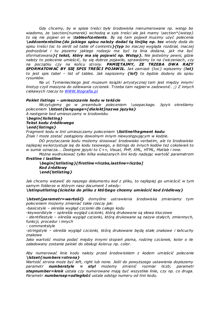 DO przytaczania kodu możemy stosować środowisko verbatim, ale to środowisko
