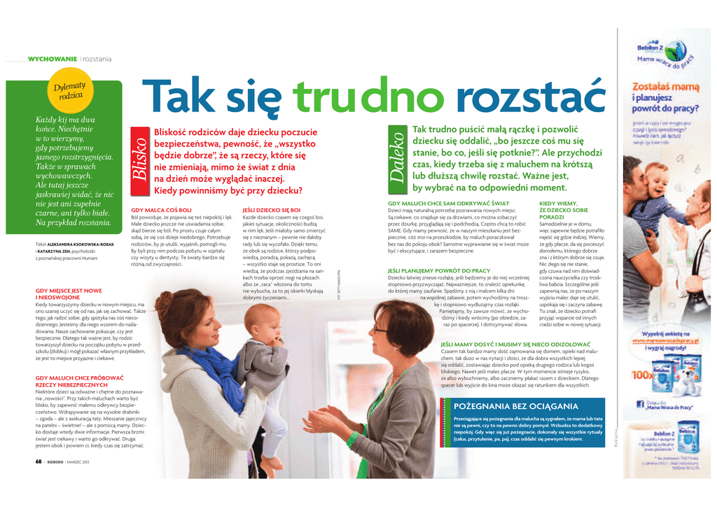 WYCHOWANIE rozstania JEŚLI DZIECKO SIĘ BOI Ból powoduje, że pojawia się też niepokój i lęk. Małe dziecko jeszcze nie uświadamia sobie, skąd bierze się ból. Po prostu czuje całym sobą, że się coś dzieje niedobrego. Potrzebuje rodziców, by je utulili, wyjaśnili, pomogli mu. By byli przy nim podczas pobytu w szpitalu czy wizyty u dentysty. Te światy bardzo się różnią od zwyczajności. Każde dziecko czasem się czegoś boi, jakieś sytuacje, okoliczności budzą w nim lęk. Jeśli miałoby samo zmierzyć się z nieznanym – pewnie nie dałoby rady lub się wycofało. Dzięki temu, że obok są rodzice, którzy podpowiedzą, poradzą, pokażą, zachęcą – wszystko staje się prostsze. To oni wiedzą, że podczas zjeżdżania na sankach trzeba oprzeć nogi na płozach albo że „raca” włożona do tortu nie wybucha, za to jej iskierki błyskają dobrymi życzeniami… Kiedy towarzyszymy dziecku w nowym miejscu, ma ono szansę uczyć się od nas, jak się zachować. Także tego, jak radzić sobie, gdy spotyka nas coś niecodziennego. Jesteśmy dla niego wzorem do naśladowania. Nasze zachowanie pokazuje, czy jest bezpiecznie. Dlatego tak ważne jest, by rodzic towarzyszył dziecku na początku pobytu w przedszkolu (żłobku) i mógł pokazać własnym przykładem, że jest to miejsce przyjazne i ciekawe. GDY MALUCH CHCE PRÓBOWAĆ RZECZY NIEBEZPIECZNYCH Niektóre dzieci są odważne i chętne do poznawania „nowości”. Przy takich maluchach warto być blisko, by zapewnić małemu odkrywcy bezpieczeństwo. Wdrapywanie się na wysokie drabinki – zgoda – ale z asekuracją taty. Mieszanie jajecznicy na patelni – świetnie! – ale z pomocą mamy. Dziecko dostaje wtedy dwie informacje. Pierwsza brzmi: świat jest ciekawy i warto go odkrywać. Druga: jestem obok i powiem ci, kiedy czas się zatrzymać. DZIECKO MARZEC 2013 Daleko GDY MALUCH CHCE SAM ODKRYWAĆ ŚWIAT GDY MALCA COŚ BOLI GDY MIEJSCE JEST NOWE I NIEOSWOJONE 68 Tak trudno puścić małą rączkę i pozwolić dziecku się oddalić, „bo jeszcze coś mu się stanie, bo co, jeśli się potknie?”. Ale przychodzi czas, kiedy trzeba się z maluchem na krótszą lub dłuższą chwilę rozstać. Ważne jest, by wybrać na to odpowiedni moment. Dzieci mają naturalną potrzebę poznawania nowych miejsc. Są ciekawe, co znajduje się za drzwiami, co można zobaczyć przez dziurkę, przyglądają się i podchodzą. Często chcą to robić SAME. Gdy mamy pewność, że w naszym mieszkaniu jest bezpiecznie, cóż stoi na przeszkodzie, by maluch poraczkował bez nas do pokoju obok? Samotne wyprawianie się w świat może być i ekscytujące, i zarazem bezpieczne. JEŚLI PLANUJEMY POWRÓT DO PRACY Dziecko łatwiej zniesie rozłąkę, jeśli będziemy je do niej wcześniej stopniowo przyzwyczajać. Najważniejsze, to znaleźć opiekunkę, do której mamy zaufanie. Spędźmy z nią i malcem kilka dni na wspólnej zabawie, potem wychodźmy na troszkę i stopniowo wydłużajmy czas rozłąki. Pamiętajmy, by zawsze mówić, że wychodzimy i kiedy wrócimy (po obiedzie, zaraz po spacerze). I dotrzymywać słowa. KIEDY WIEMY, ŻE DZIECKO SOBIE PORADZI Samodzielnie je w domu, więc zapewne będzie potrafiło najeść się gdzie indziej. Wiemy, że gdy płacze, da się pocieszyć dorosłemu, którego dobrze zna i z którym dobrze się czuje. Nic złego się nie stanie, gdy czuwa nad nim doświadczona nauczycielka czy troskliwa babcia. Szczególnie jeśli zapewnią nas, że po naszym wyjściu malec daje się utulić, uspokaja się i zaczyna zabawę. To znak, że dziecko potrafi przyjąć wsparcie od innych i radzi sobie w nowej sytuacji. JEŚLI MAMY DOSYĆ I MUSIMY SIĘ NIECO ODIZOLOWAĆ Czasem tak bardzo mamy dość zajmowania się domem, opieki nad maluchem, tak dużo w nas irytacji i złości, że dla dobra wszystkich lepiej się oddalić, zostawiając dziecko pod opieką drugiego rodzica lub kogoś bliskiego. Nawet jeśli malec płacze. W tym momencie istnieje ryzyko, że albo wybuchniemy, albo zaczniemy płakać razem z dzieckiem. Dlatego spacer lub wyjście do kina może okazać się ratunkiem dla wszystkich. POŻEGNANIA BEZ OCIĄGANIA Przeciągające się pożegnania dla malucha są sygnałem, że mama lub tata nie są pewni, czy to na pewno dobry pomysł. Wzbudza to dodatkowy niepokój. Gdy więc się już pożegnacie, dokonały się wszystkie rytuały (całus, przytulenie, pa, pa), czas oddalić się pewnym krokiem. Reklama Tekst ALEKSANDRA KSOKOWSKA-ROBAK i KATARZYNA ZEH, psycholożki z poznańskiej pracowni Humani Bliskość rodziców daje dziecku poczucie bezpieczeństwa, pewność, że „wszystko będzie dobrze”, że są rzeczy, które się nie zmieniają, mimo że świat z dnia na dzień może wyglądać inaczej. Kiedy powinniśmy być przy dziecku? FOT. GETTY IMAGES/FPM Każdy kij ma dwa końce. Niechętnie w to wierzymy, gdy potrzebujemy jasnego rozstrzygnięcia. Także w sprawach wychowawczych. Ale tutaj jeszcze jaskrawiej widać, że nic nie jest ani zupełnie czarne, ani tylko białe. Na przykład rozstania. Tak się trudno rozstać Blisko Dylematy rodzica