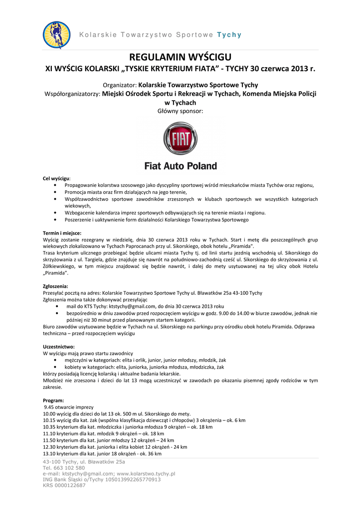 Kolarskie Towarzystwo Sportowe Tychy REGULAMIN WYŚCIGU XI WYŚCIG KOLARSKI „TYSKIE KRYTERIUM FIATA” - TYCHY 30 czerwca 2013 r. Organizator: Kolarskie Towarzystwo Sportowe Tychy Współorganizatorzy: Miejski Ośrodek Sportu i Rekreacji w Tychach, Komenda Miejska Policji w Tychach Główny sponsor: Cel wyścigu: • Propagowanie kolarstwa szosowego jako dyscypliny sportowej wśród mieszkańców miasta Tychów oraz regionu, • Promocja miasta oraz firm działających na jego terenie, • Współzawodnictwo sportowe zawodników zrzeszonych w klubach sportowych we wszystkich kategoriach wiekowych, • Wzbogacenie kalendarza imprez sportowych odbywających się na terenie miasta i regionu. • Poszerzenie i uaktywnienie form działalności Kolarskiego Towarzystwa Sportowego Termin i miejsce: Wyścig zostanie rozegrany w niedzielę, dnia 30 czerwca 2013 roku w Tychach. Start i metę dla poszczególnych grup wiekowych zlokalizowano w Tychach Paprocanach przy ul. Sikorskiego, obok hotelu „Piramida". Trasa kryterium ulicznego przebiegać będzie ulicami miasta Tychy tj. od linii startu jezdnią wschodnią ul. Sikorskiego do skrzyżowania z ul. Targiela, gdzie znajduje się nawrót na południowo-zachodnią cześć ul. Sikorskiego do skrzyżowania z ul. Żółkiewskiego, w tym miejscu znajdować się będzie nawrót, i dalej do mety usytuowanej na tej ulicy obok Hotelu „Piramida”. Zgłoszenia: Przesyłać pocztą na adres: Kolarskie Towarzystwo Sportowe Tychy ul. Bławatków 25a 43-100 Tychy Zgłoszenia można także dokonywać przesyłając • mail do KTS Tychy: [email protected], do dnia 30 czerwca 2013 roku • bezpośrednio w dniu zawodów przed rozpoczęciem wyścigu w godz. 9.00 do 14.00 w biurze zawodów, jednak nie później niż 30 minut przed planowanym startem kategorii. Biuro zawodów usytuowane będzie w Tychach na ul. Sikorskiego na parkingu przy ośrodku obok hotelu Piramida. Odprawa techniczna – przed rozpoczęciem wyścigu Uczestnictwo: W wyścigu mają prawo startu zawodnicy • mężczyźni w kategoriach: elita i orlik, junior, junior młodszy, młodzik, żak • kobiety w kategoriach: elita, juniorka, juniorka młodsza, młodziczka, żak którzy posiadają licencję kolarską i aktualne badania lekarskie. Młodzież nie zrzeszona i dzieci do lat 13 mogą uczestniczyć w zawodach po okazaniu pisemnej zgody rodziców w tym zakresie. Program: 9.45 otwarcie imprezy 10.00 wyścig dla dzieci do lat 13 ok. 500 m ul. Sikorskiego do mety. 10.15 wyścig dla kat. żak (wspólna klasyfikacja dziewcząt i chłopców) 3 okrążenia – ok. 6 km 10.35 kryterium dla kat. młodziczka i juniorka młodsza 9 okrążeń – ok. 18 km 11.10 kryterium dla kat. młodzik 9 okrążeń – ok. 18 km 11.50 kryterium dla kat. junior młodszy 12 okrążeń – 24 km 12.30 kryterium dla kat. juniorka i elita kobiet 12 okrążeń - 24 km 13.10 kryterium dla kat. junior 18 okrążeń - ok. 36 km 43-100 Tychy, ul. Bławatków 25a Tel. 663 102 580 e-mail: [email protected]; www.kolarstwo.tychy.pl ING Bank Śląski o/Tychy 105013992265770913 KRS 0000122687 Kolarskie Towarzystwo Sportowe Tychy 14.10 wyścig VIP-ów i oldboy-ów (niezrzeszeni) 6 okrążeń –ok. 12 km. 14.45 start honorowy kategorii „elita i „orlik” z terenu startu przy hotelu Piramida 30 okrążeń ok. 60 km. 17.30 Zakończenie wyścigu. • Wręczenie nagród następować będzie sukcesywnie po zakończeniu wyścigu w każdej kategorii; • W przypadku małej ilości uczestników w poszczególnych grupach organizator zastrzega sobie możliwość połączenia wyścigów w różnych kategoriach wiekowych. Nagrody Organizatorzy przewidują nagrody pieniężne wg poniższej tabeli: I II III IV V VI VII VIIIX XIXV Elita Orlik Oldboy Vip Junior 3000 1500 1000 800 600 500 300 1000 800 500 400 200 100 400 200 100 800 600 500 300 200 Junior młodszy 500 300 200 150 100 Młodzik 300 200 150 100 75 Elita kobiet 500 300 200 150 100 Juniorka 500 300 200 150 100 Juniorka młodsza 300 200 150 100 75 Młodziczka 300 200 150 100 75 Żak (ch + dz) rzeczowa rzeczowa rzeczowa 200 100 Sprawy finansowe: Organizator pokrywa koszty organizacji wyścigu. Koszty związane ze startem zawodników pokrywają macierzyste kluby. Od zawodników pobierana będzie opłata startowa, zgodnie z wytycznymi PZKol. Postanowienie końcowe: • Kryterium zostanie rozegrane wg przepisów PZKol. na trasie o całkowicie zamkniętym ruchu drogowym. • Sędziego głównego oraz Komisję Sędziowską wyznaczy PZKol. • W czasie poszczególnych wyścigów na co trzecim okrążeniu rozgrywany będzie finisz o 5, 3, 2, 1 punkty. • Klasyfikacja końcowa zostanie ustalona na podstawie zebranych punktów przez poszczególnych zawodników podczas danego wyścigu, zgodnie z przepisami PZKol. • Zawodnicy mają obowiązek startować w kaskach twardych. • Podczas kryterium pomoc techniczna będzie dozwolona z boksu. • Zabrania się prowadzenia rozgrzewki na trasie kryterium w czasie wyścigu młodszych kategorii. • Za ewentualne zaginięcie roweru lub innego sprzętu organizator nie ponosi odpowiedzialności. • Organizator wyścigu nie ponosi odpowiedzialności za zaistniałe wypadki i poniesione straty z tego tytułu. • Organizator zabezpiecza w czasie wyścigu opiekę medyczną zgodnie z przepisami PZKol. • Numery startowe winny być umocowane wg zaleceń Komisji Sędziowskiej. • Kierownicy ekip powinni dysponować aktualnym adresem Urzędu Skarbowego, adresem zamieszkania, nr PESEL i NIP swoich zawodników, co jest niezbędne do wypłacenia nagród. • Kierownicy ekip są odpowiedzialni za zapoznanie zawodników z niniejszym regulaminem, ścisłe przestrzeganie programu wyścigu i przygotowanie zawodników do dekoracji. Osoby odpowiedzialne za organizację wyścigu: Zygmunt Hanusik tel. 0663102580. Szpitale: • Wojewódzki Szpital Specjalistyczny w Tychach ul. Edukacji 102 • Szpital Miejski w Tychach ul. Cicha 27 Dojazd do linii startu i mety: Od strony Bi