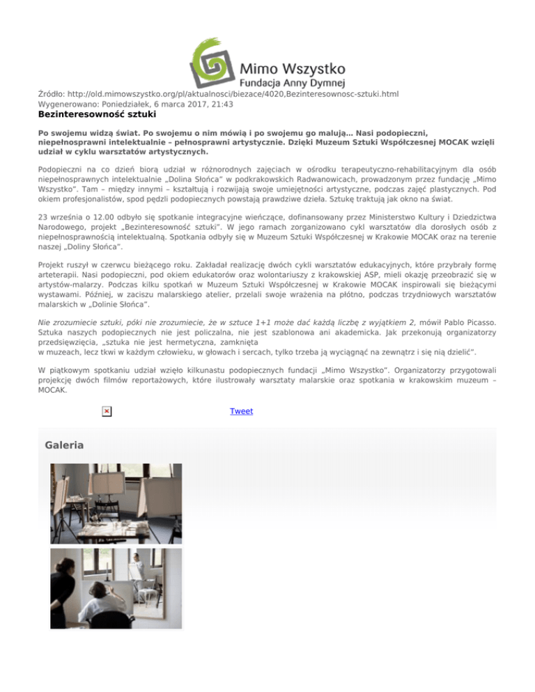 Źródło: http://old.mimowszystko.org/pl/aktualnosci/biezace/4020,Bezinteresownosc-sztuki.html Wygenerowano: Poniedziałek, 6 marca 2017, 21:43 Bezinteresowność sztuki Po swojemu widzą świat. Po swojemu o nim mówią i po swojemu go malują… Nasi podopieczni, niepełnosprawni intelektualnie – pełnosprawni artystycznie. Dzięki Muzeum Sztuki Współczesnej MOCAK wzięli udział w cyklu warsztatów artystycznych. Podopieczni na co dzień biorą udział w różnorodnych zajęciach w ośrodku terapeutyczno-rehabilitacyjnym dla osób niepełnosprawnych intelektualnie „Dolina Słońca” w podkrakowskich Radwanowicach, prowadzonym przez fundację „Mimo Wszystko”. Tam – między innymi – kształtują i rozwijają swoje umiejętności artystyczne, podczas zajęć plastycznych. Pod okiem profesjonalistów, spod pędzli podopiecznych powstają prawdziwe dzieła. Sztukę traktują jak okno na świat. 23 września o 12.00 odbyło się spotkanie integracyjne wieńczące, dofinansowany przez Ministerstwo Kultury i Dziedzictwa Narodowego, projekt „Bezinteresowność sztuki”. W jego ramach zorganizowano cykl warsztatów dla dorosłych osób z niepełnosprawnością intelektualną. Spotkania odbyły się w Muzeum Sztuki Współczesnej w Krakowie MOCAK oraz na terenie naszej „Doliny Słońca”. Projekt ruszył w czerwcu bieżącego roku. Zakładał realizację dwóch cykli warsztatów edukacyjnych, które przybrały formę arteterapii. Nasi podopieczni, pod okiem edukatorów oraz wolontariuszy z krakowskiej ASP, mieli okazję przeobrazić się w artystów-malarzy. Podczas kilku spotkań w Muzeum Sztuki Współczesnej w Krakowie MOCAK inspirowali się bieżącymi wystawami. Później, w zaciszu malarskiego atelier, przelali swoje wrażenia na płótno, podczas trzydniowych warsztatów malarskich w „Dolinie Słońca”. Nie zrozumiecie sztuki, póki nie zrozumiecie, że w sztuce 1+1 może dać każdą liczbę z wyjątkiem 2, mówił Pablo Picasso. Sztuka naszych podopiecznych nie jest policzalna, nie jest szablonowa ani akademicka. Jak przekonują organizatorzy przedsięwzięcia, „sztuka nie jest hermetyczna, zamknięta w muzeach, lecz tkwi w każdym człowieku, w głowach i sercach, tylko trzeba ją wyciągnąć na zewnątrz i się nią dzielić”. W piątkowym spotkaniu udział wzięło kilkunastu podopiecznych fundacji „Mimo Wszystko”. Organizatorzy przygotowali projekcję dwóch filmów reportażowych, które ilustrowały warsztaty malarskie oraz spotkania w krakowskim muzeum – MOCAK. Tweet Galeria Podziel się:
