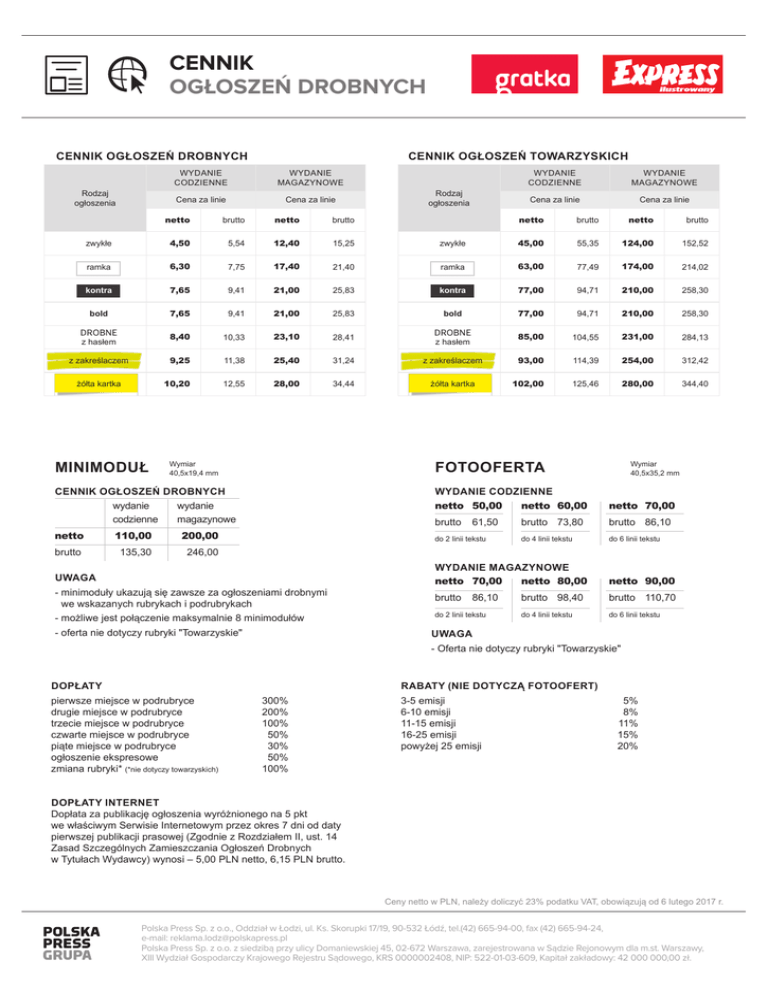 CENNIK OGŁOSZEŃ DROBNYCH CENNIK OGŁOSZEŃ DROBNYCH Rodzaj ogłoszenia CENNIK OGŁOSZEŃ TOWARZYSKICH WYDANIE CODZIENNE WYDANIE MAGAZYNOWE Cena za linie Cena za linie netto brutto netto brutto zwykłe 4,50 5,54 12,40 15,25 ramka 6,30 7,75 17,40 kontra 7,65 9,41 bold 7,65 DROBNE z hasłem z zakreślaczem żółta kartka MINIMODUŁ Cena za linie Cena za linie brutto netto brutto zwykłe 45,00 55,35 124,00 152,52 21,40 ramka 63,00 77,49 174,00 214,02 21,00 25,83 kontra 77,00 94,71 210,00 258,30 9,41 21,00 25,83 bold 77,00 94,71 210,00 258,30 8,40 10,33 23,10 28,41 DROBNE z hasłem 85,00 104,55 231,00 284,13 9,25 11,38 25,40 31,24 z zakreślaczem 93,00 114,39 254,00 312,42 10,20 12,55 28,00 34,44 żółta kartka 102,00 125,46 280,00 344,40 Wymiar 40,5x19,4 mm netto110,00200,00 135,30 WYDANIE MAGAZYNOWE netto CENNIK OGŁOSZEŃ DROBNYCH wydanie wydanie codzienne magazynowe brutto Rodzaj ogłoszenia WYDANIE CODZIENNE FOTOOFERTA Wymiar 40,5x35,2 mm WYDANIE CODZIENNE netto 50,00 netto60,00 netto70,00 brutto 61,50 brutto 73,80 brutto 86,10 do 2 linii tekstu do 4 linii tekstu do 6 linii tekstu 246,00 UWAGA -m inimoduły ukazują się zawsze za ogłoszeniami drobnymi we wskazanych rubrykach i podrubrykach -m ożliwe jest połączenie maksymalnie 8 minimodułów - oferta nie dotyczy rubryki "Towarzyskie" WYDANIE MAGAZYNOWE netto 70,00 netto80,00 netto90,00 brutto 86,10 brutto 98,40 brutto 110,70 do 2 linii tekstu do 4 linii tekstu do 6 linii tekstu UWAGA - Oferta nie dotyczy rubryki "Towarzyskie" DOPŁATY RABATY (NIE DOTYCZĄ FOTOOFERT) pierwsze miejsce w podrubryce 300% drugie miejsce w podrubryce 200% trzecie miejsce w podrubryce 100% czwarte miejsce w podrubryce 50% piąte miejsce w podrubryce 30% ogłoszenie ekspresowe 50% zmiana rubryki* (*nie dotyczy towarzyskich)100% 3-5 emisji 6-10 emisji 11-15 emisji 16-25 emisji powyżej 25 emisji 5% 8% 11% 15% 20% DOPŁATY INTERNET Dopłata za publikację ogłoszenia wyróżnionego na 5 pkt we właściwym Serwisie Internetowym przez okres 7 dni od daty pierwszej publikacji prasowej (Zgodnie z Rozdziałem II, ust. 14 Zasad Szczególnych Zamieszczania Ogłoszeń Drobnych w Tytułach Wydawcy) wynosi – 5,00 PLN netto, 6,15 PLN brutto. Ceny netto w PLN, należy doliczyć 23% podatku VAT, obowiązują od 6 lutego 2017 r. Polska Press Sp. z o.o., Oddział w Łodzi, ul. Ks. Skorupki 17/19, 90-532 Łódź, tel.(42) 665-94-00, fax (42) 665-94-24, e-mail: [email protected] Polska Press Sp. z o.o. z siedzibą przy ulicy Domaniewskiej 45, 02-672 Warszawa, zarejestrowana w Sądzie Rejonowym dla m.st. Warszawy, XIII Wydział Gospodarczy Krajowego Rejestru Sądowego, KRS 0000002408, NIP: 522-01-03-609, Kapitał zakładowy: 42 000 000,00 zł.