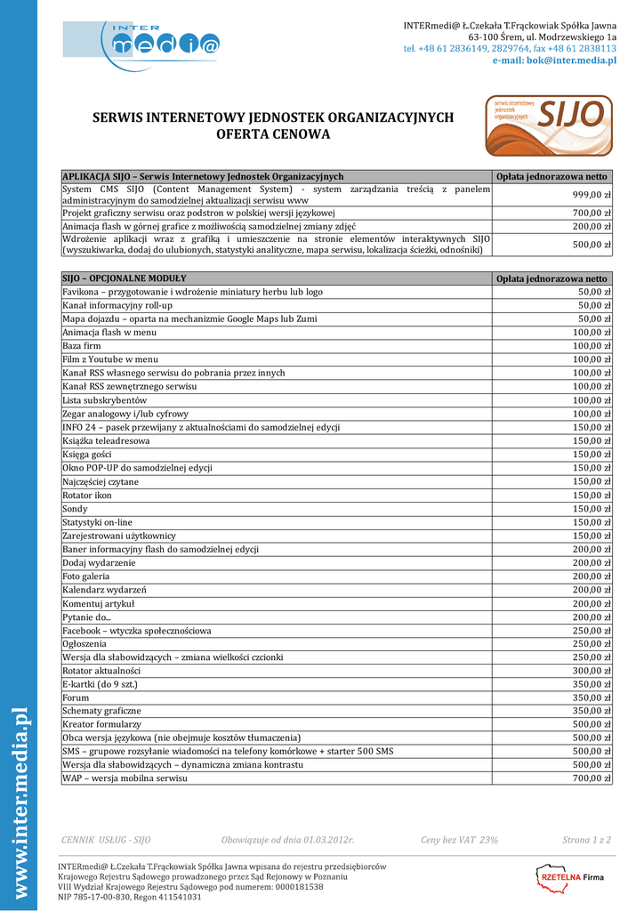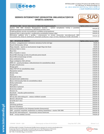 SERWIS INTERNETOWY JEDNOSTEK ORGANIZACYJNYCH OFERTA CENOWA APLIKACJA SIJO – Serwis Internetowy Jednostek Organizacyjnych Opłata jednorazowa netto System CMS SIJO (Content Management System) - system zarządzania treścią z panelem 999,00 zł administracyjnym do samodzielnej aktualizacji serwisu www Projekt graficzny serwisu oraz podstron w polskiej wersji językowej 700,00 zł Animacja flash w górnej grafice z możliwością samodzielnej zmiany zdjęć 200,00 zł Wdrożenie aplikacji wraz z grafiką i umieszczenie na stronie elementów interaktywnych SIJO 500,00 zł (wyszukiwarka, dodaj do ulubionych, statystyki analityczne, mapa serwisu, lokalizacja ścieżki, odnośniki) SIJO – OPCJONALNE MODUŁY Favikona – przygotowanie i wdrożenie miniatury herbu lub logo Kanał informacyjny roll-up Mapa dojazdu – oparta na mechanizmie Google Maps lub Zumi Animacja flash w menu Baza firm Film z Youtube w menu Kanał RSS własnego serwisu do pobrania przez innych Kanał RSS zewnętrznego serwisu Lista subskrybentów Zegar analogowy i/lub cyfrowy INFO 24 – pasek przewijany z aktualnościami do samodzielnej edycji Książka teleadresowa Księga gości Okno POP-UP do samodzielnej edycji Najczęściej czytane Rotator ikon Sondy Statystyki on-line Zarejestrowani użytkownicy Baner informacyjny flash do samodzielnej edycji Dodaj wydarzenie Foto galeria Kalendarz wydarzeń Komentuj artykuł Pytanie do... Facebook – wtyczka społecznościowa Ogłoszenia Wersja dla słabowidzących – zmiana wielkości czcionki Rotator aktualności E-kartki (do 9 szt.) Forum Schematy graficzne Kreator formularzy Obca wersja językowa (nie obejmuje kosztów tłumaczenia) SMS – grupowe rozsyłanie wiadomości na telefony komórkowe + starter 500 SMS Wersja dla słabowidzących – dynamiczna zmiana kontrastu WAP – wersja mobilna serwisu CENNIK USŁUG - SIJO Obowiązuje od dnia 01.03.2012r. Opłata jednorazowa netto 50,00 zł 50,00 zł 50,00 zł 100,00 zł 100,00 zł 100,00 zł 100,00 zł 100,00 zł 100,00 zł 100,00 zł 150,00 zł 150,00 zł 150,00 zł 150,00 zł 150,00 zł 150,00 zł 150,00 zł 150,00 zł 150,00 zł 200,00 zł 200,00 zł 200,00 zł 200,00 zł 200,00 zł 200,00 zł 250,00 zł 250,00 zł 250,00 zł 300,00 zł 350,00 zł 350,00 zł 350,00 zł 500,00 zł 500,00 zł 500,00 zł 500,00 zł 700,00 zł Ceny bez VAT 23% Strona 1 z 2 SERWIS INTERNETOWY JEDNOSTEK ORGANIZACYJNYCH OFERTA CENOWA SIJO – HOSTING Serwer MINI: przestrzeń dyskowa 5 GB; limit ruchu 10 GB/m-c, backup, nielimitowana ilość domen, kont pocztowych, kont FTP, baz danych, ulepszenia FSI Serwer STANDARD: przestrzeń dyskowa 15 GB; limit ruchu 30 GB/m-c, backup, nielimitowana ilość domen, kont pocztowych, kont FTP, baz danych, ulepszenia FSI Serwer MIDI: przestrzeń dyskowa 25 GB; limit ruchu 50 GB/m-c, backup, nielimitowana ilość domen, kont pocztowych, kont FTP, baz danych, ulepszenia FSI Serwer MAXI: przestrzeń dyskowa 50 GB; limit ruchu 100 GB/m-c, backup, nielimitowana ilość domen, kont pocztowych, kont FTP, baz danych, ulepszenia FSI Dodatkowy transfer: po przekroczeniu limitu ruchu – za 1 GB Dodatkowa przestrzeń dyskowa: po przekroczeniu limitu – za 500 MB Forma płatności abonament roczny Cena netto 100,00 zł abonament roczny 200,00 zł abonament roczny 350,00 zł abonament roczny 500,00 zł miesięcznie po przekroczeniu 5,00 zł 5,00 zł SIJO – DODATKOWE USŁUGI Aktualizacje SIJO: jedna dziennie w aplikacji na podstawie otrzymanych materiałów w formie elektronicznej, bez naruszenia struktury serwisu, w terminie jednego dnia roboczego Aktualizacja jednorazowa: jedna dziennie w aplikacji na podstawie otrzymanych materiałów w formie elektronicznej, bez naruszenia struktury serwisu, w terminie jednego dnia roboczego Przeniesienie danych z istniejącej strony www – informacje stałe (położenie, historia, itp.) oraz informacje typu aktualności (komunikaty, przetargi, itp.) za każde 12 m-cy – zakres określony na podstawie indywidualnej weryfikacji Kamera internetowa – wdrożenie kompleksowe Sklep internetowy Muzyka na stronie Dźwięki specjalne klawiszy Wykonanie schematu graficznego serwisu Zakup zdjęcia z bazy iStock Skanowanie zdjęć z odbitek lub negatywu Obróbka graficzna zdjęć Wykonanie zdjęć u klienta (plus koszty dojazdu) Rejestracja w wyszukiwarkach google.pl, interia.pl. onet.pl, wp.pl Uruchomienie kampanii AdWords w wyszukiwarce google.pl Wykonanie banera animowanego SWF lub GIF Wykonanie banera statycznego PNG lub JPG Tłumaczenie na język angielski lub niemiecki przez tłumacza przysięgłego Instrukcja obsługi aplikacji CMS SIJO – wersja drukowana stat24 – statystyki oglądalności i mapa kliknięć IVONA WebReader – mówiąca strona internetowa Szkolenie w siedzibie INTERmedi@ dla nowych Klientów (2 osoby, do 2 godz.) Forma płatności SIJO – REJESTRACJA I PRZEDŁUŻENIE DOMEN Rejestracja nowej domeny krajowej, światowej i europejskiej krajowa.pl – przedłużenie krajowa.com.pl | światowa.com | europejska.eu – przedłużenie CENNIK USŁUG - SIJO Obowiązuje od dnia 01.03.2012r. Cena netto abonament roczny 1 200,00 zł opłata jednorazowa naliczana miesięcznie 30,00 zł opłata jednorazowa od 600,00 zł opłata jednorazowa opłata jednorazowa opłata jednorazowa opłata jednorazowa opłata za szt. opłata za szt. opłata za szt. opłata za szt. opłata za szt. opłata jednorazowa opłata jednorazowa opłata jednorazowa opłata jednorazowa 1800 znaków/strona opłata jednorazowa - od 2500,00 zł od 999,00 zł 400,00 zł 100,00 zł od 200,00 zł od 50,00 zł od 10,00 zł od 20,00 zł od 10,00 zł 250,00 zł 100,00 zł 100,00 zł 50,00 zł 45,00 zł 32,00 zł ZAPYTAJ ZAPYTAJ GRATIS Forma płatności opłata jednorazowa abonament roczny abonament roczny Ceny bez VAT 23% Cena netto 1,00 zł 100,00 zł 80,00 zł Strona 2 z 2