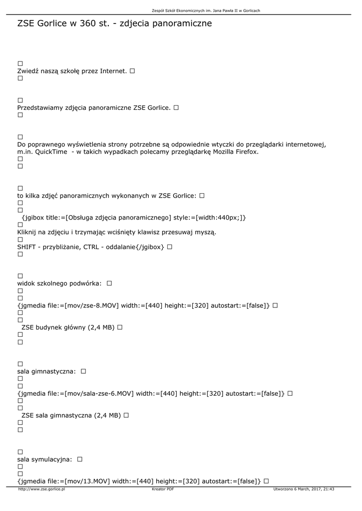 Zwiedź naszą szkołę przez Internet. Przedstawiamy zdjęcia panoramiczne ZSE Gorlice. Do poprawnego wyświetlenia strony potrzebne są odpowiednie wtyczki do przeglądarki internetowej,