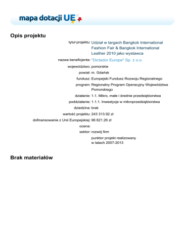 Opis projektu tytuł projektu: Udział w targach Bangkok International Fashion Fair & Bangkok International Leather 2010 jako wystawca nazwa beneficjenta: "Dictador Europe" Sp. z o.o. województwo: pomorskie powiat: m. Gdańsk fundusz: Europejski Fundusz Rozwoju Regionalnego program: Regionalny Program Operacyjny Województwa Pomorskiego działanie: 1.1. Mikro, małe i średnie przedsiębiorstwa poddziałanie: 1.1.1. Inwestycje w mikroprzedsiębiorstwa dziedzina: brak wartość projektu: 243 313.92 zł dofinansowanie z Unii Europejskiej: 96 621.26 zł ocena: sektor: rozwój firm punktor projekt realizowany w latach 2007-2013 Brak materiałów