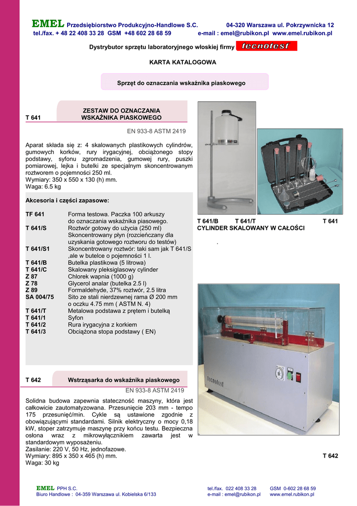 EMEL Przedsiębiorstwo Produkcyjno-Handlowe S.C. tel./fax. + 48 22 408 33 28 GSM +48 602 28 68 59 04-320 Warszawa ul. Pokrzywnicka 12 e-mail : [email protected] www.emel.rubikon.pl Dystrybutor sprzętu laboratoryjnego włoskiej firmy KARTA KATALOGOWA Sprzęt do oznaczania wskaźnika piaskowego T 641 ZESTAW DO OZNACZANIA WSKAŹNIKA PIASKOWEGO EN 933-8 ASTM 2419 Aparat składa się z: 4 skalowanych plastikowych cylindrów, gumowych korków, rury irygacyjnej, obciążonego stopy podstawy, syfonu zgromadzenia, gumowej rury, puszki pomiarowej, lejka i butelki ze specjalnym skoncentrowanym roztworem o pojemności 250 ml. Wymiary: 350 x 550 x 130 (h) mm. Waga: 6.5 kg Akcesoria i części zapasowe: TF 641 T 641/T T 641/1 T 641/2 T 641/3 Forma testowa. Paczka 100 arkuszy do oznaczania wskaźnika piasowego. T 641/B T 641/T Roztwór gotowy do użycia (250 ml) CYLINDER SKALOWANY W CAŁOŚCI Skoncentrowany płyn (rozcieńczany dla uzyskania gotowego roztworu do testów) . Skoncentrowany roztwór: taki sam jak T 641/S ,ale w butelce o pojemności 1 l. Butelka plastikowa (5 litrowa) Skalowany pleksiglasowy cylinder Chlorek wapnia (1000 g) Glycerol analar (butelka 2.5 l) Formaldehyde, 37% roztwór, 2.5 litra Sito ze stali nierdzewnej rama Ø 200 mm o oczku 4.75 mm ( ASTM N. 4) Metalowa podstawa z prętem i butelką Syfon Rura irygacyjna z korkiem Obciążona stopa podstawy ( EN) T 642 Wstrząsarka do wskaźnika piaskowego T 641/S T 641/S1 T 641/B T 641/C Z 87 Z 78 Z 89 SA 004/75 T 641 EN 933-8 ASTM 2419 Solidna budowa zapewnia stateczność maszyny, która jest całkowicie zautomatyzowana. Przesunięcie 203 mm - tempo 175 przesunięć/min. Cykle są ustawione zgodnie z obowiązującymi standardami. Silnik elektryczny o mocy 0,18 kW, stoper zatrzymuje maszynę przy końcu testu. Bezpieczna osłona wraz z mikrowyłącznikiem zawarta jest w standardowym wyposażeniu. Zasilanie: 220 V, 50 Hz, jednofazowe. Wymiary: 895 x 350 x 465 (h) mm. Waga: 30 kg EMEL PPH S.C. Biuro Handlowe : 04-359 Warszawa ul. Kobielska 6/133 T 642 tel./fax. 022 408 33 28 e-mail : [email protected] GSM 0-602 28 68 59 www.emel.rubikon.pl
