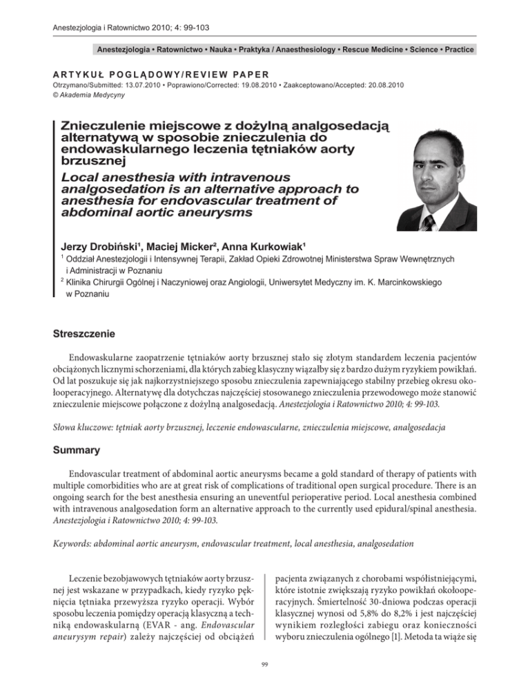 99 Anestezjologia i Ratownictwo 2010; 4: 99-103 Anestezjologia • Ratownictwo • Nauka • Praktyka / Anaesthesiology • Rescue Medicine • Science • Practice A R T Y K U Ł P O G L Ą D O W Y / R E V I E W PA P E R Otrzymano/Submitted: 13.07.2010 • Poprawiono/Corrected: 19.08.2010 • Zaakceptowano/Accepted: 20.08.2010 © Akademia Medycyny Znieczulenie miejscowe z dożylną analgosedacją alternatywą w sposobie znieczulenia do endowaskularnego leczenia tętniaków aorty brzusznej Local anesthesia with intravenous analgosedation is an alternative approach to anesthesia for endovascular treatment of abdominal aortic aneurysms Jerzy Drobiński¹, Maciej Micker², Anna Kurkowiak¹ Oddział Anestezjologii i Intensywnej Terapii, Zakład Opieki Zdrowotnej Ministerstwa Spraw Wewnętrznych i Administracji w Poznaniu 2 Klinika Chirurgii Ogólnej i Naczyniowej oraz Angiologii, Uniwersytet Medyczny im. K. Marcinkowskiego w Poznaniu 1 Streszczenie Endowaskularne zaopatrzenie tętniaków aorty brzusznej stało się złotym standardem leczenia pacjentów obciążonych licznymi schorzeniami, dla których zabieg klasyczny wiązałby się z bardzo dużym ryzykiem powikłań. Od lat poszukuje się jak najkorzystniejszego sposobu znieczulenia zapewniającego stabilny przebieg okresu okołooperacyjnego. Alternatywę dla dotychczas najczęściej stosowanego znieczulenia przewodowego może stanowić znieczulenie miejscowe połączone z dożylną analgosedacją. Anestezjologia i Ratownictwo 2010; 4: 99-103. Słowa kluczowe: tętniak aorty brzusznej, leczenie endowascularne, znieczulenia miejscowe, analgosedacja Summary Endovascular treatment of abdominal aortic aneurysms became a gold standard of therapy of patients with multiple comorbidities who are at great risk of complications of traditional open surgical procedure. There is an ongoing search for the best anesthesia ensuring an uneventful perioperative period. Local anesthesia combined with intravenous analgosedation form an alternative approach to the currently used epidural/spinal anesthesia. Anestezjologia i Ratownictwo 2010; 4: 99-103. Keywords: abdominal aortic aneurysm, endovascular treatment, local anesthesia, analgosedation Leczenie bezobjawowych tętniaków aorty brzusznej jest wskazane w przypadkach, kiedy ryzyko pęknięcia tętniaka przewyższa ryzyko operacji. Wybór sposobu leczenia pomiędzy operacją klasyczną a techniką endowaskularną (EVAR - ang. Endovascular aneurysym repair) zależy najczęściej od obciążeń pacjenta związanych z chorobami współistniejącymi, które istotnie zwiększają ryzyko powikłań okołooperacyjnych. Śmiertelność 30-dniowa podczas operacji klasycznej wynosi od 5,8% do 8,2% i jest najczęściej wynikiem rozległości zabiegu oraz konieczności wyboru znieczulenia ogólnego [1]. Metoda ta wiąże się 99 Anestezjologia i Ratownictwo 2010; 4: 99-103 Anestezjologia • Ratownictwo • Nauka • Praktyka / Anaesthesiology • Rescue Medicine • Science • Practice z możliwością poważnych powikłań pooperacyjnych, takich jak niewydolność krążeniowo-oddechowa, niewydolność nerek, co może wydłużać okres hospitalizacji. Wprowadzenie technik edowaskularnych leczenia tętniaków aorty brzusznej zmniejszyło w znaczącym odsetku ryzyko tych powikłań a także śmiertelność okołooperacyjną. Sprawą otwartą pozostaje jednak możliwość większej ilości powikłań odległych w przypadku zastosowania stent-graftów. skutkować koniecznością zastosowania dodatkowych procedur operacyjnych umożliwiających implantację protezy, takich jak angioplastyka, stentowanie lub operacyjne udrożnienie tętnic. Pomimo wprowadzenia endowaskularnych technik zaopatrywania bezobjawowych tętniaków aorty brzusznej nadal otwartą kwestią pozostaje sposób znieczulenia [2]. Najrzadziej obecnie wykonywanym rodzajem znieczulenia zabiegów endowaskularnych na aorcie jest znieczulenie ogólne. Pacjenci kwalifikowani do tego typu zabiegów bardzo często obciążeni są licznymi schorzeniami o znacznym zaawansowaniu, które istotnie zwiększają ryzyko powikłań. Zaliczyć tu należy uogólnioną miażdżycę, chorobę niedokrwienną serca, niewydolność serca II i III stopnia wg NYHA, nadciśnienie tętnicze, cukrzycę, przewlekłe choroby płuc (w tym przewlekła obturacyjna choroba płuc), choroby nerek, schorzenia neurologiczne wynikające z niewydolności naczyń mózgowych. Znieczulenie ogólne może doprowadzić do znacznej destabilizacji funkcji układów a tym samym powikłań pooperacyjnych. Z drugiej strony istnieje ryzyko przedłużonej wentylacji mechanicznej obarczonej ryzykiem powikłań infekcyjnych. Dlatego też ten typ znieczulenia jest obecnie wykonywany w sporadycznych sytuacjach, jedynie z bezwzględnych wskazań życiowych [3]. Znieczulenie przewodowe stanowi dobrą alternatywę w tego typu zabiegach. Najkorzystniejsze wydaje się znieczulenie zewnątrzoponowe ciągłe z powodu stosunkowo łagodnego wpływu na funkcję układu krążenia i oddechowego. Jednocześnie znieczulenie to może być wykorzystywane w okresie pooperacyjnym jako metoda leczenia bólu. Warunkiem jego wykonania jest akceptacja przez pacjenta, brak istotnych zaburzeń w układzie krzepnięcia, odpowiednie warunki anatomiczne i możliwości techniczne oraz zachowanie odpowiednich odstępów od podania środków przeciwzakrzepowych. Założenie cewnika do przestrzeni zewnątrzoponowej musi być wykonane minimum 4 godziny przed podażą heparyny dożylnie. Najkorzystniejszym sposobem wydaje się przygotowanie takiego pacjenta w godzinach wieczornych w dniu poprzedzającym zabieg [4]. Coraz częstszym znieczuleniem chorego, u którego wykonywany jest zabieg implantacji stent-graftu jest wykonywanie przez chirurga znieczulenia miejscowego oraz podawanie leków analgetycznych i sedacyjnych drogą dożylną przez anestezjologa. W wielu publikacjach medycznych wykazano, iż znie- Rycina 1. Tętniak aorty brzusznej 
