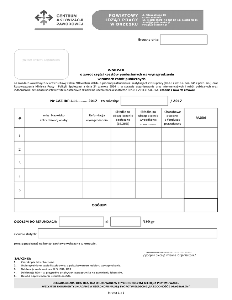 Brzesko dnia: pieczęć firmowa Organizatora WNIOSEK o zwrot części kosztów poniesionych na wynagrodzenie w ramach robót publicznych na zasadach określonych w art.57 ustawy z dnia 20 kwietnia 2004r. o promocji zatrudnienia i instytucjach rynku pracy (Dz. U. z 2016 r. poz. 645 z późn. zm.) oraz Rozporządzenia Ministra Pracy i Polityki Społecznej z dnia 24 czerwca 2014 r. w sprawie organizowania prac interwencyjnych i robót publicznych oraz jednorazowej refundacji kosztów z tytułu opłaconych składek na ubezpieczenia społeczne (Dz.U. z 2014 r. poz. 864) zgodnie z zawartą umową: Nr CAZ.IRP.611......... 2017 za miesiąc Lp. Imię i Nazwisko zatrudnionej osoby Składka na ubezpieczenie społeczne (16,26%) Refundacja wynagrodzenia / 2017 Składka na ubezpieczenie wypadkowe …................ Chorobowe płacone z funduszu pracodawcy RAZEM 1 2 3 4 5 OGÓŁEM OGÓŁEM DO REFUNDACJI: zł /100 gr słownie złotych: proszę przekazać na konto bankowe wskazane w umowie. ............................................... ZAŁĄCZNIKI: 1. Kserokopia listy obecności. 2. Uwierzytelnione kopie list płac wraz z pokwitowaniem odbioru wynagrodzenia. 3. Deklaracja rozliczeniowa ZUS: DRA, RCA. 4. Deklaracja RSA – w przypadku przebywania pracownika na zwolnieniu lekarskim. 5. Dowód odprowadzenia składek do ZUS. / podpis i pieczęć imienna Organizatora / DEKLARACJE ZUS: DRA, RCA, RSA DRUKOWANE W TRYBIE ROBOCZYM NIE BĘDĄ PRZYJMOWANE. WSZYSTKIE DOKUMENTY SKŁADANE W KSEROKOPII MUSZĄ BYĆ POTWIERDZONE „ZA ZGODNOŚĆ Z ORYGINAŁEM” Strona 1 z 1