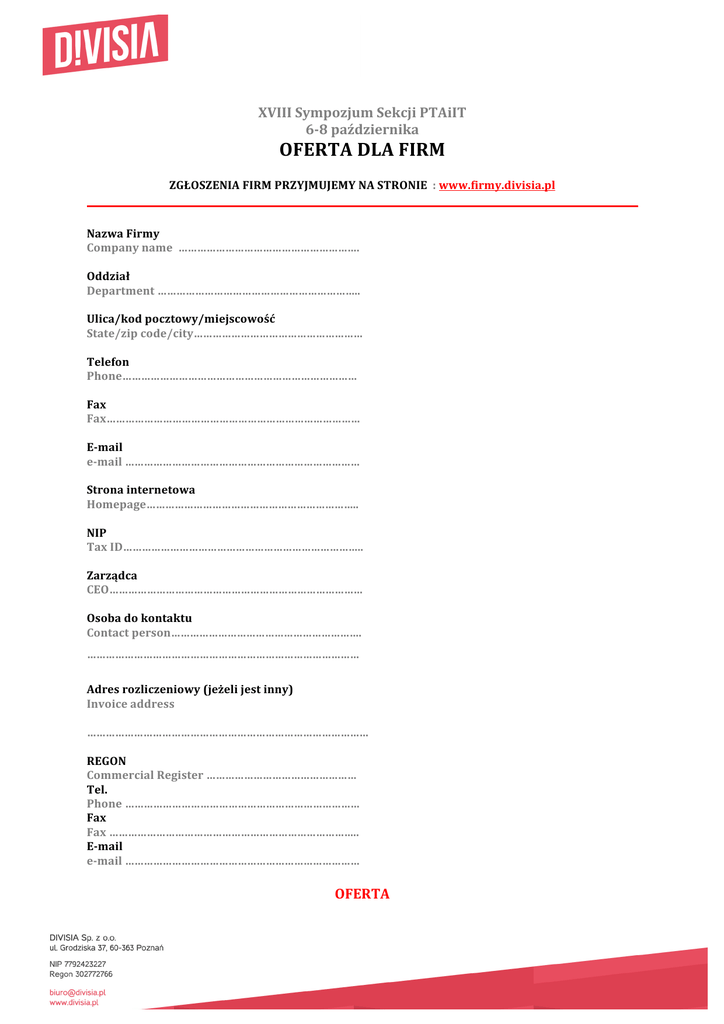 XVIIISympozjumSekcjiPTAiIT 6-8października OFERTADLAFIRM ZGŁOSZENIAFIRMPRZYJMUJEMYNASTRONIE:www.firmy.divisia.pl NazwaFirmy Companyname…………………………………………………. Oddział Department……………………………………………………….. Ulica/kodpocztowy/miejscowość State/zipcode/city……………………………………………… Telefon Phone………………………………………………………………… Fax Fax……………………………………………………………………… E-mail e-mail………………………………………………………………… Stronainternetowa Homepage………………………………………………………….. NIP TaxID………………………………………………………………….. Zarządca CEO……………………………………………………………………… Osobadokontaktu Contactperson……………………………………………………. …………………………………………………………………………… Adresrozliczeniowy(jeżelijestinny) Invoiceaddress ……………………………………………………………………………… REGON CommercialRegister………………………………………… Tel. Phone………………………………………………………………… Fax Fax…………………………………………………………………….. E-mail e-mail………………………………………………………………… OFERTA Sponsor10.000PLNnetto Ø TytułSponsora Ø 10m²stoiskowystawienniczewyposażonewstół,2krzesła,przyłączedoprądu 230V. Ø 3identyfikatorydlaprzedstawicielifirmy.Identyfikatoryobejmująposiłkiw trakcietrwaniakonferencji:obiadiprzerwękawową. Ø 3zaproszenianaimprezętowarzyszącą. Ø Umieszczeniemateriałówreklamowychwteczkachdlauczestników. Ø Umieszczeniereklamywolnostojącejroll-uppozaterenemstoiska. Ø Logotypfirmyumieszczonynastronieinternetowejkonferencji. Ø Jedenzestawmateriałówkonferencyjnych. Wystawca4.000PLNnetto Ø 4m²powierzchniwystawienniczejwyposażonejw1stół,2krzesła, przyłącze230V. Ø 2identyfikatorydlaprzedstawicielifirmy.Identyfikatoryobejmująposiłkiw trakcietrwaniakonferencjiobiadiprzerwękawową. Ø 2zaproszenianaimprezętowarzyszą. Ø Logotypnastronieinternetowejkonferencji. Dodatkoweopcje Ø Dodatkowapowierzchniawystawienniczawm2doliczonadostoiska standardowego1000PLN*/zakażdym² (uwaga:stoiskowyposażonejesttakjakstoiskostandardowe) Ø Dodatkowyidentyfikatordlaprzedstawiciela 500PLNnetto (obejmujeposiłkiwtrakciekonferencjiorazimprezętowarzyszącą) Ø Umieszczeniemateriałówreklamowychwteczkachkonferencyjnych 1.500PLNnetto Ø Umieszczeniereklamywolnostojącejroll-uppozaterenemstoiska 1.500PLNnetto Ø Reklamanamonitorachmultimedialnych (przygotowanazgodniezwytycznymiOrganizatora) 2.000PLNnetto Ø Sponsorowanieprzerwykawowejdlauczestników stacjezkawązostanąoznaczonePaństwalogotypamiispecjalnymi podziękowaniami 3.000PLNnetto Ø Sponsorowaniedystrybutorówzwodądlauczestników stacjezwodą(kubeczkiorazbaniaki)będą oznaczonePaństwalogotypemorazspecjalnymipodziękowaniami 1.500PLNnetto Dowszystkichpodanychcennależydoliczyć23%VAT. Wpłatynależykierowaćnaponiższedane mBank:44114020040000350275232364 DivisiaSp.zo.o.,ul.Grodziska37,60-363Poznań ZGŁOSZENIAFIRMPRZYJMUJEMYNASTRONIE:www.firmy.divisia.pl Terminnadsyłaniazgłoszeńupływazdniem15września2016r. Zapraszamdokontaktu: AnnaSoboń tel.781-555-551 [email protected]